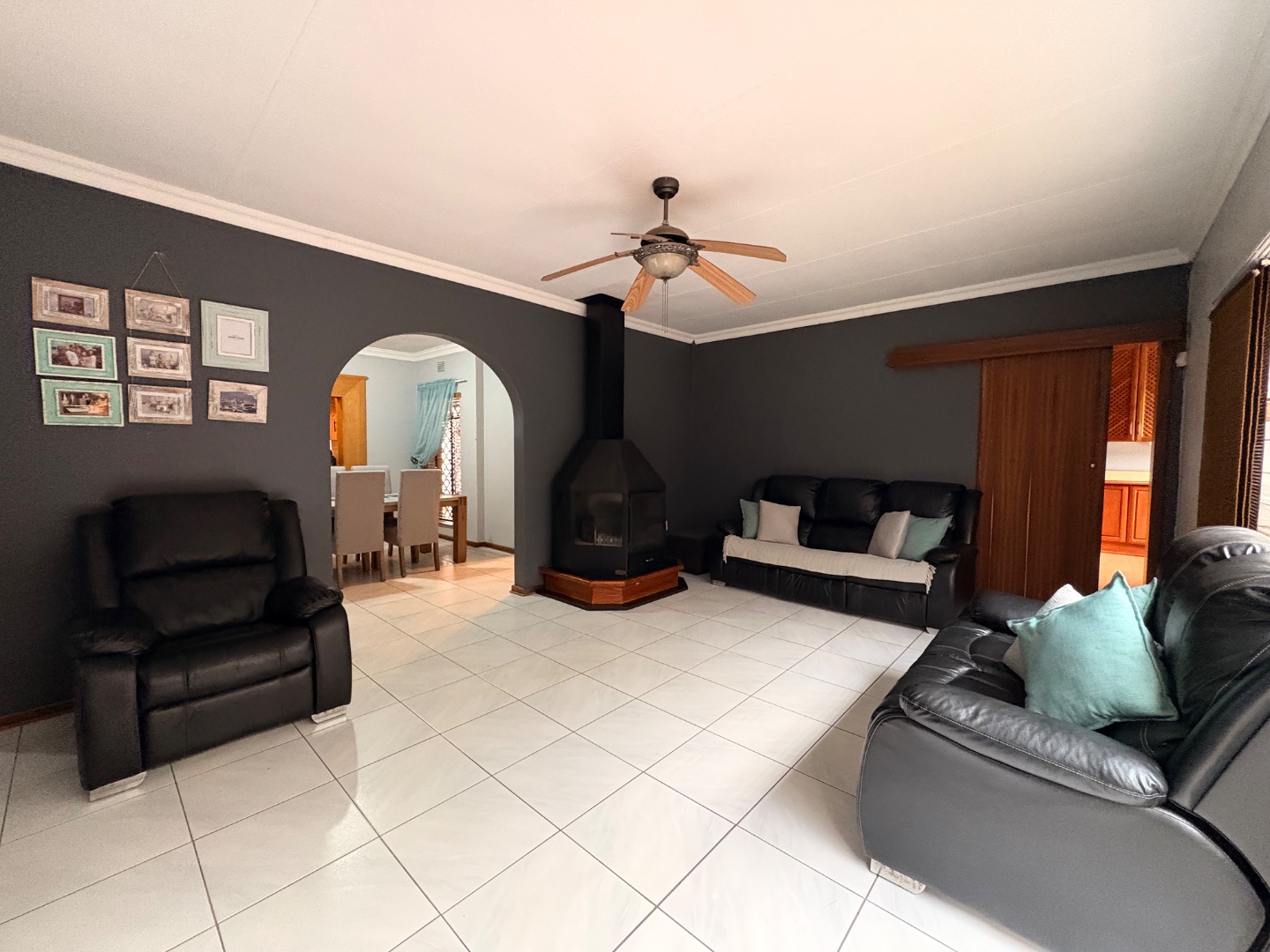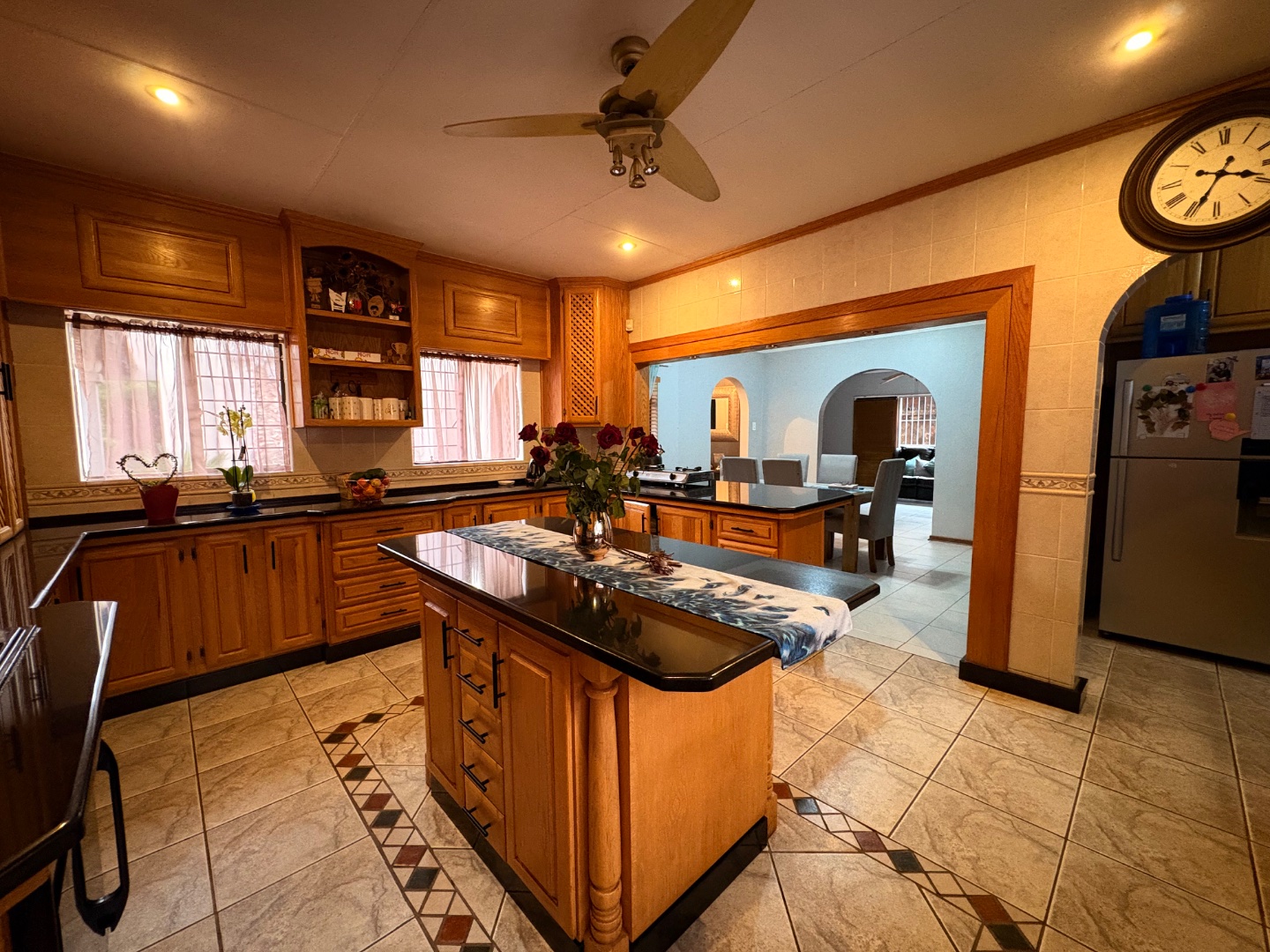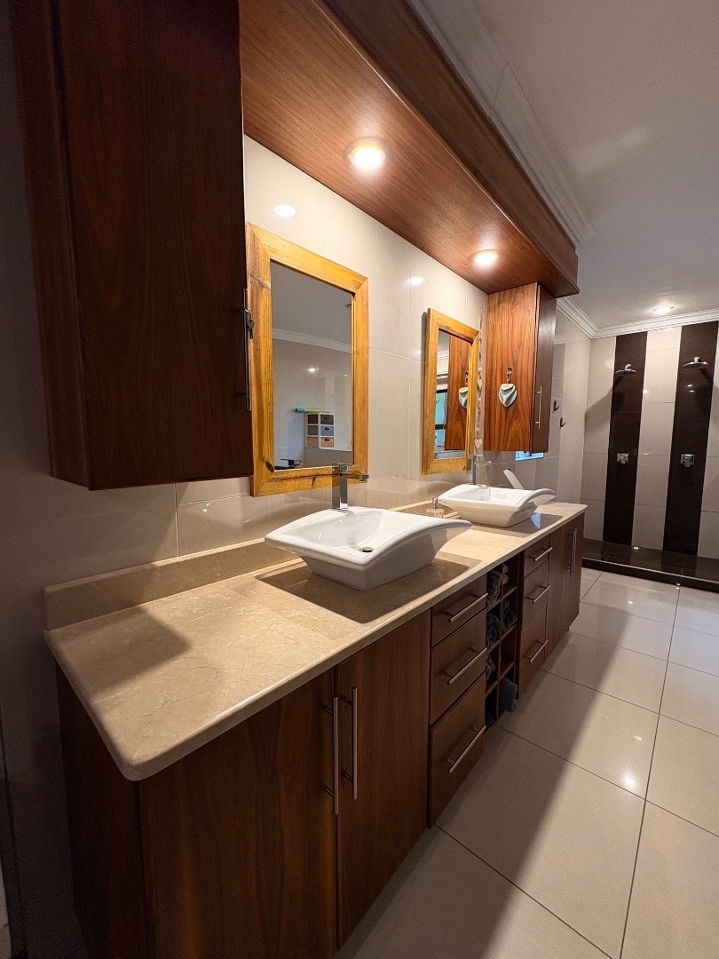 With multiple living spaces including a lounge, dining room, and a cozy family room with a fireplace, there's space for the whole family to enjoy. The modern kitchen is fitted with granite countertops, plenty of cupboards, and a separate scullery.