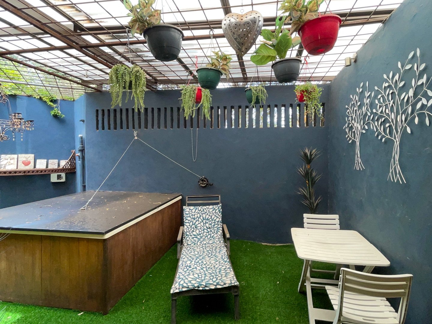The entertainment area overlooks a stunning swimming pool (newly redone with separate toilet amenities) which is the heart of the outdoor space. The pool is surrounded by a landscaped courtyard and garden, where lush greenery and vibrant flowers create a serene atmosphere. A shade net covers the pool, providing respite from the sun on hot summer days, making it perfect for relaxing or enjoying a refreshing swim.
