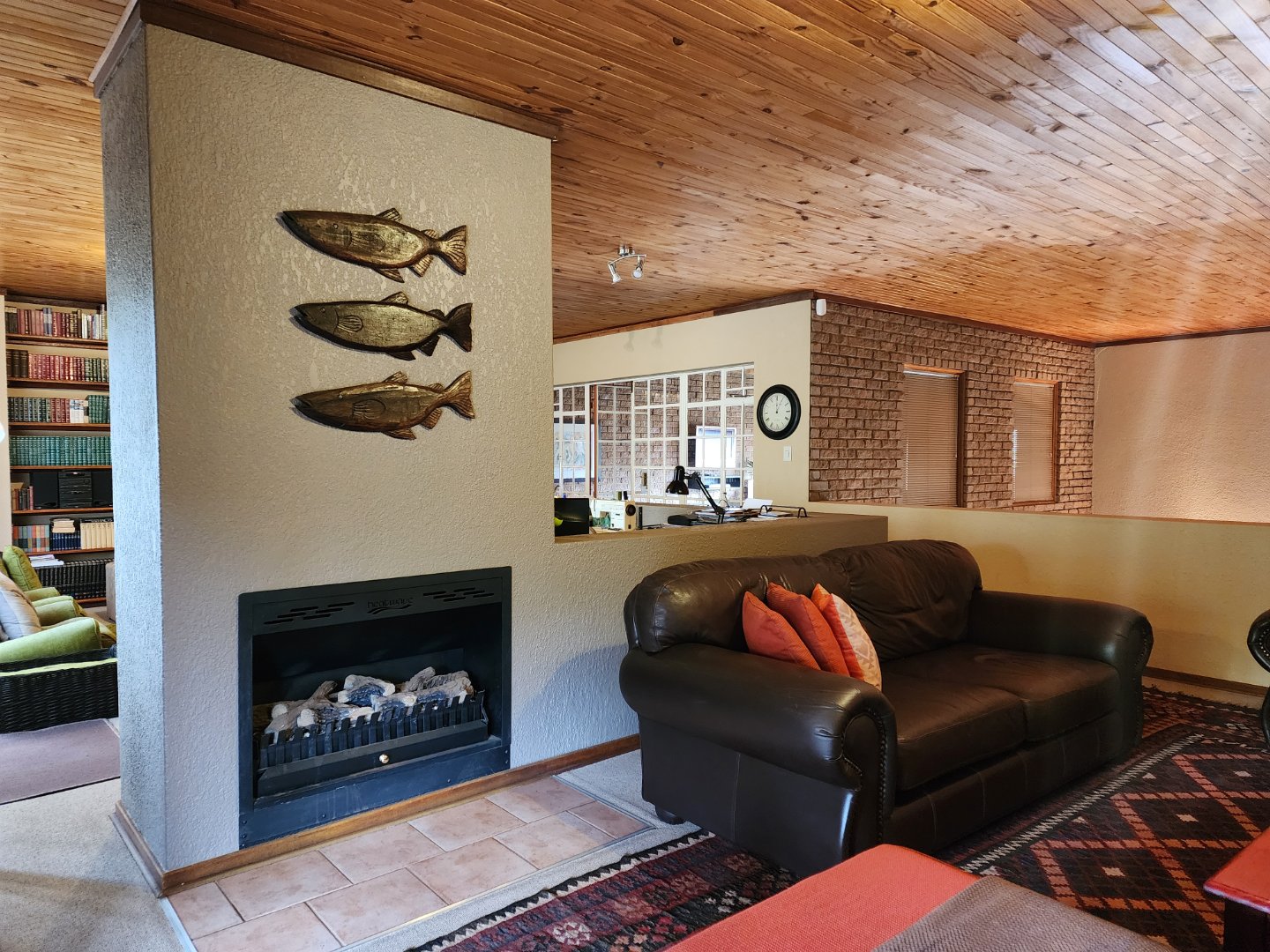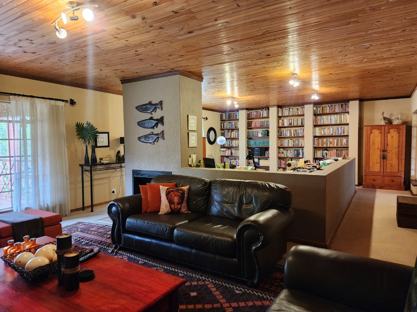 -Upstairs open-plan family room with office/hobby space, a bookshelf wall, and two covered patios overlooking different parts of the property.
