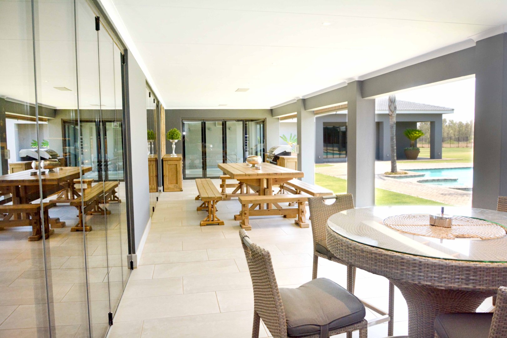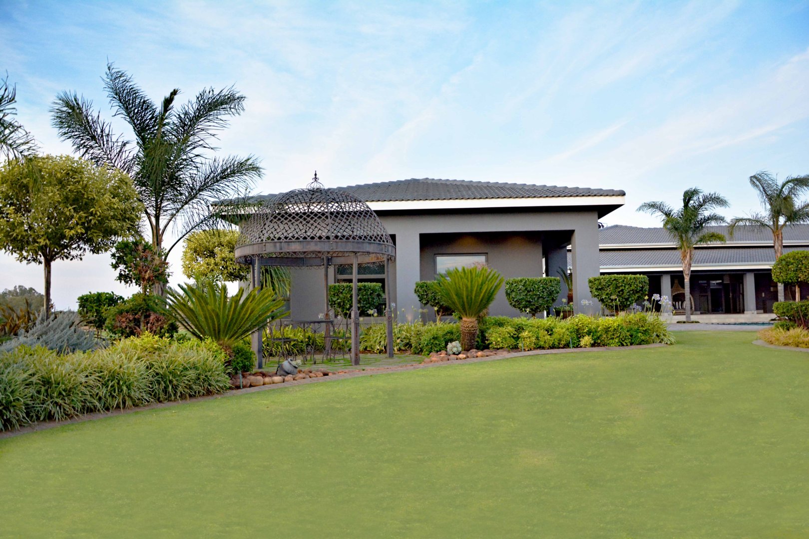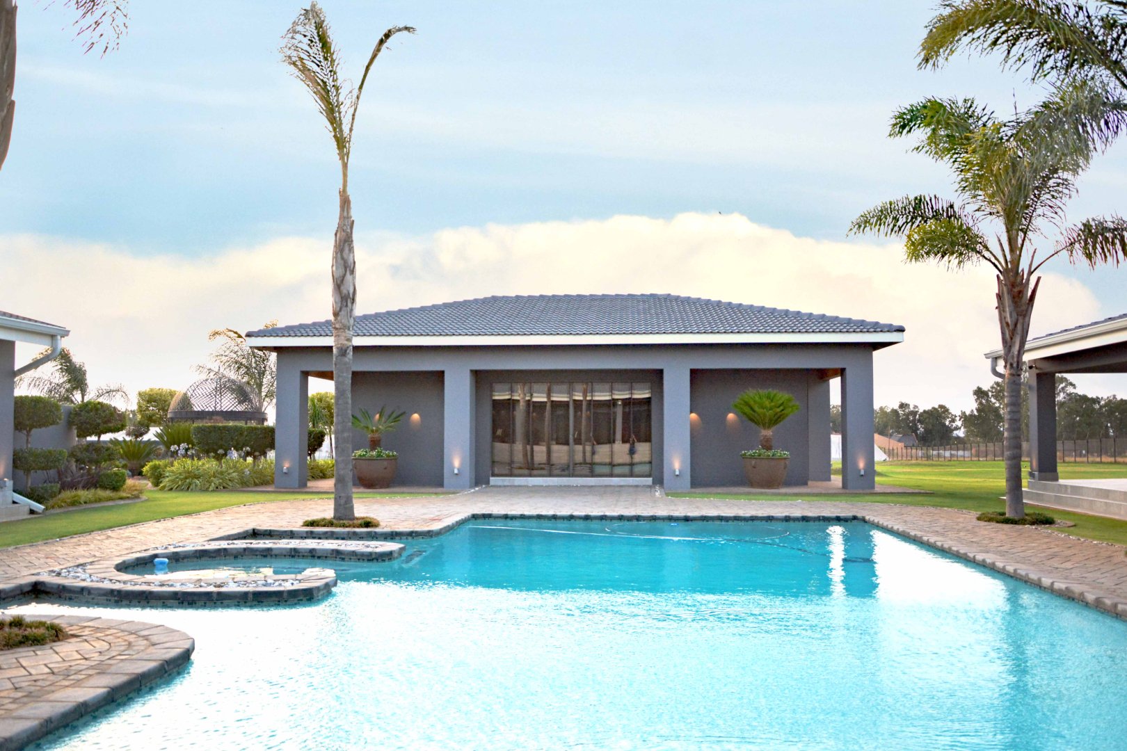 Welcome to an extraordinary opportunity to own a one-of-a-kind lifestyle farm in one of the most sought-after suburbs. This meticulously designed 4-bedroom masterpiece offers luxury living at its finest, blending sophisticated architecture with exceptional functionality across every space. Each spacious bedroom features a full en-suite bathroom, while the open-plan layout flows seamlessly through the grand TV lounge, formal dining area, and a designer kitchen complete with granite countertops, walk-in fridge, wooden bar, and top-quality finishes throughout. A fully equipped scullery and laundry room add to the home’s effortless elegance.