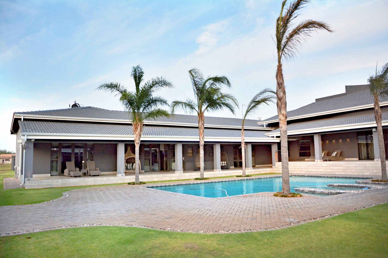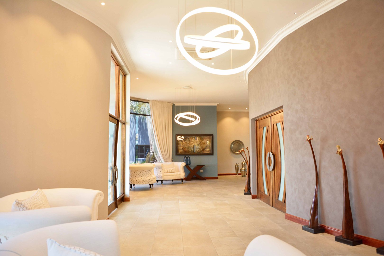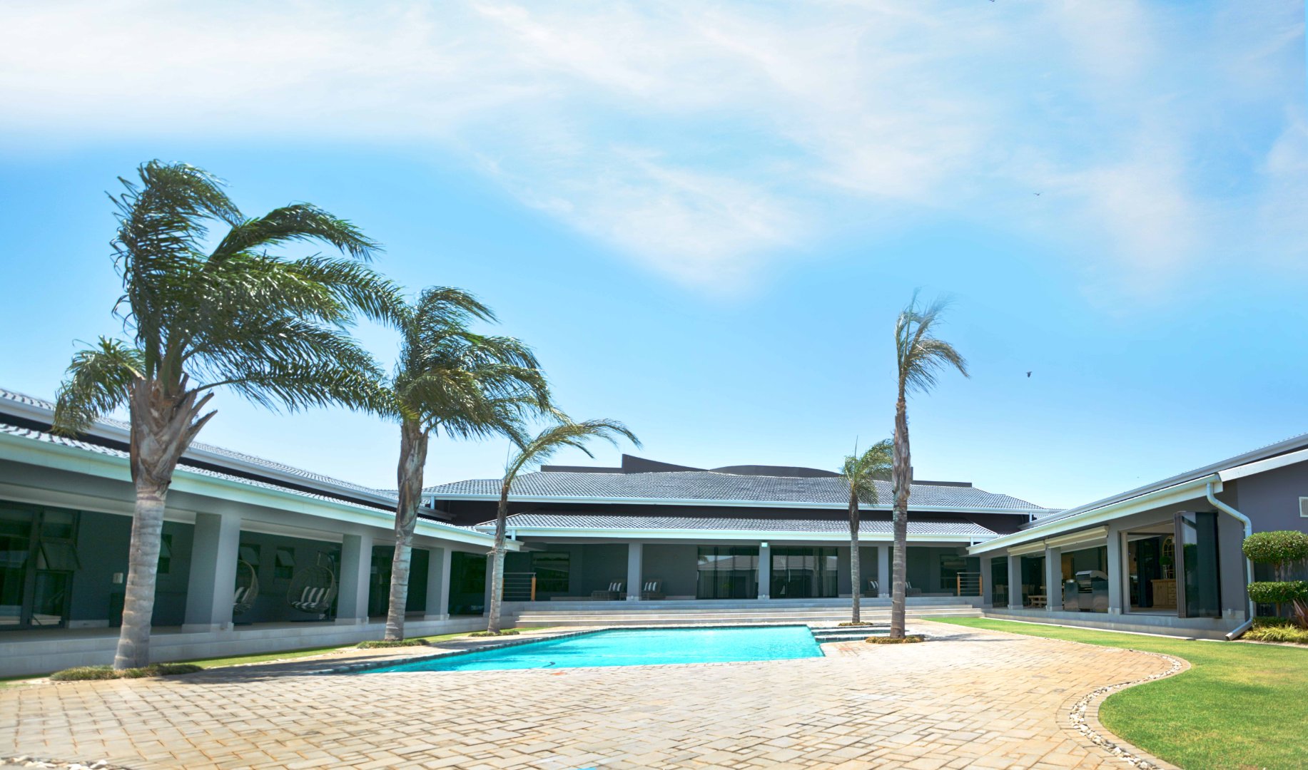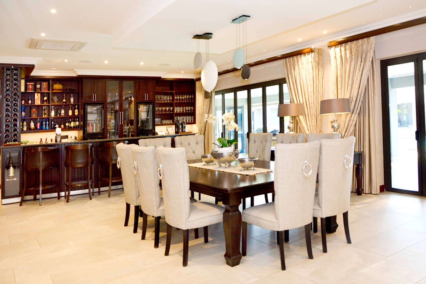 Entertainment is effortless with three covered verandas, a sparkling swimming pool, and an exceptional outdoor entertainment area — all air-conditioned and tastefully tiled. Additional highlights include a fully air-conditioned home, private gym, boma, walk-in safe, and dedicated storage rooms, including a walk-in cooler. The property is powered by a solar system with 74 x 330W panels, a 55kW backup generator, and is secured by an advanced alarm system and CCTV surveillance.