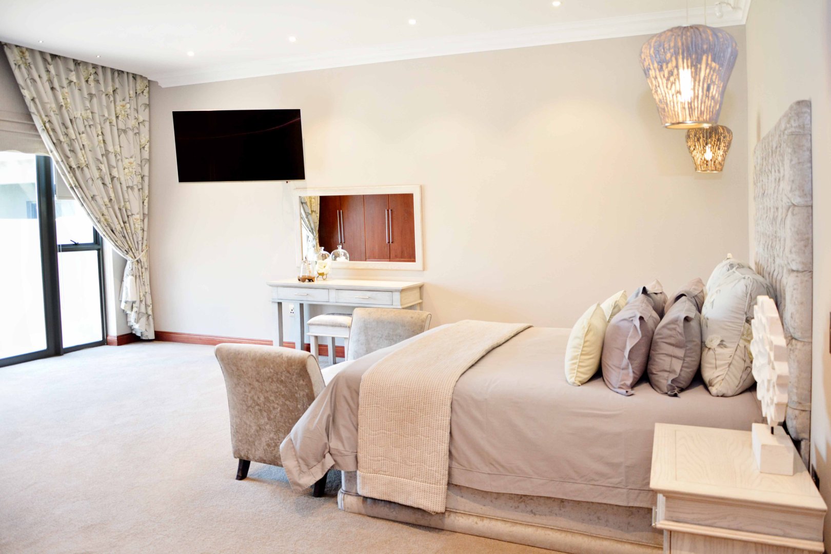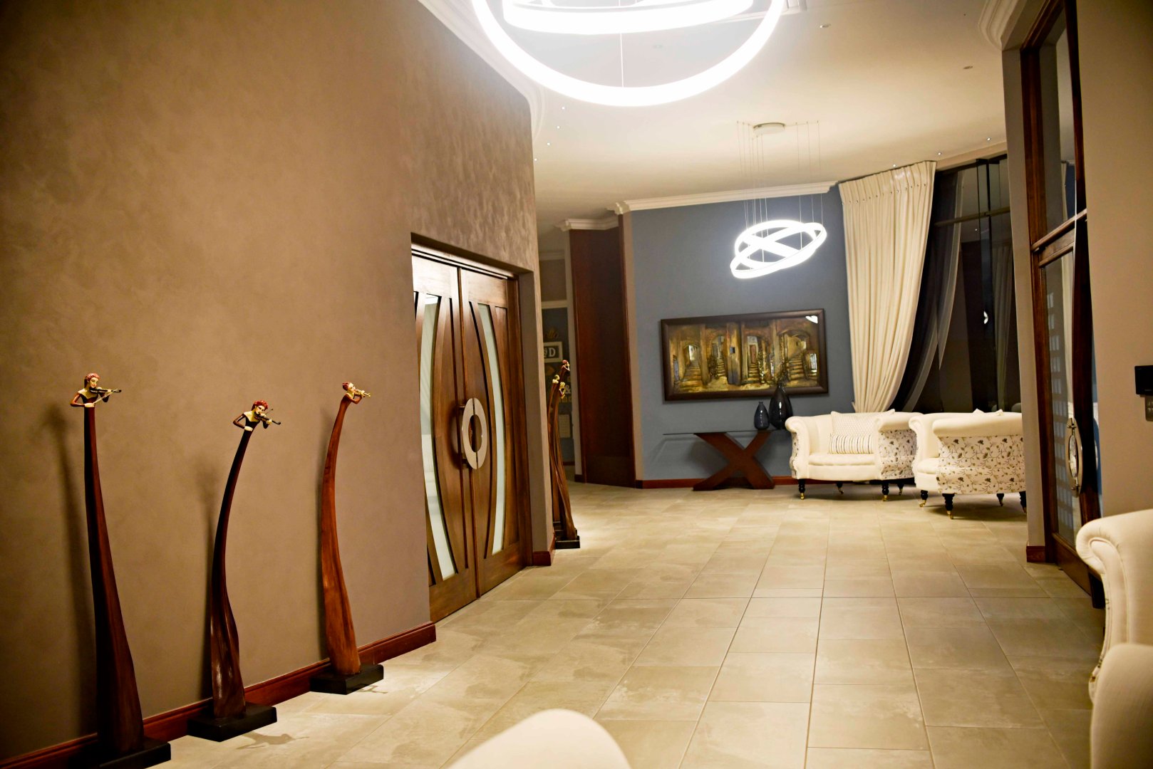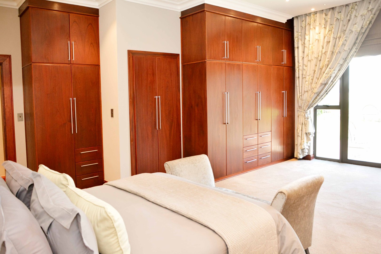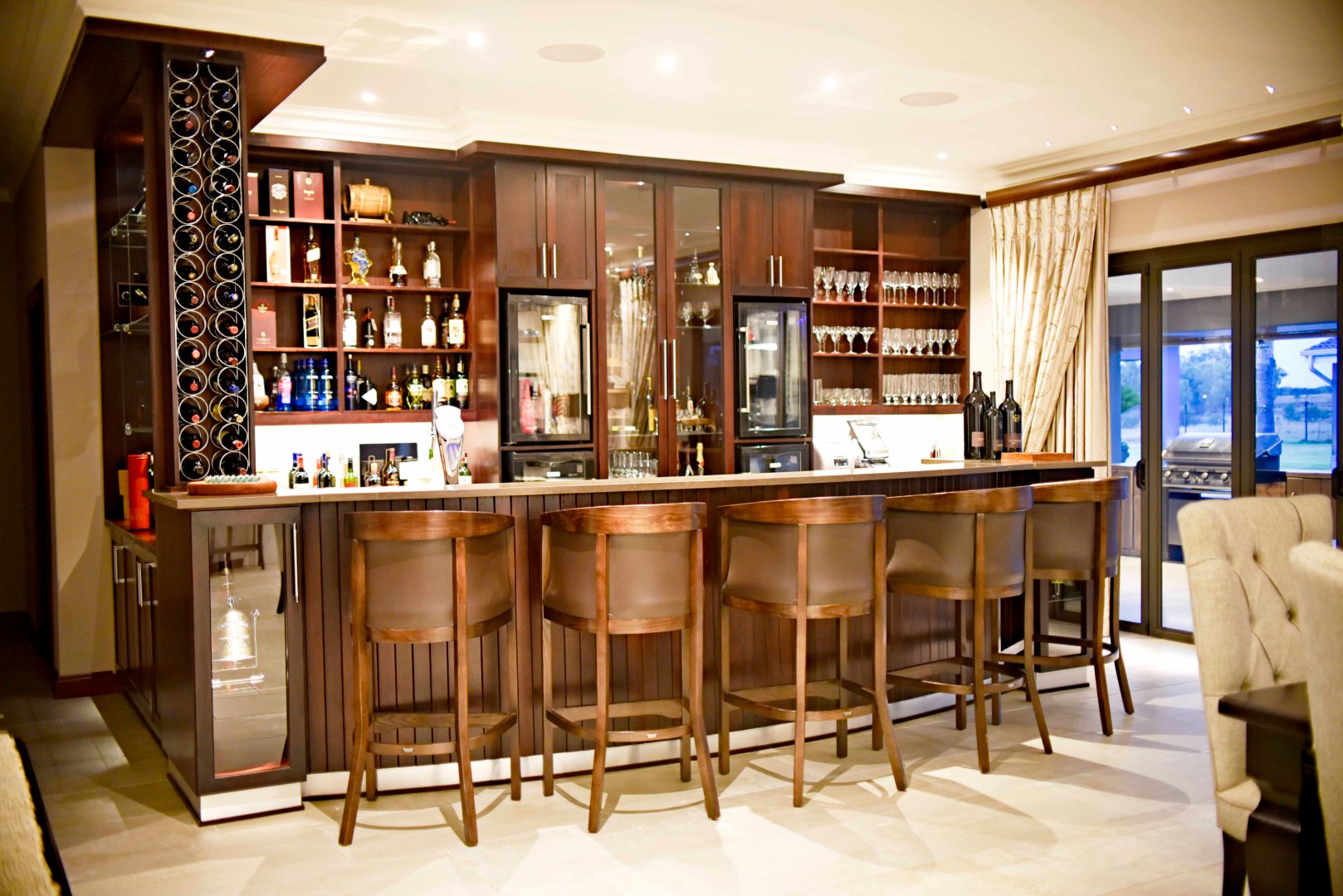 Entertainment is effortless with three covered verandas, a sparkling swimming pool, and an exceptional outdoor entertainment area — all air-conditioned and tastefully tiled. Additional highlights include a fully air-conditioned home, private gym, boma, walk-in safe, and dedicated storage rooms, including a walk-in cooler. The property is powered by a solar system with 74 x 330W panels, a 55kW backup generator, and is secured by an advanced alarm system and CCTV surveillance.
