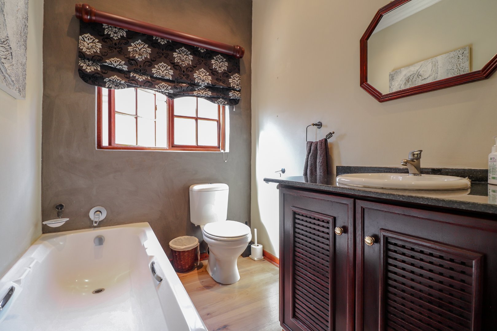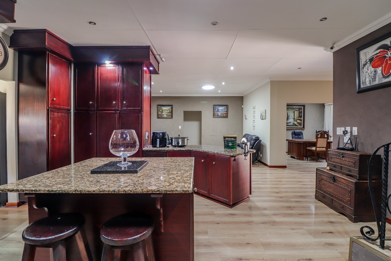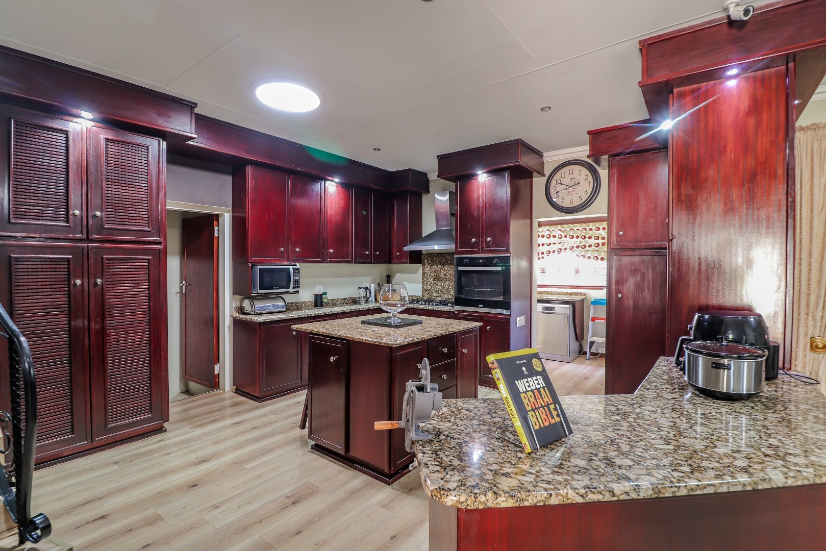The spacious lounge, dining room, and TV/family room provide ample space for relaxation and entertainment, while the study offers a private retreat for work or hobbies. The open-plan kitchen is a chef's delight, featuring granite countertops, a gas stove, and a convenient scullery for easy cleanup.