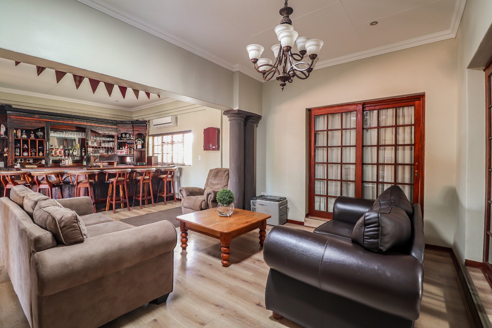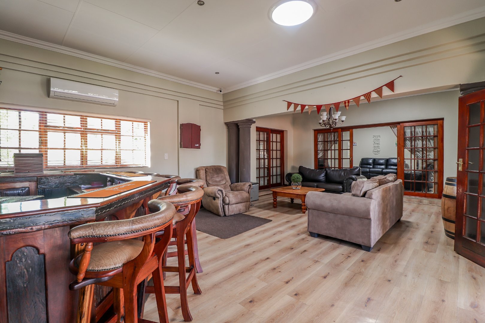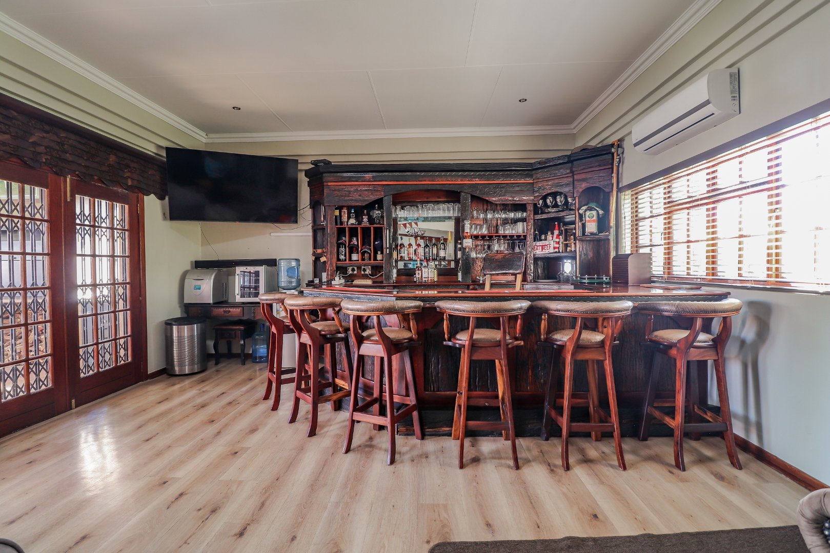 Entertain in style at the stunning bar, where memories will be made over drinks and laughter. For added peace of mind, this property is equipped with top-notch security features, including an alarm system, burglar bars, electric fencing, and outside beams.