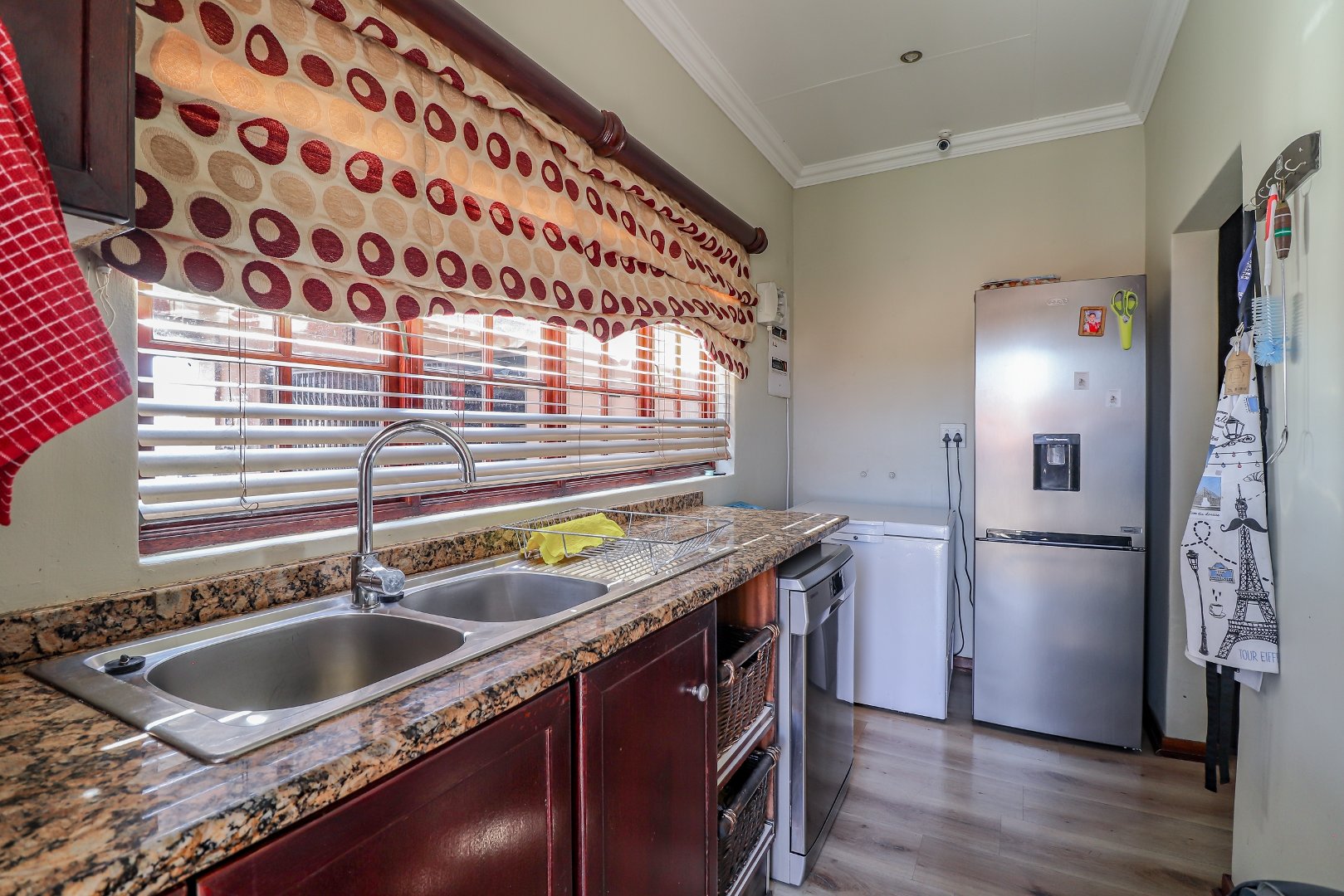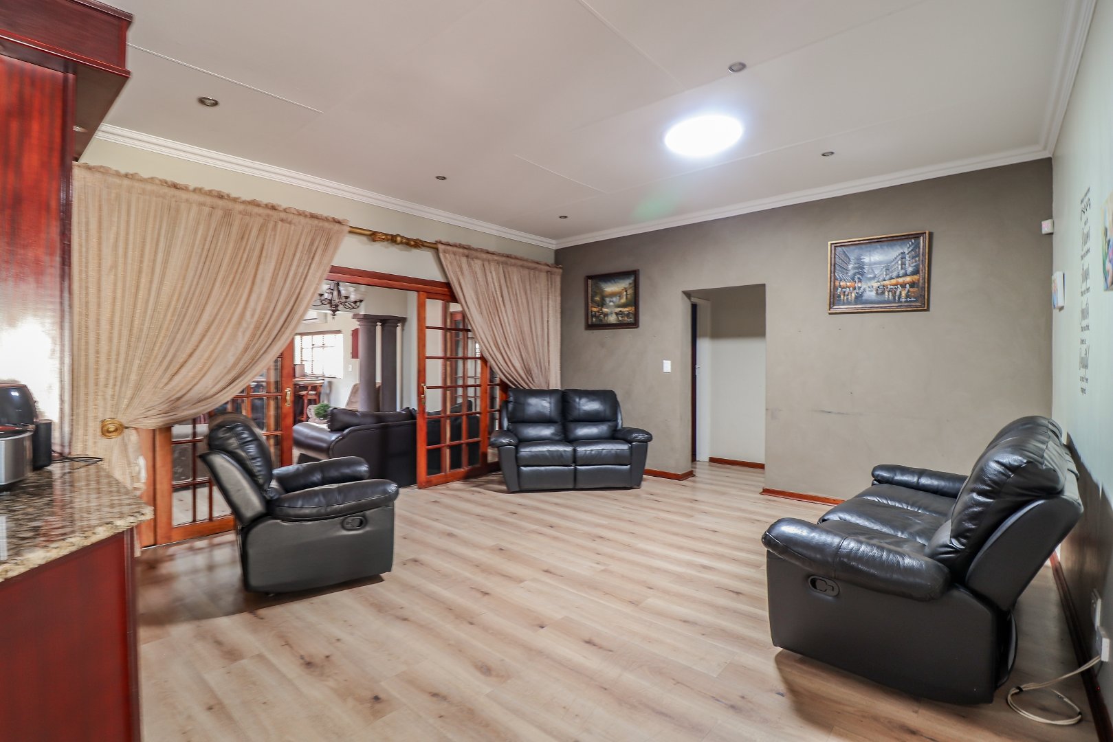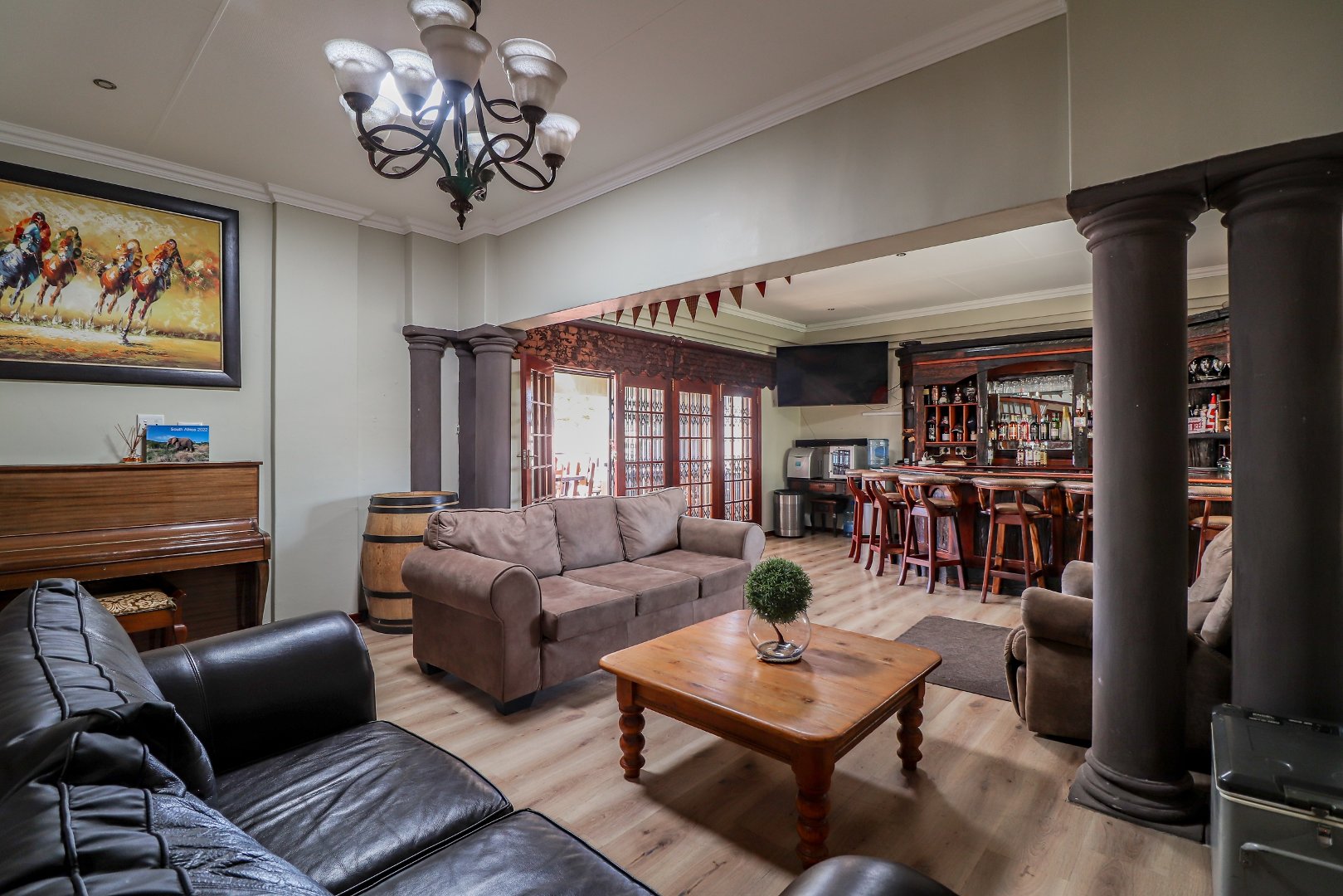 Entertain in style at the stunning bar, where memories will be made over drinks and laughter. For added peace of mind, this property is equipped with top-notch security features, including an alarm system, burglar bars, electric fencing, and outside beams.