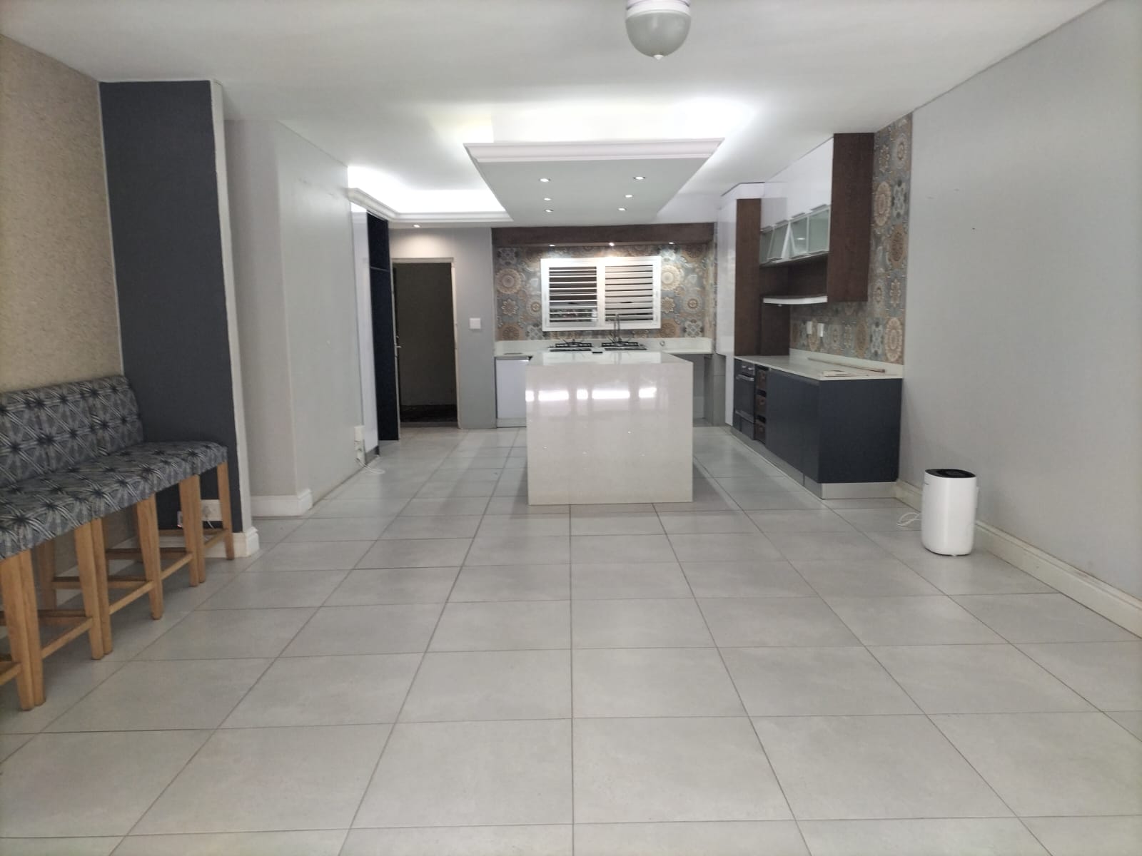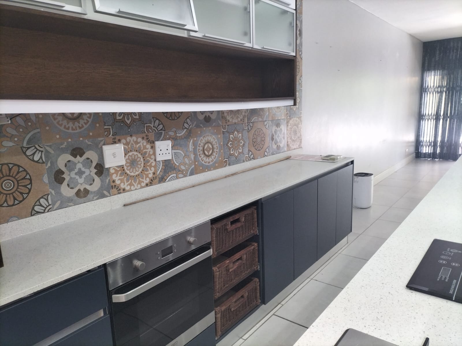 Step into an ultra-modern kitchen featuring a central island equipped with 2 gas burners and 2 induction hobs, along with additional cupboard space. The kitchen seamlessly flows into the open-plan dining and living area, which opens up to a covered patio through stylish stacking doors.