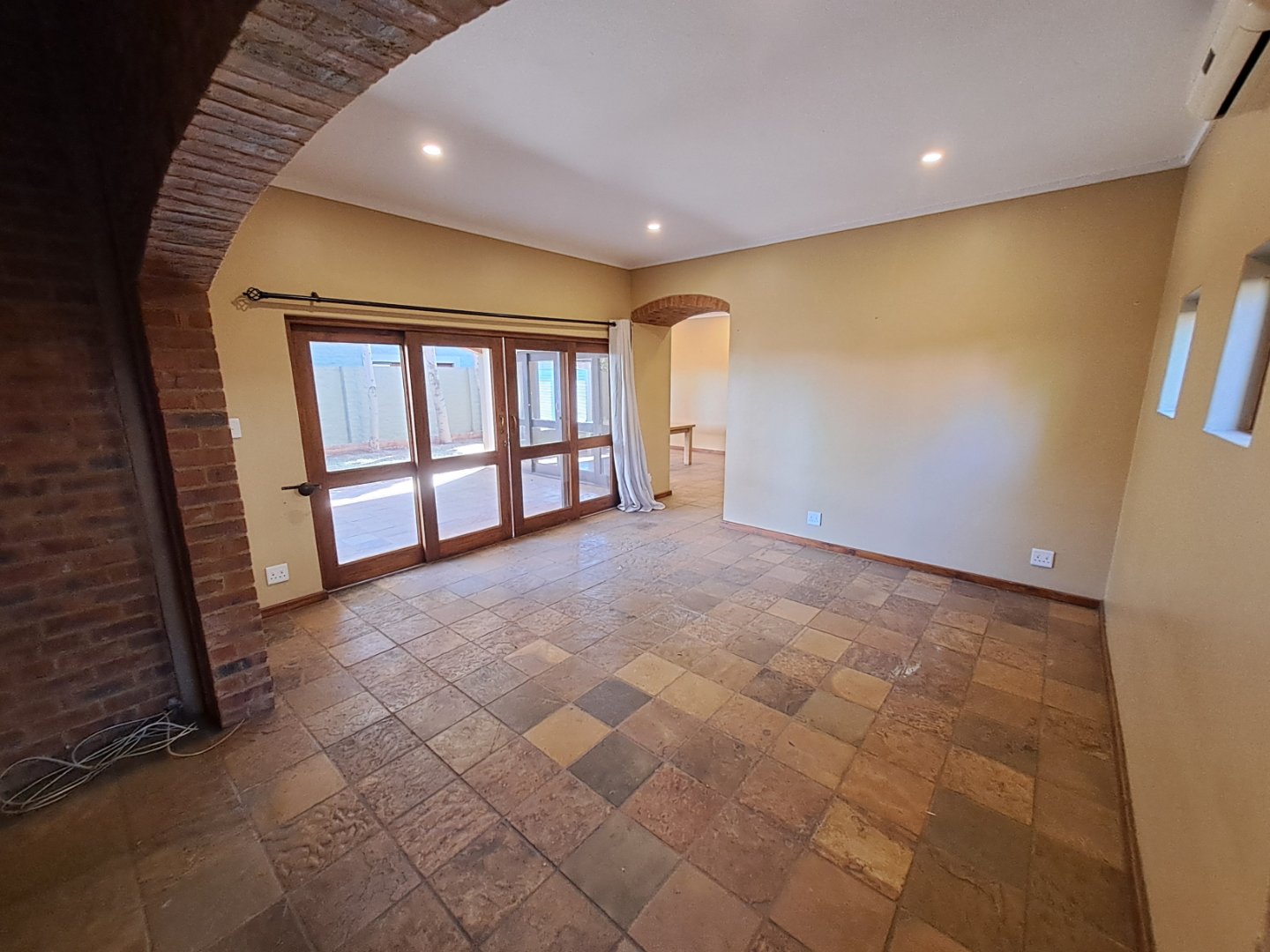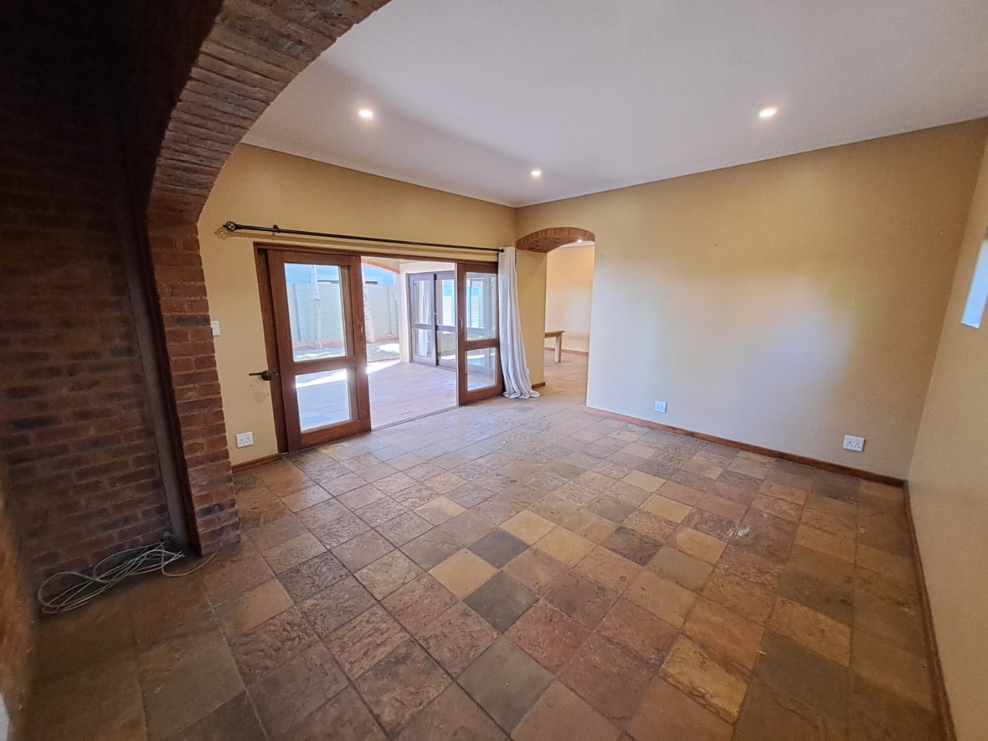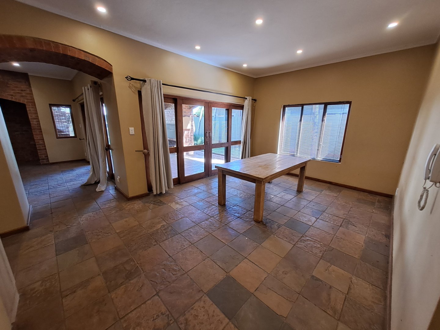 Both the dining and living areas open seamlessly onto a covered patio with a built-in braai—an ideal setting for entertaining—overlooking a neat, well-kept garden that enhances the home’s outdoor appeal.