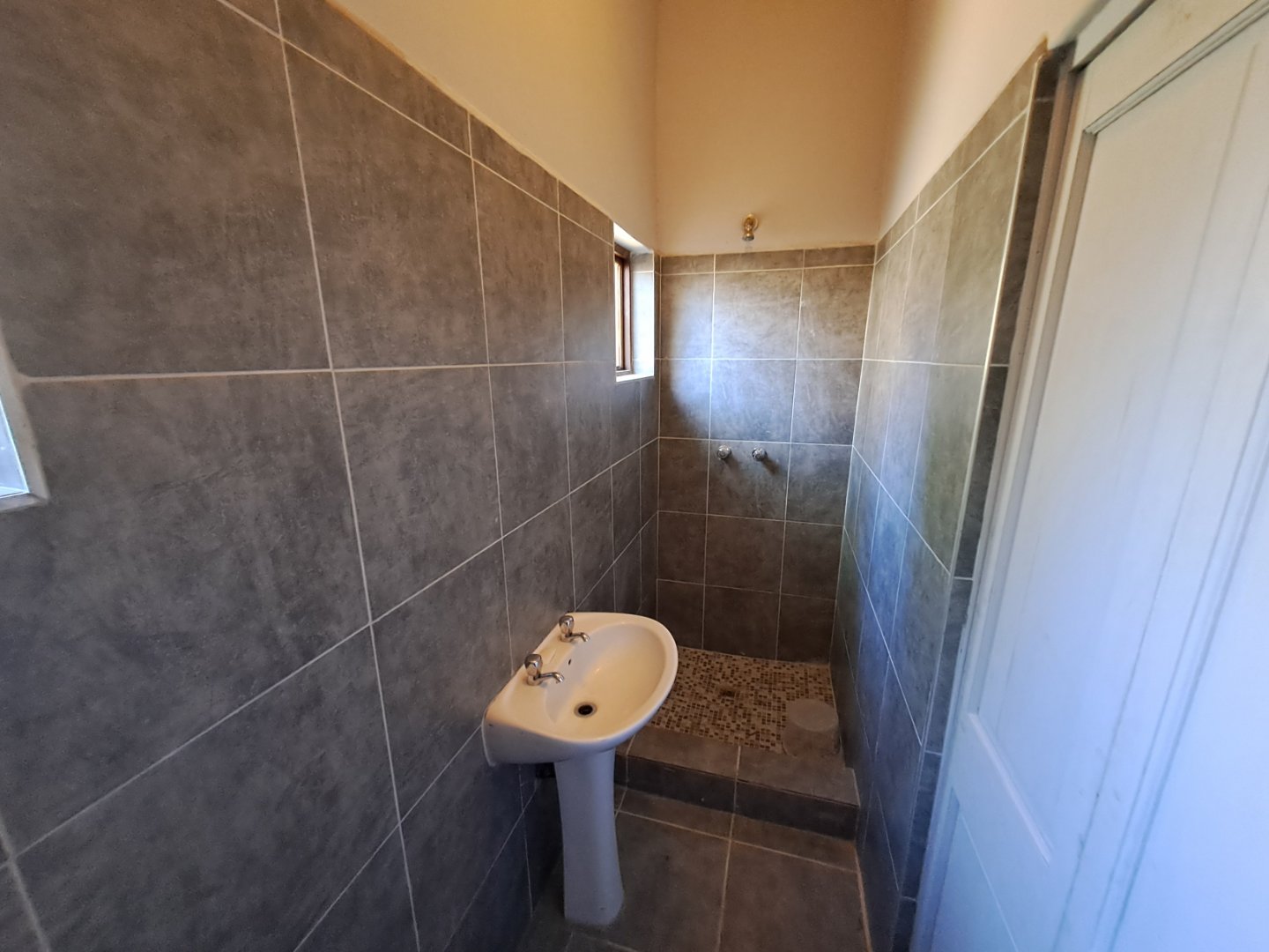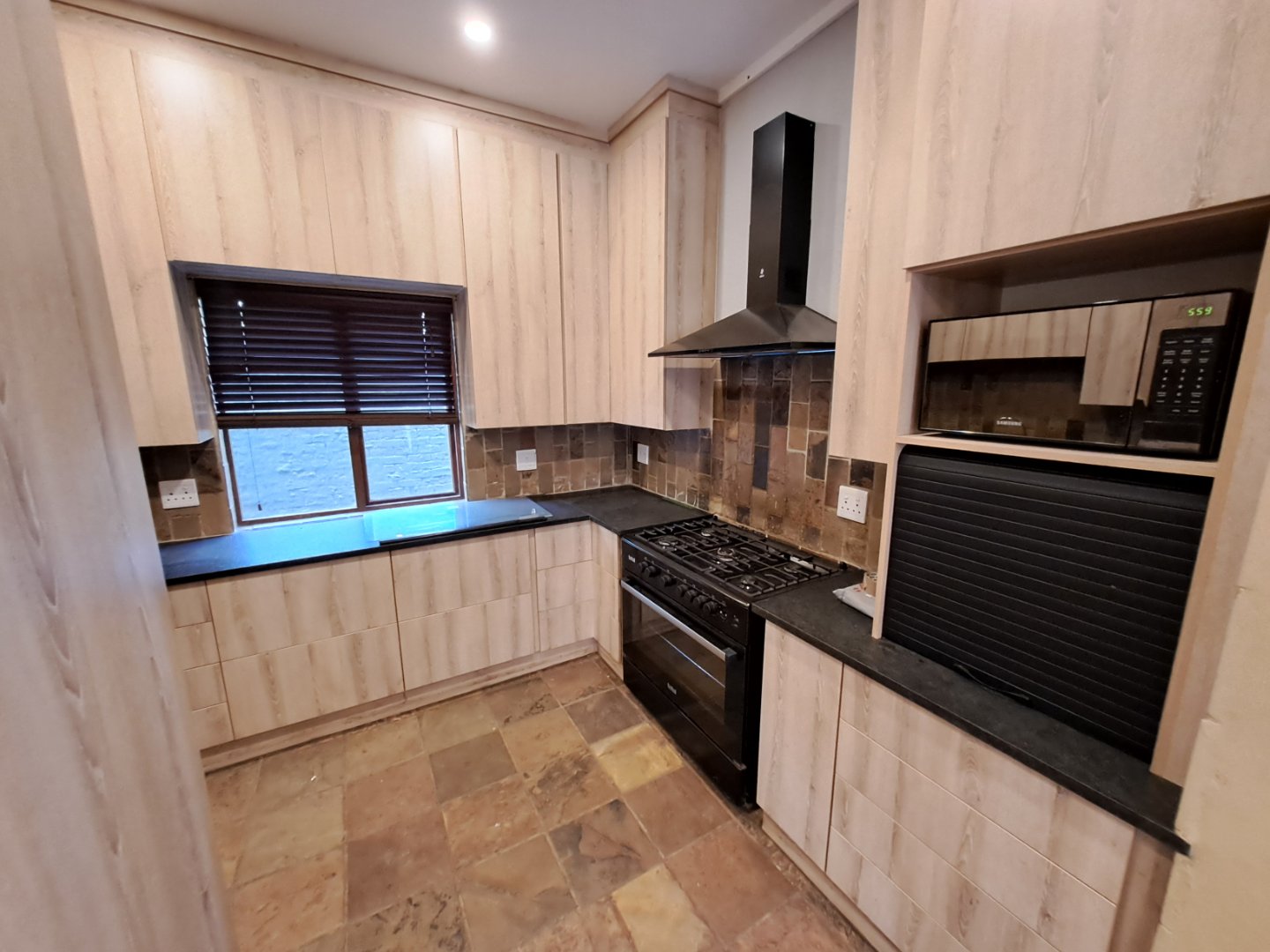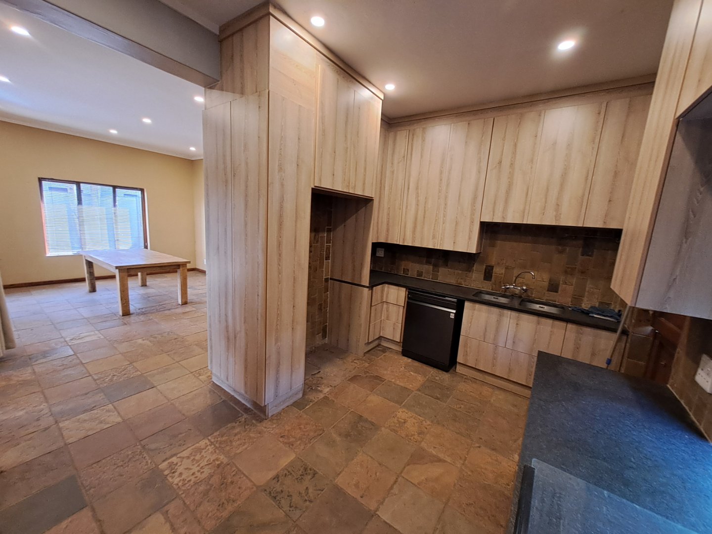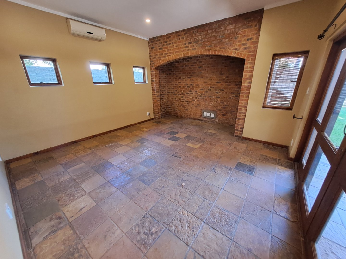 Both the dining and living areas open seamlessly onto a covered patio with a built-in braai—an ideal setting for entertaining—overlooking a neat, well-kept garden that enhances the home’s outdoor appeal.
