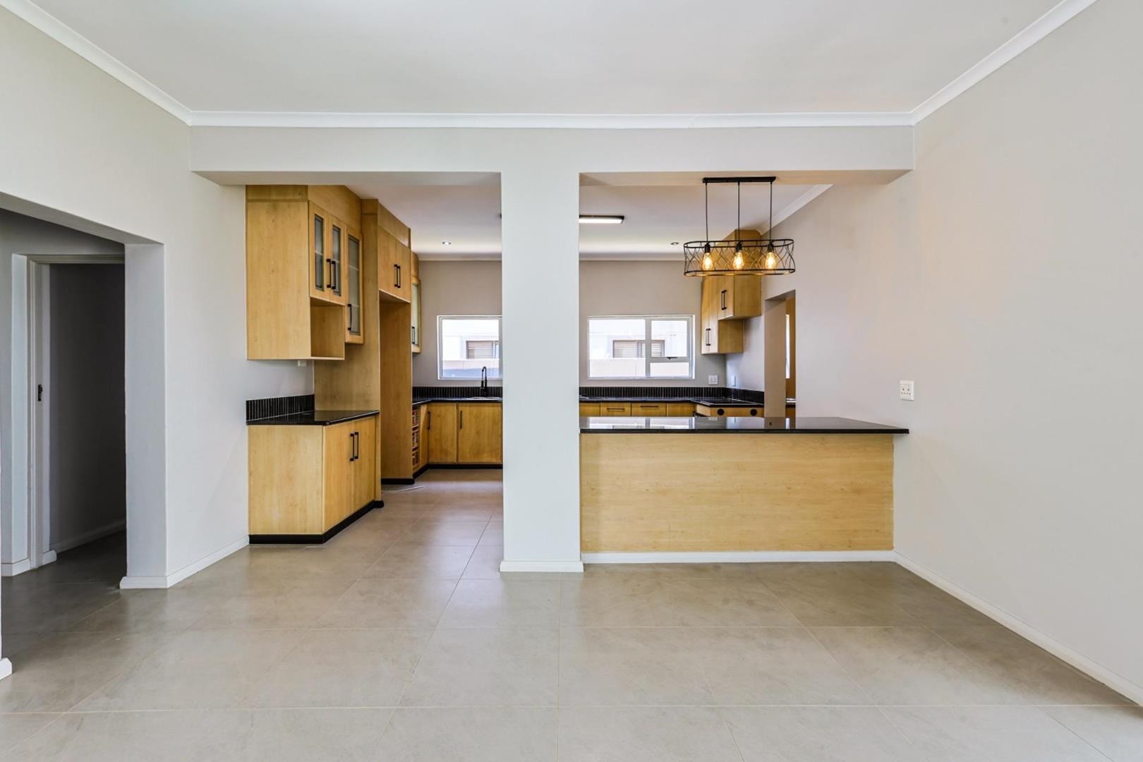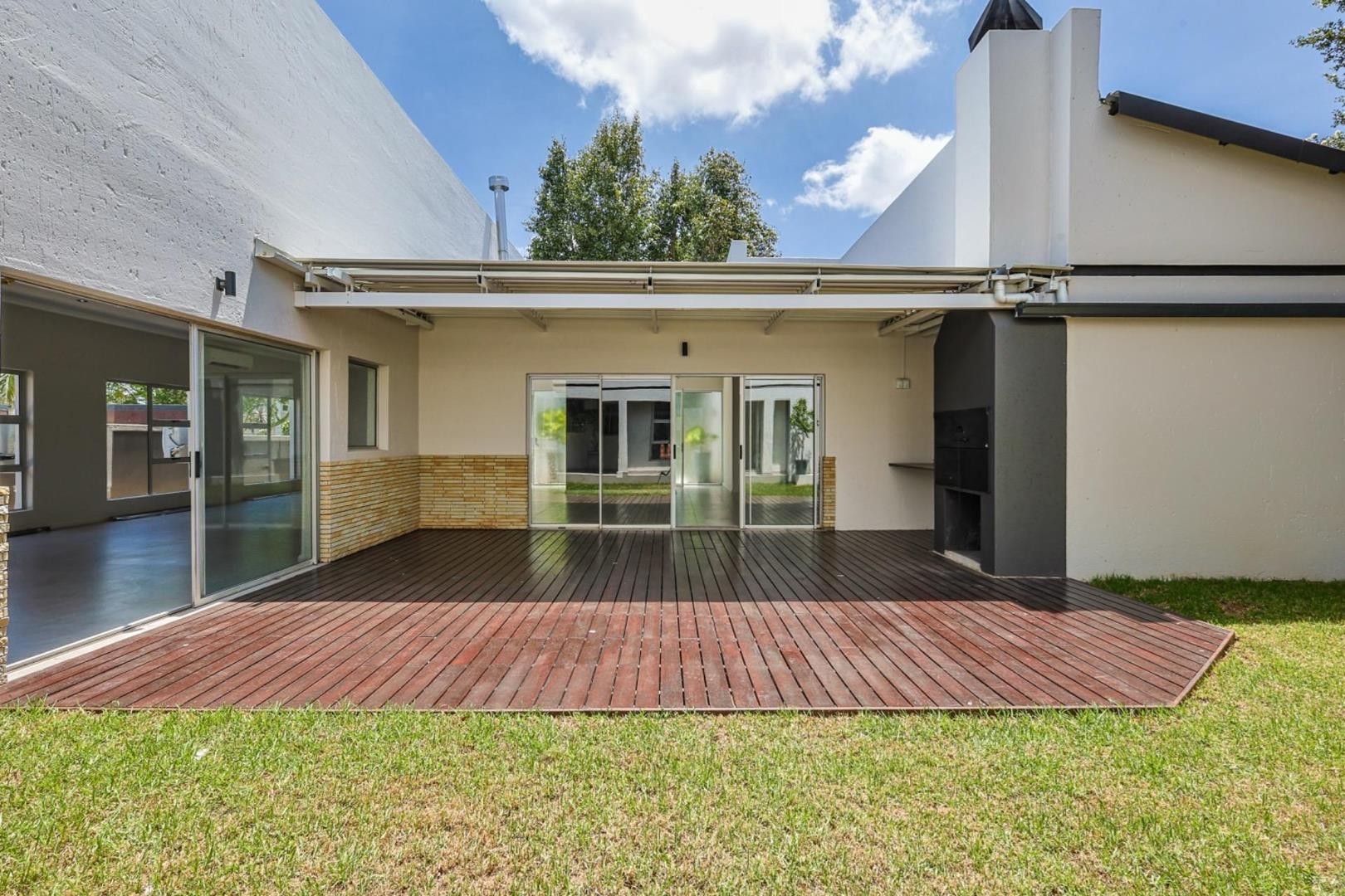 The kitchen is both stylish and inviting, complete with a hidden scullery for added practicality. The indoor dining and living areas flow out onto a covered patio with a built-in braai — ideal for hosting family and friends on warm summer evenings.