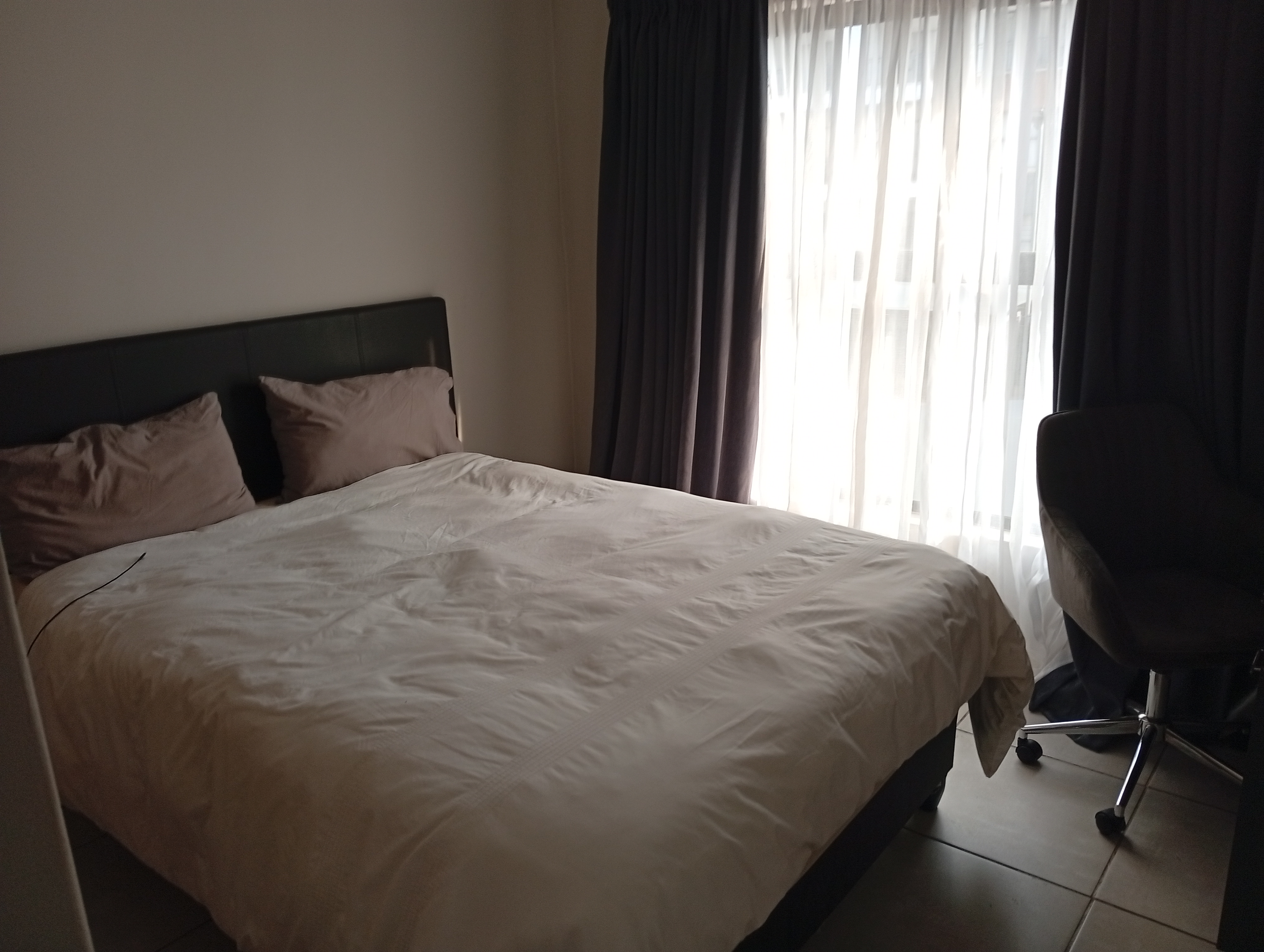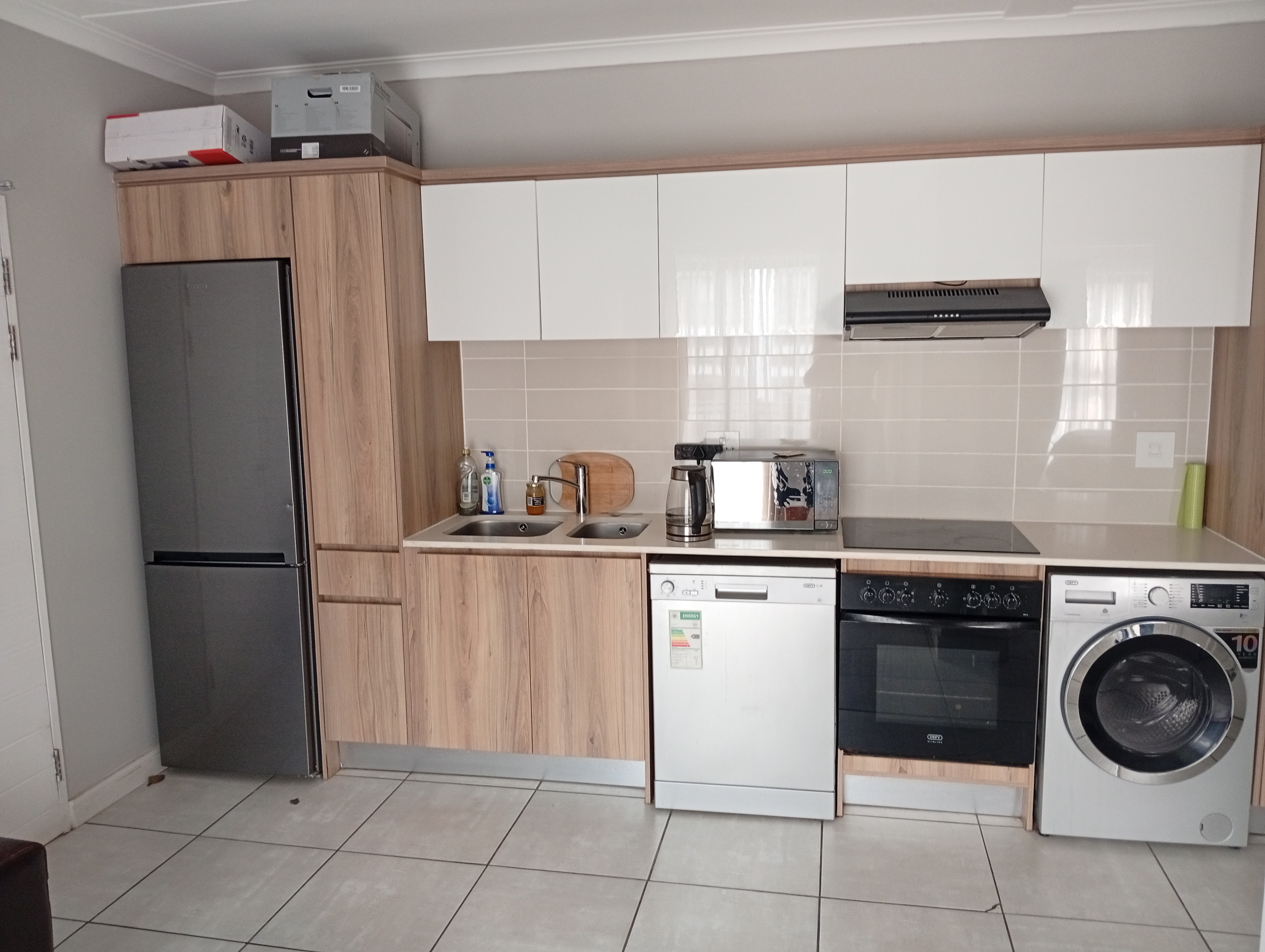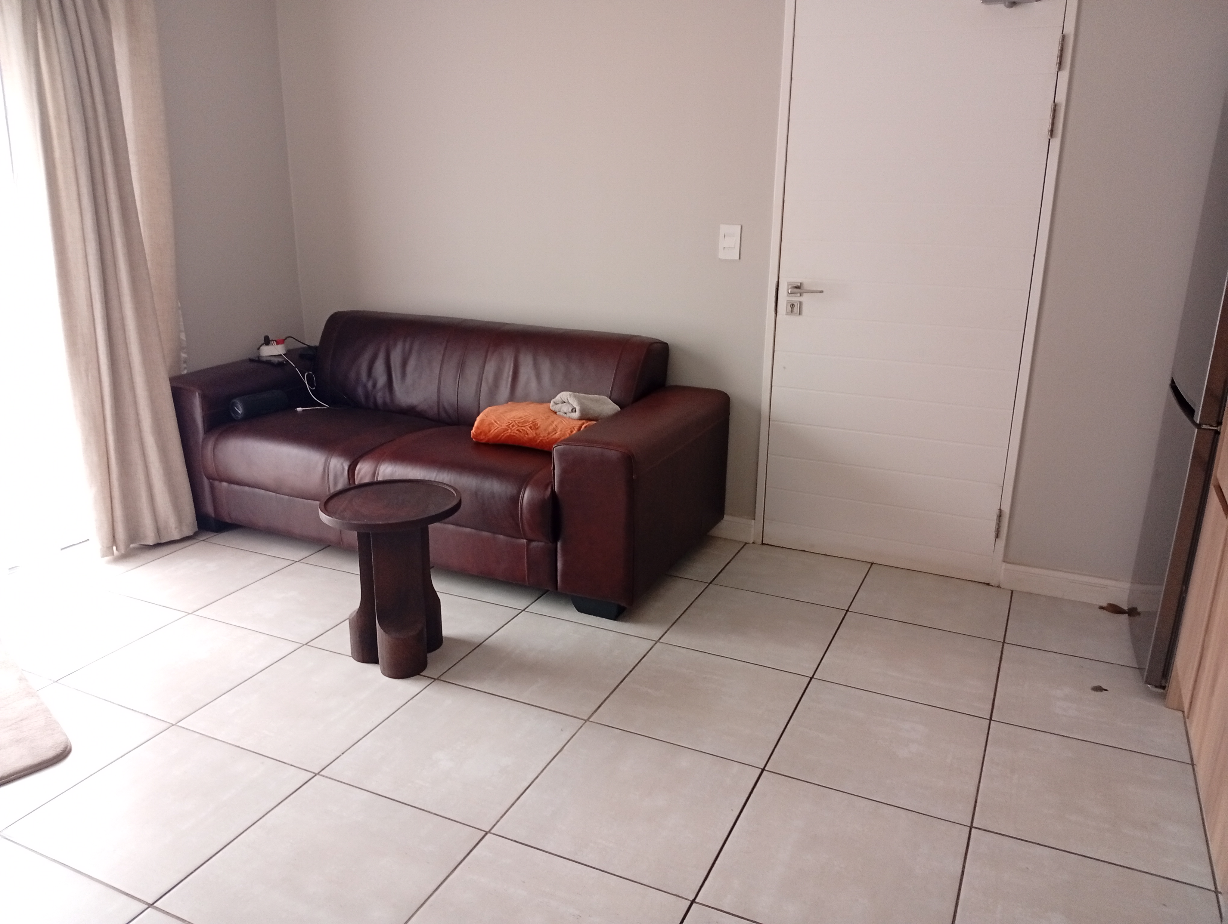 Upon entering, you are welcomed into a modern open-plan kitchen fitted with sleek built-in cupboards and quality Defy appliances, including a fridge, stove, dishwasher, and washing machine. The kitchen flows seamlessly into a comfortable lounge area, which opens via a sliding door onto a private balcony—perfect for relaxing or enjoying fresh air.