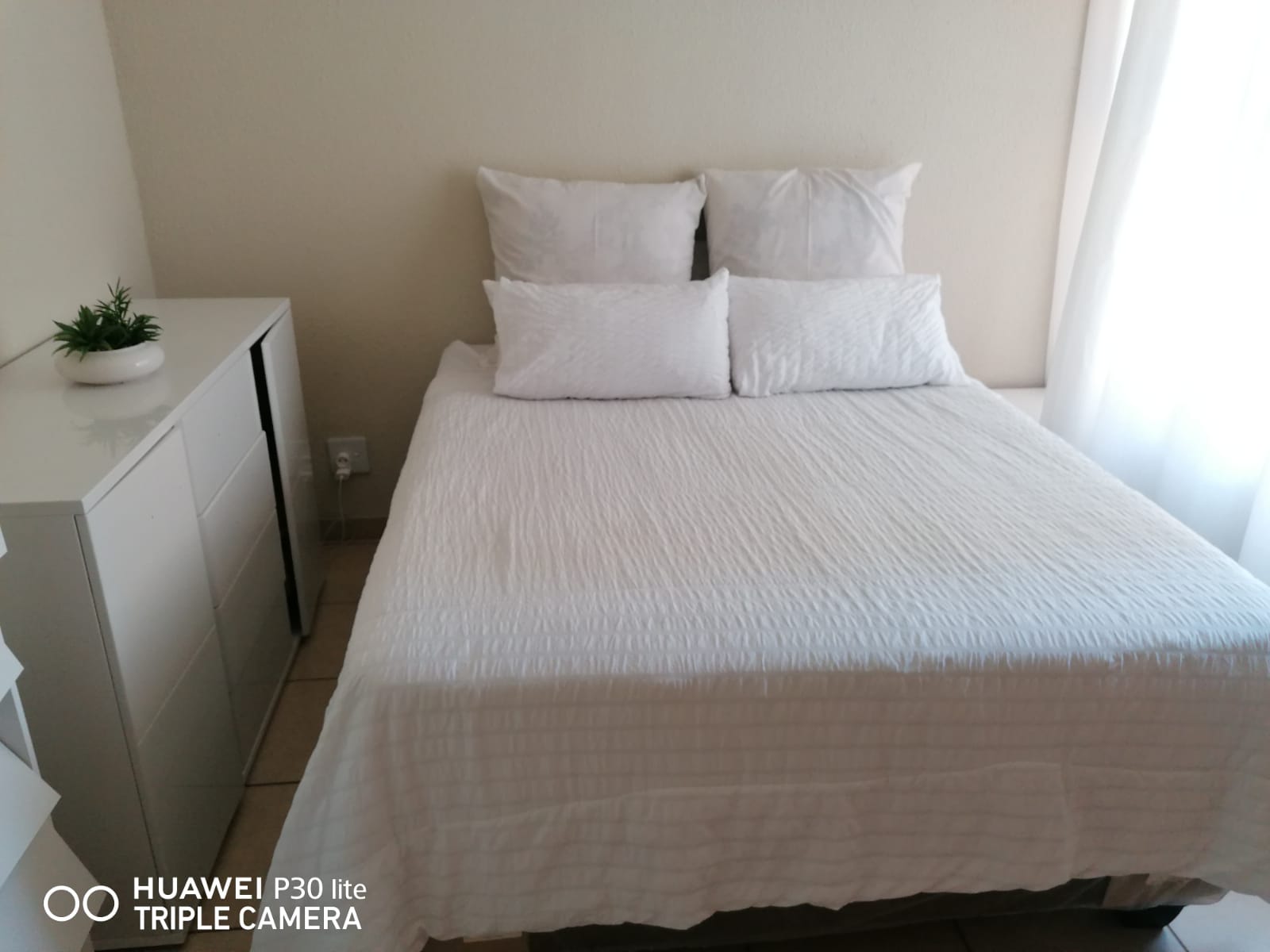The passage leads to three well-sized bedrooms, all fitted with modern built-in cupboards. The main bedroom offers ample cupboard space and an en-suite bathroom. Bedrooms two and three share a neat family bathroom fitted with a shower.