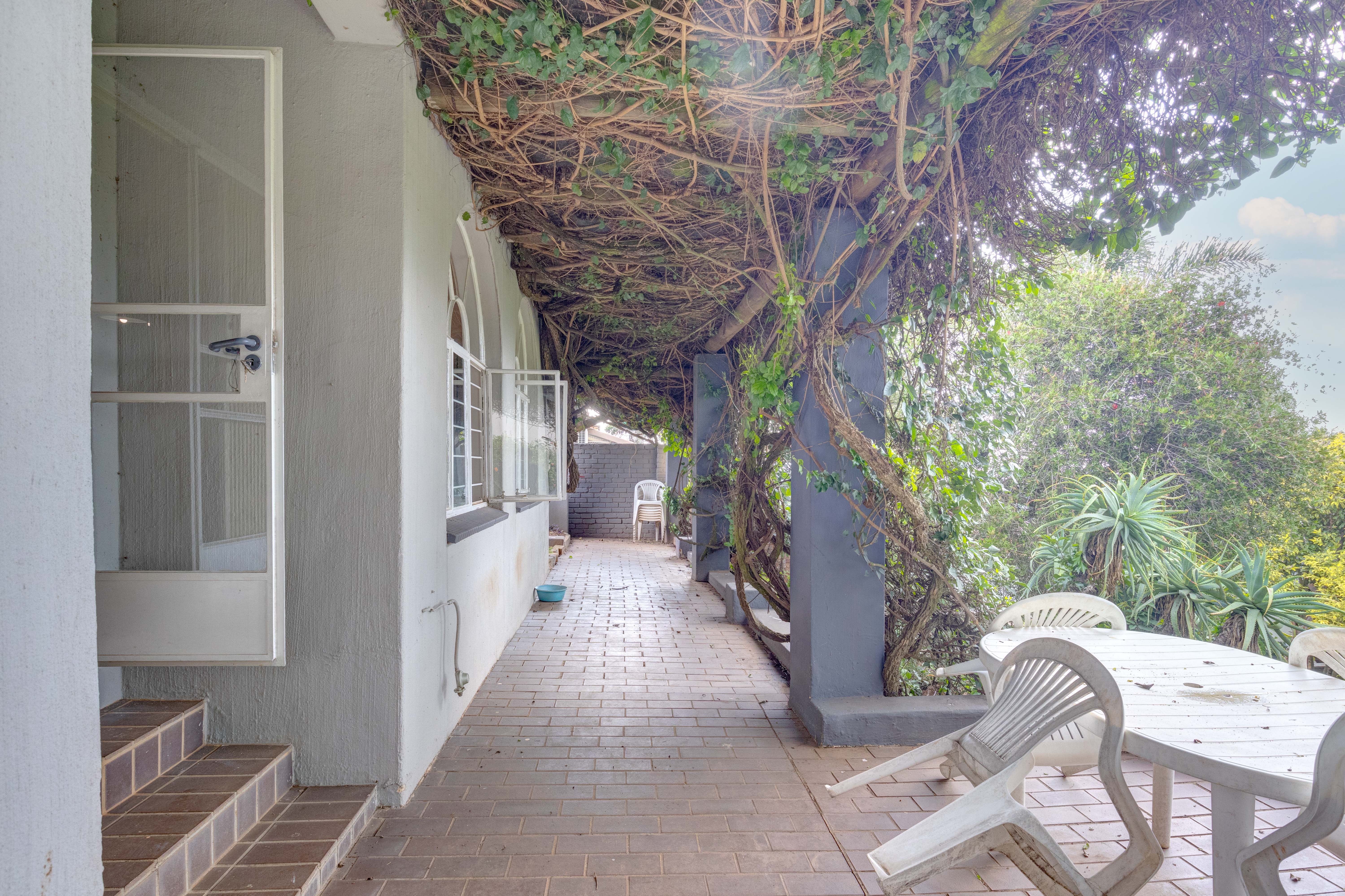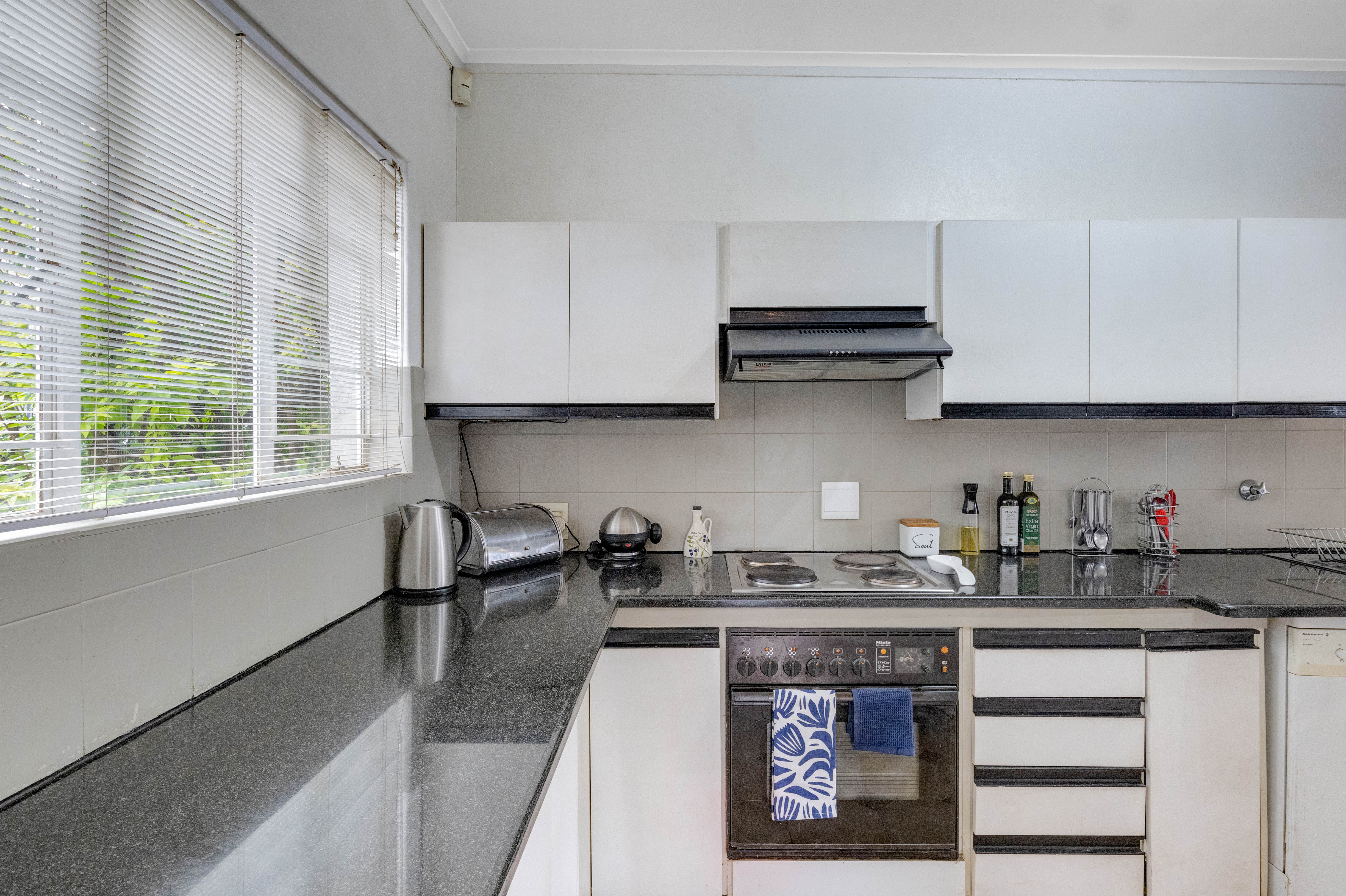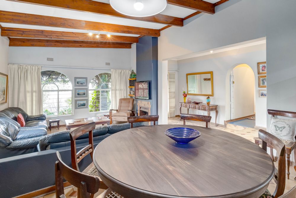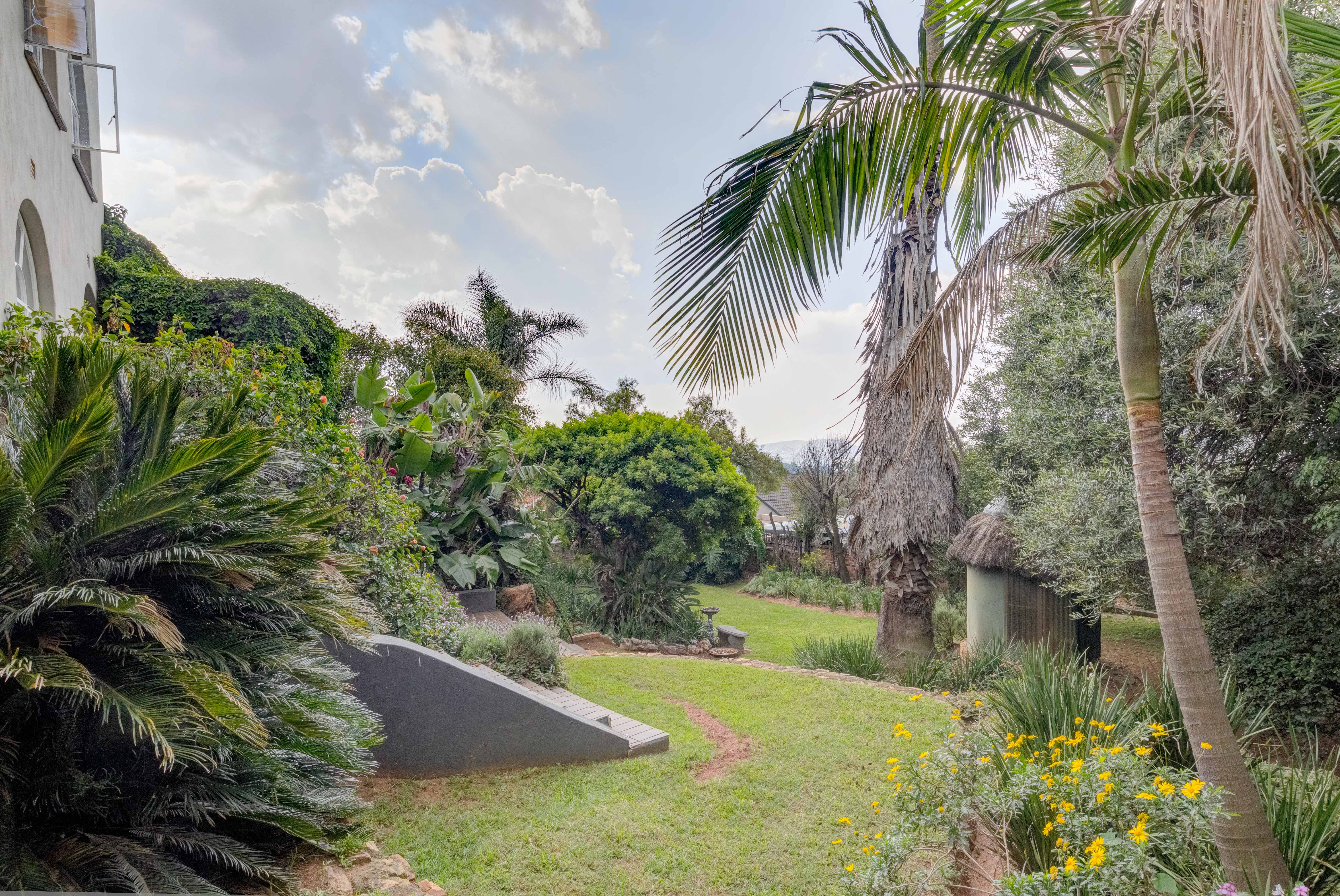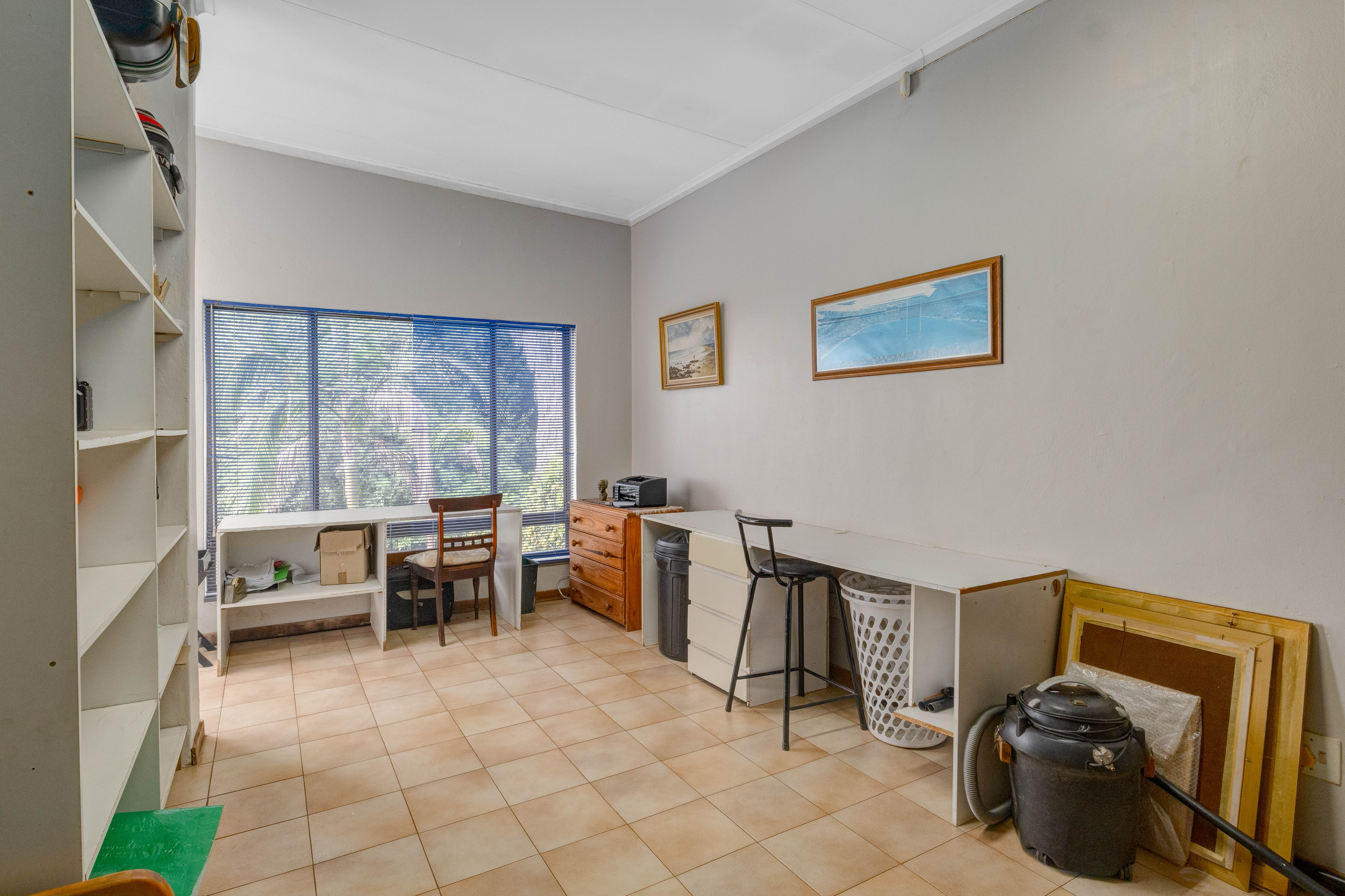 The main house features three spacious bedrooms. The main bedroom includes a sunroom that leads to the garden and connects to a generous study area. There are two bathrooms, a separate lounge and dining room, and a large kitchen with granite countertops and plenty of cupboard space. Additional highlights include a double garage, staff accommodation with bathroom, and a patio overlooking a beautifully tropical garden.