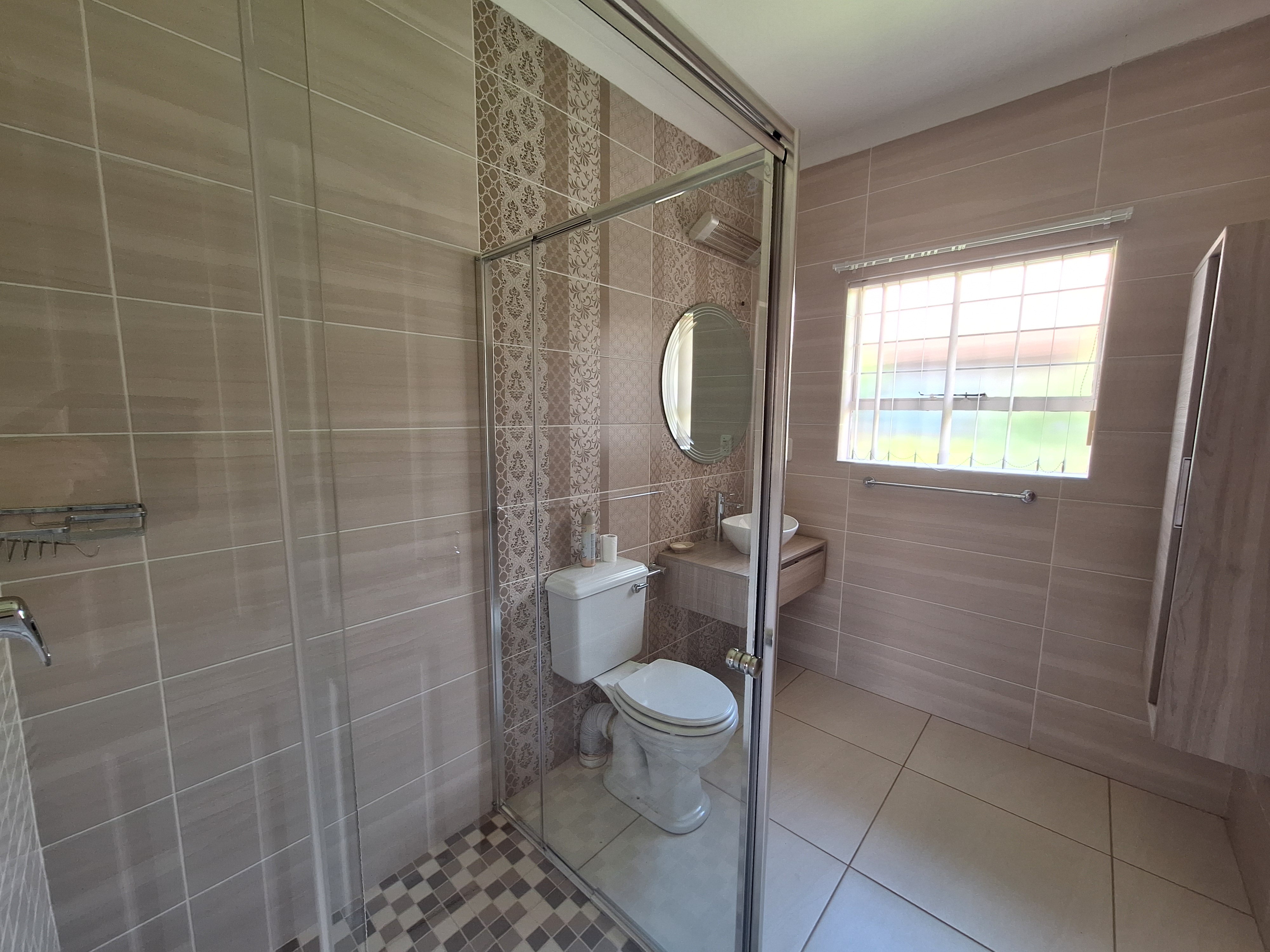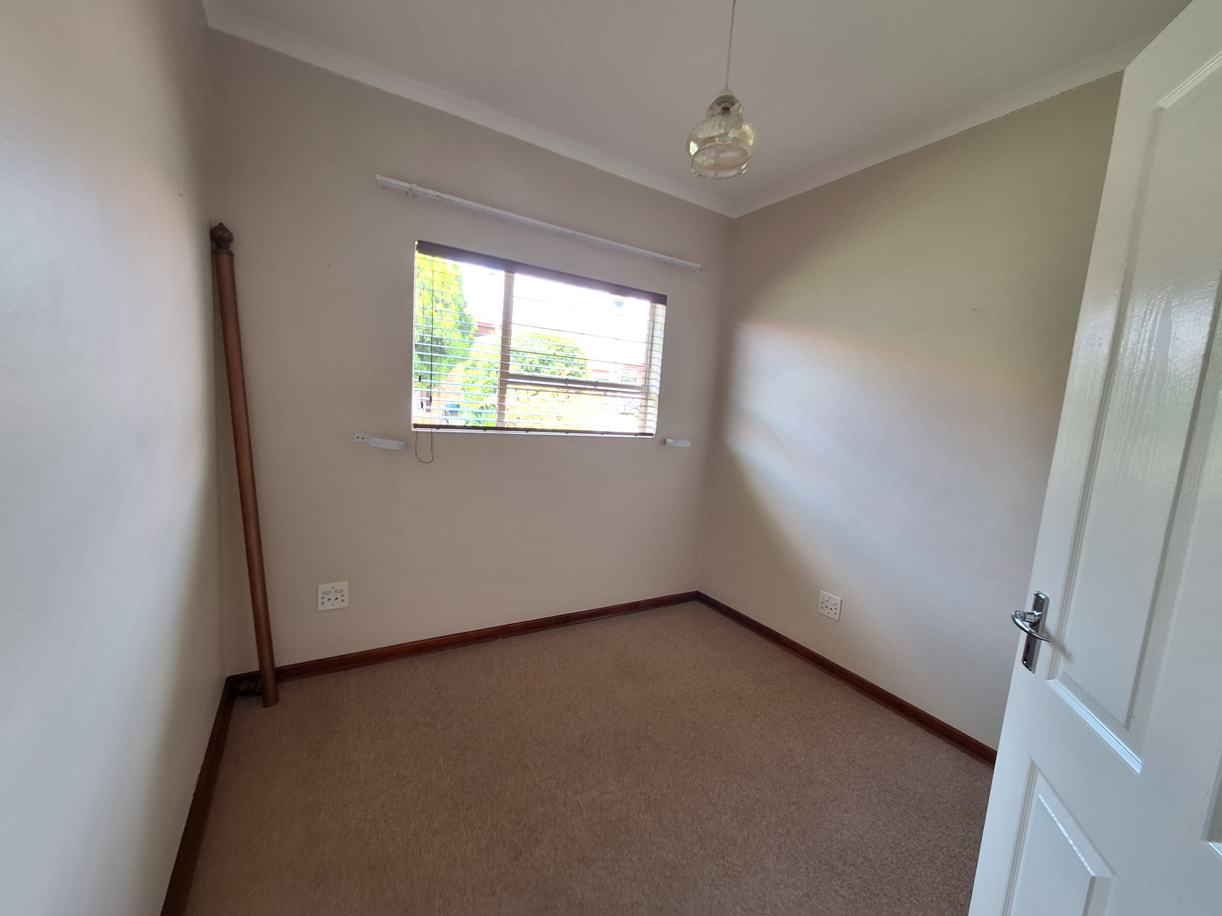 The generously sized main bedroom is carpeted for comfort and includes ample built-in cupboards as well as a modern en suite bathroom fitted with both a bath and a shower. The second bedroom is also carpeted with excellent cupboard space, while a separate study provides a versatile area for work or relaxation. A stylish second bathroom, finished with modern tiles, offers a shower.
