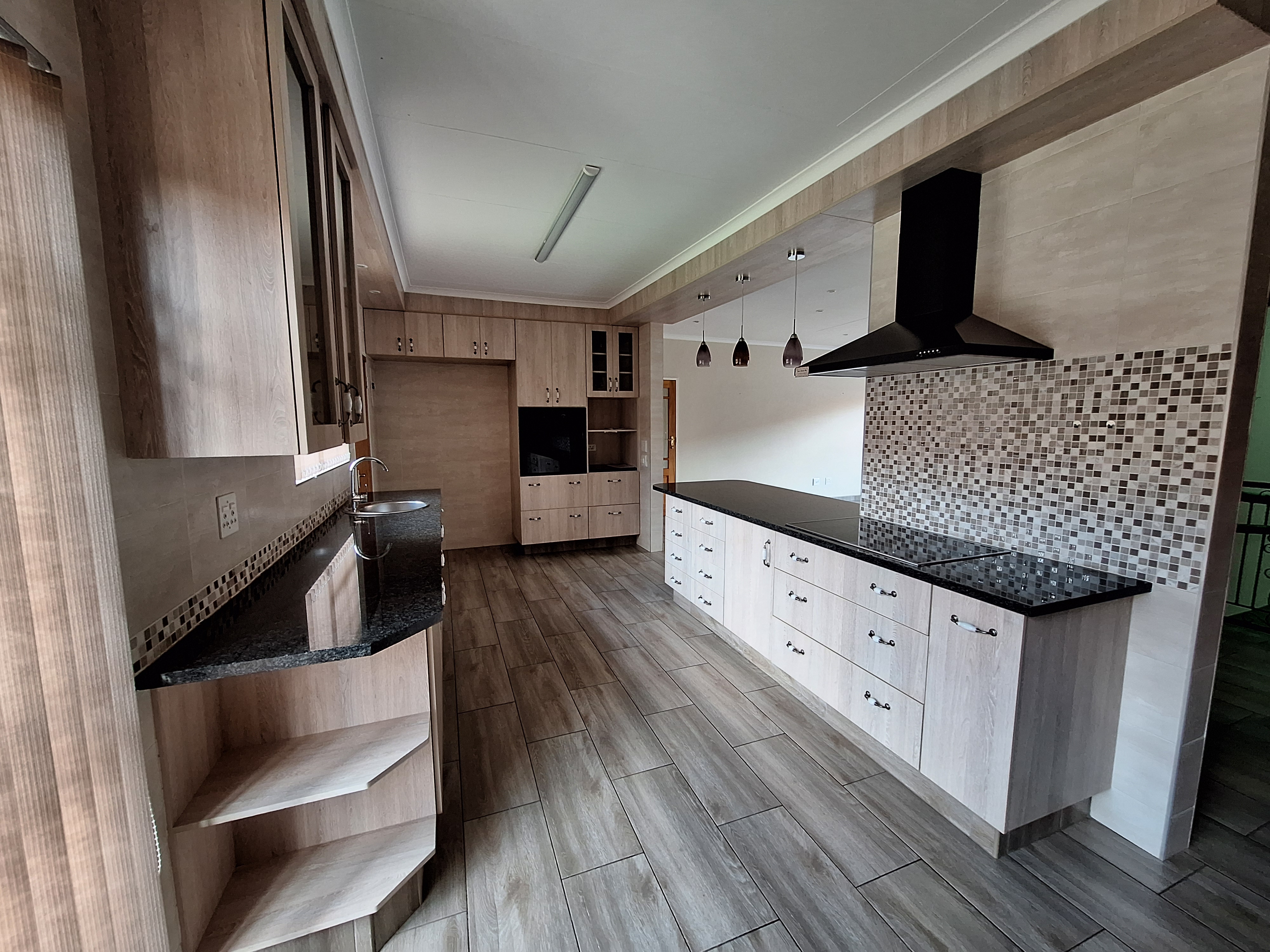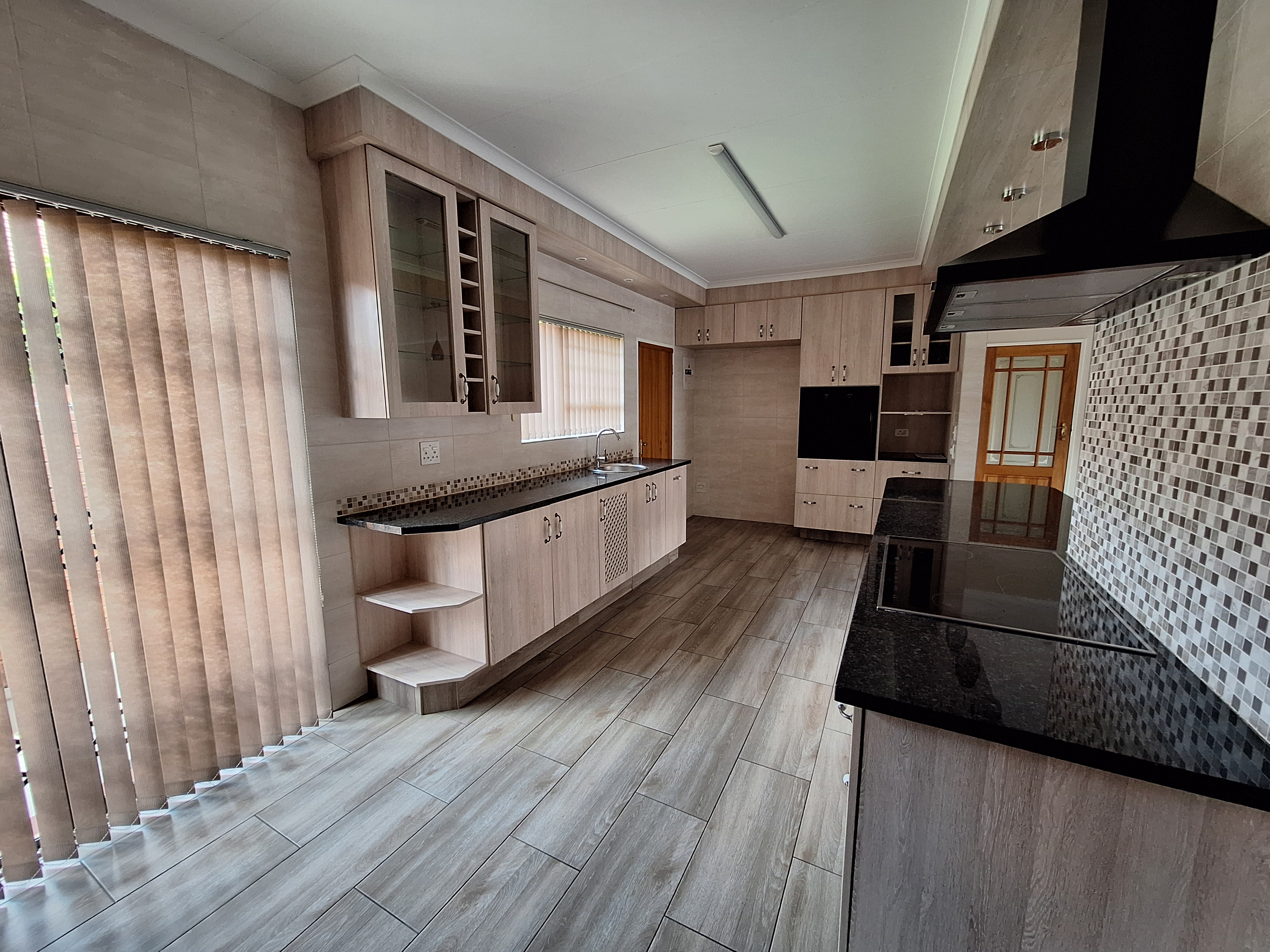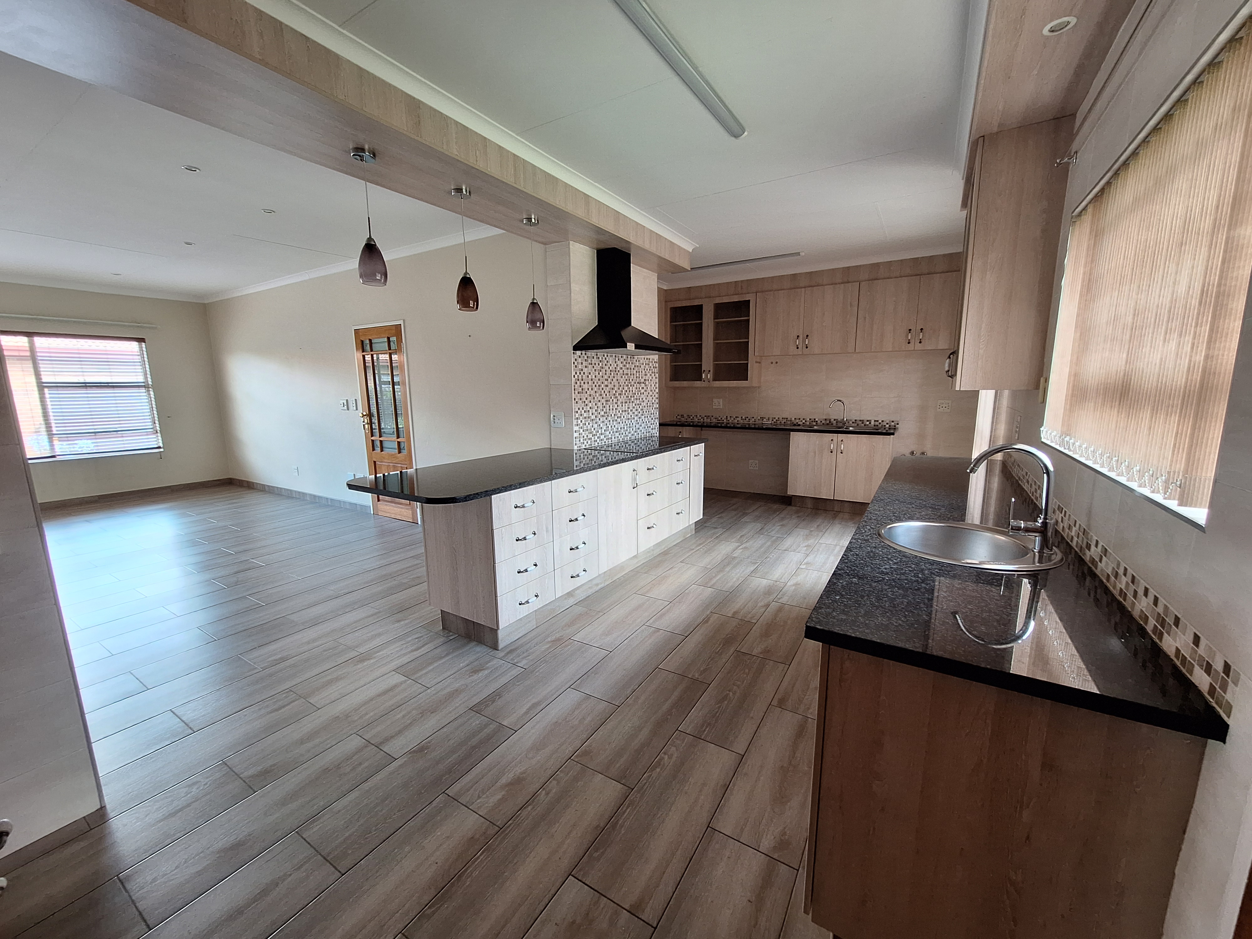 The spacious open-plan kitchen features tiled floors and an abundance of built-in cupboards, making it both practical and a pleasure for any home chef. Sliding doors from the kitchen open onto a private courtyard, enhancing indoor-outdoor living.