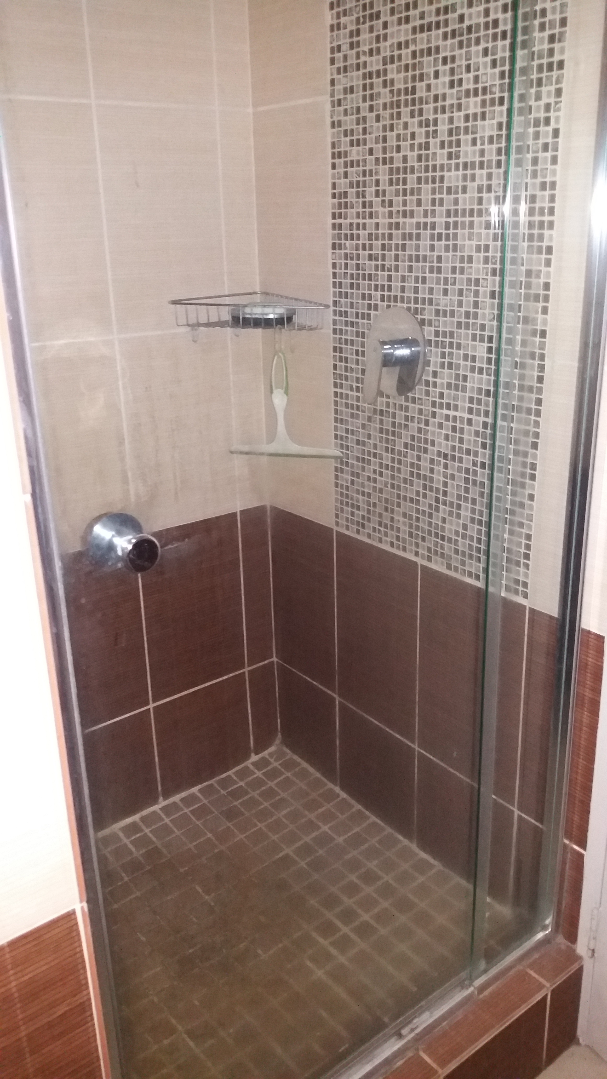 This generously sized home features two tiled bedrooms equipped with built-in cupboards. It includes a full bathroom with a shower, bath, and basin.