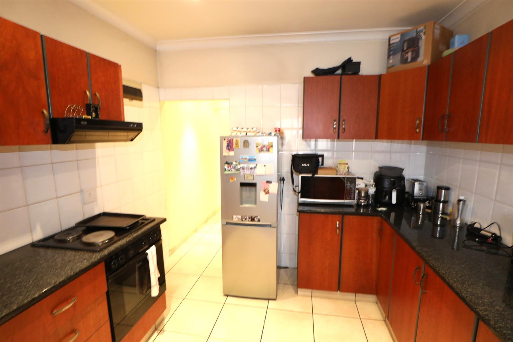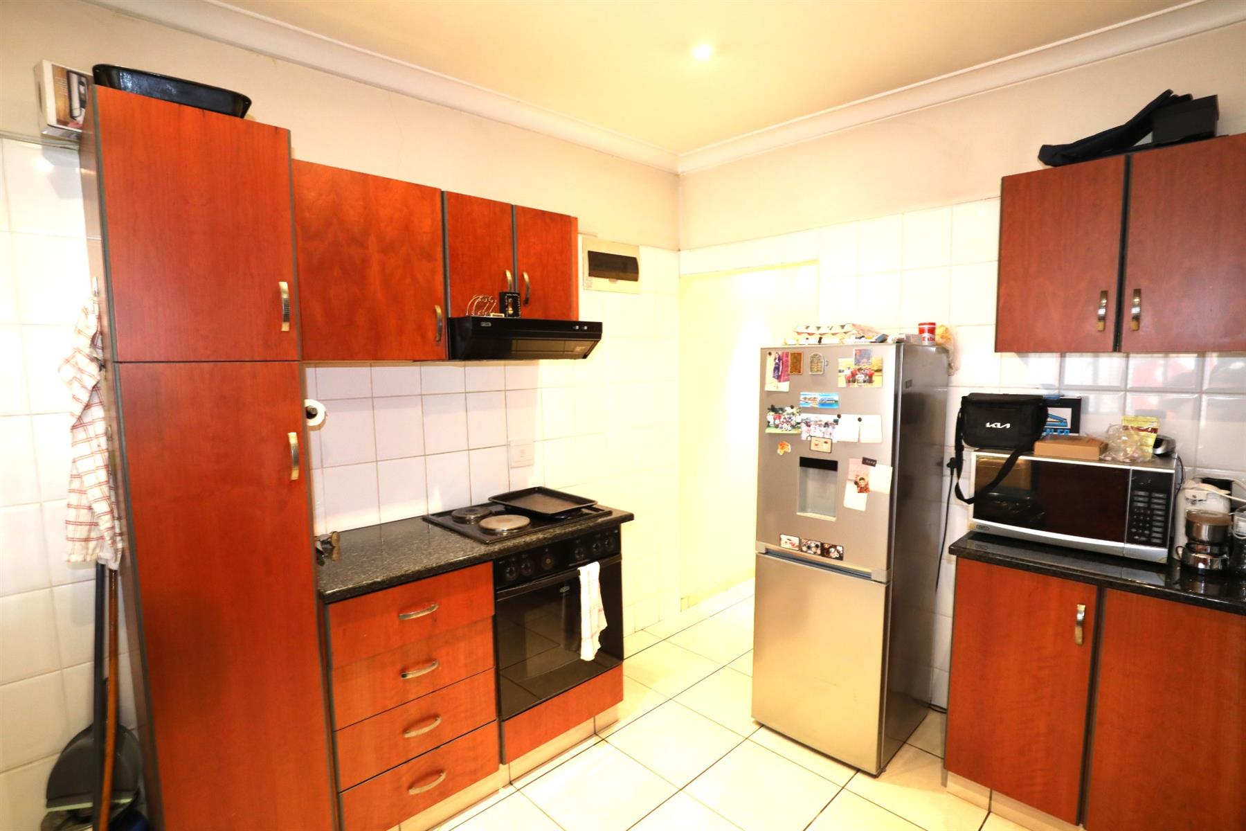 Additional features enhance the appeal of this property, including built-in cupboards for ample storage, stylish tiled floors throughout, and steel windows that offer durability and style. The bathrooms are fitted with a basin, shower, toilet, and bath, providing all the essentials you need. With room for a king-sized bed in the main bedroom and convenient washing machine connections, this apartment is truly designed for modern living.