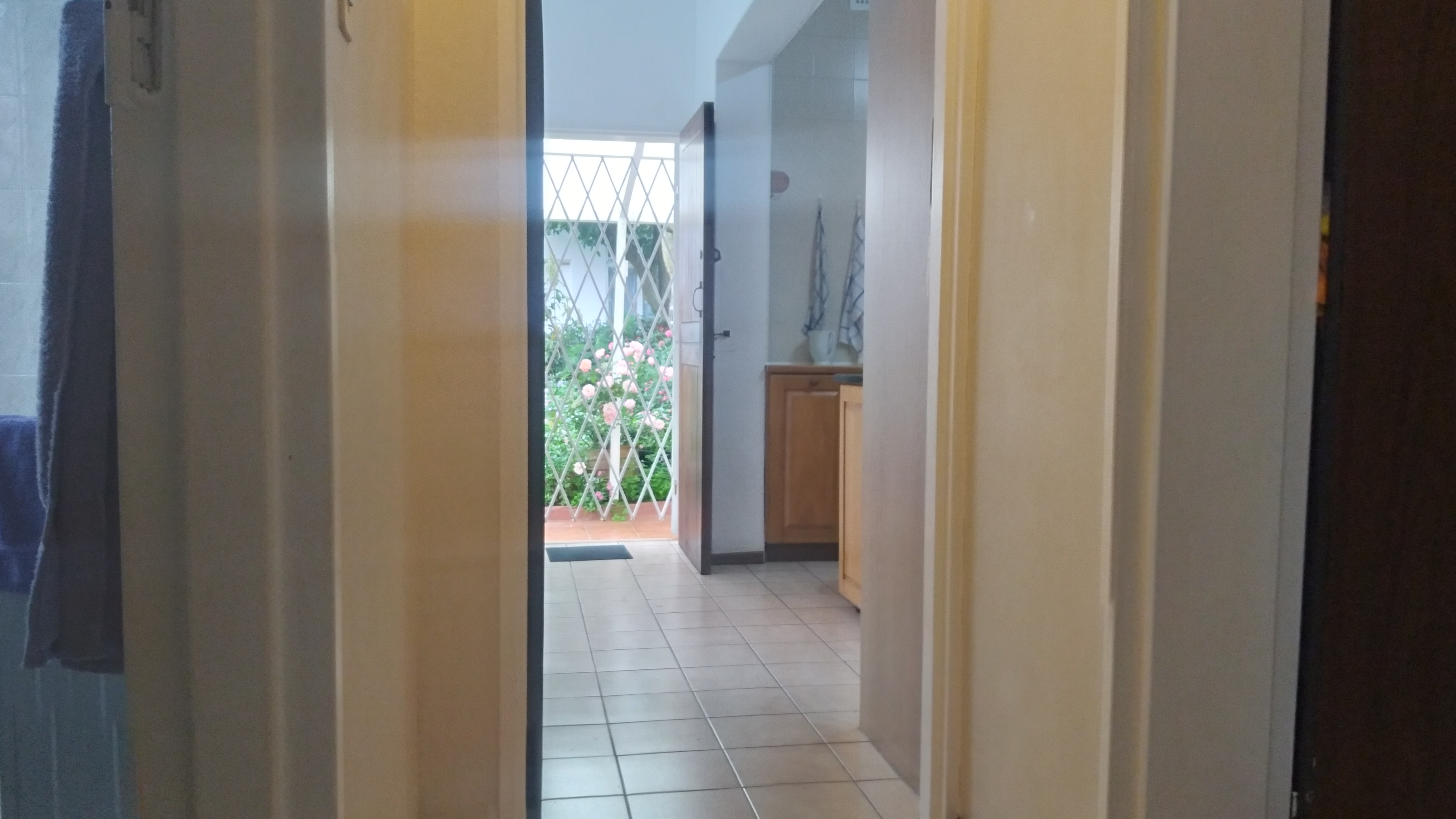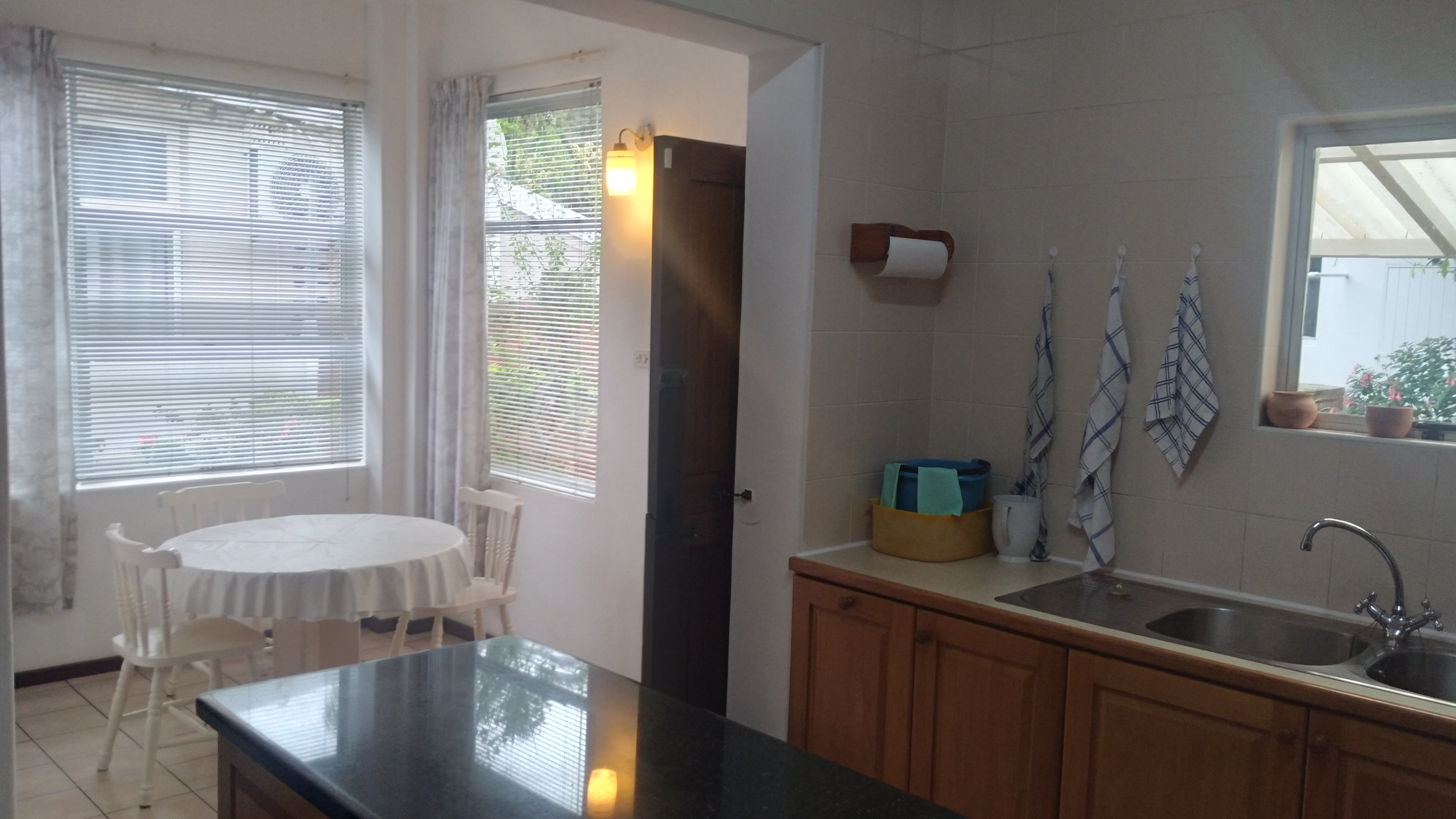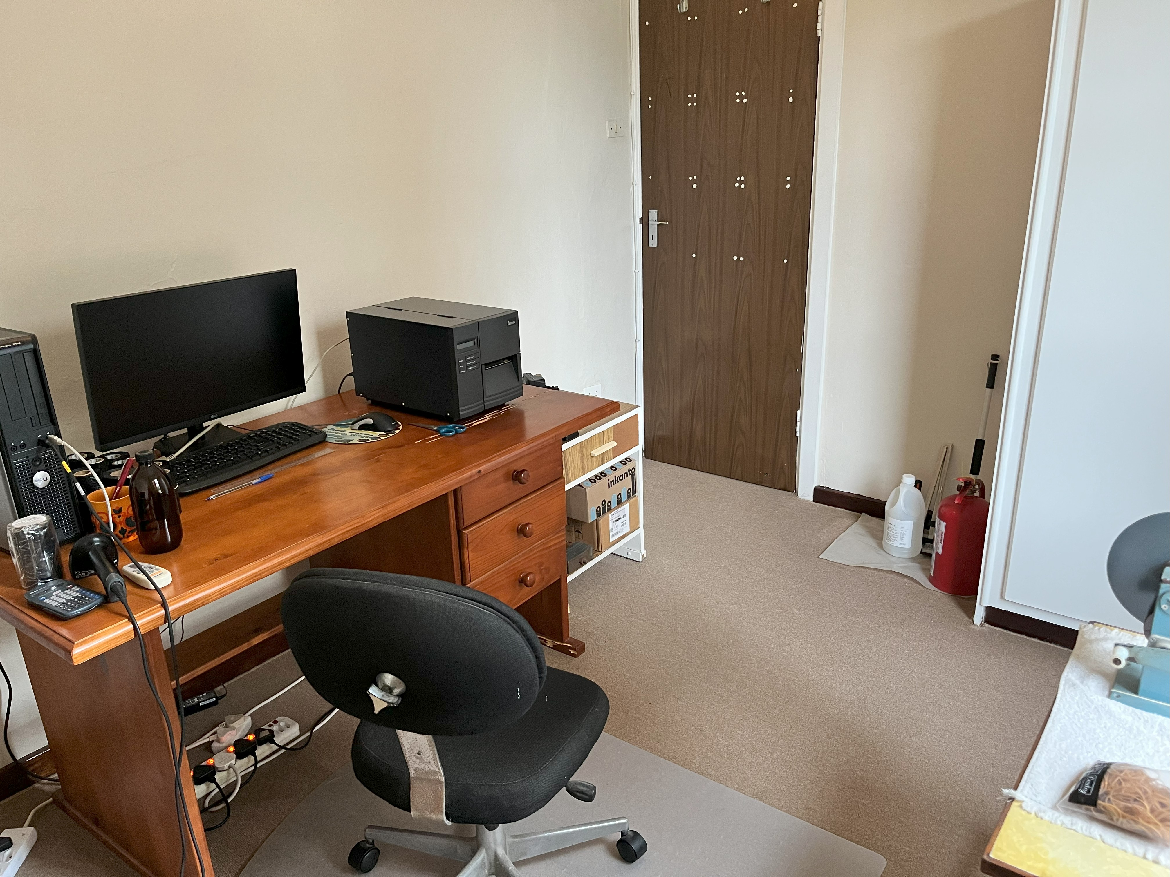 From the lounge/boardroom, a corridor leads to the bathroom with shower on the left and a pantry/Filing room to the right, creating a practical flow. At the end of the passage lies the tiled kitchen with granite counter tops and a cosy breakfast alcove that be converted to the printing and shredding room, perfectly positioned to overlook the colourful, tranquil flower garden, where vibrant blooms provide a peaceful backdrop for coffee breaks