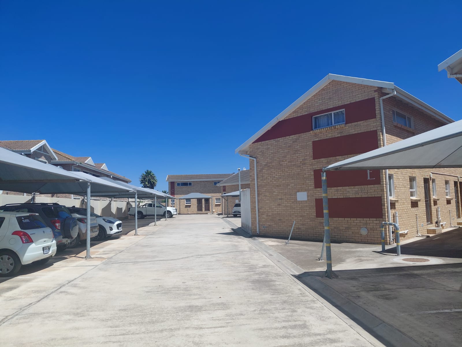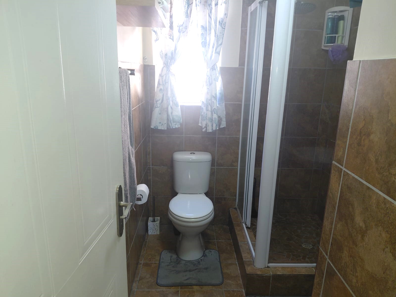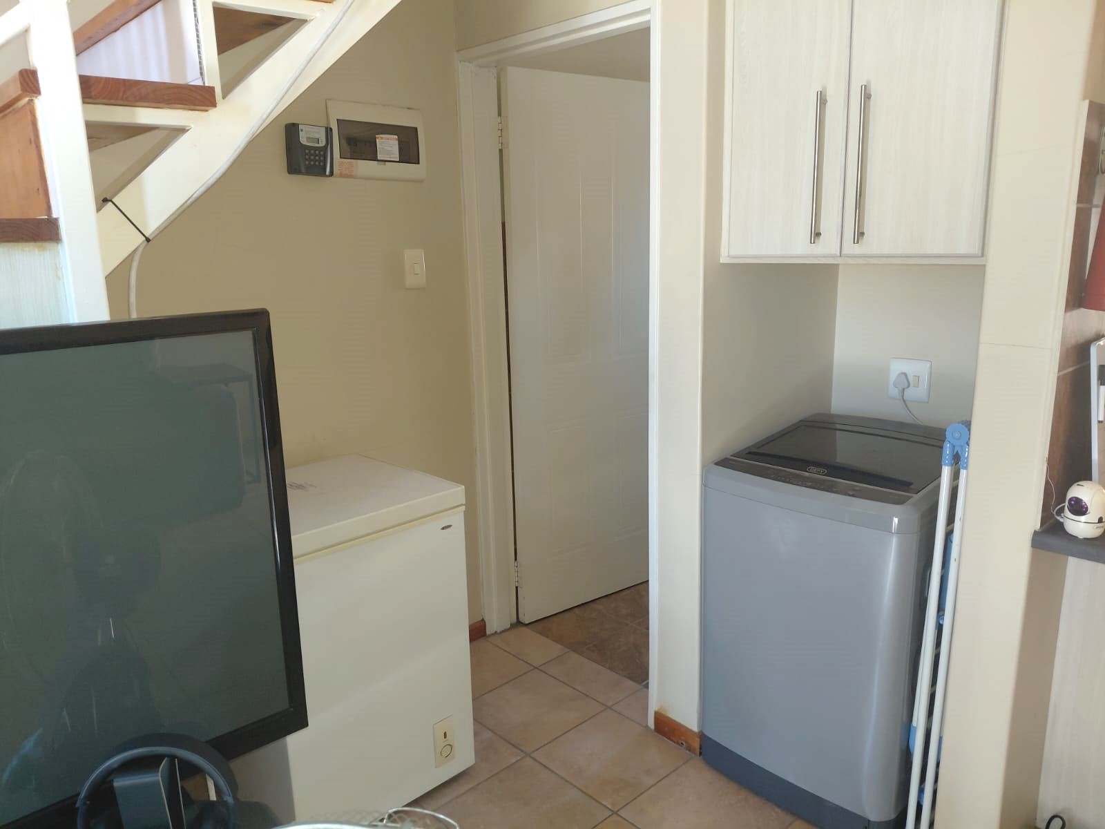 On the ground floor, you’ll find an open-plan lounge and kitchen, neatly tiled and well designed. The kitchen offers built-in cupboards, an electric stove with hob, double basin, and space for a washing machine.