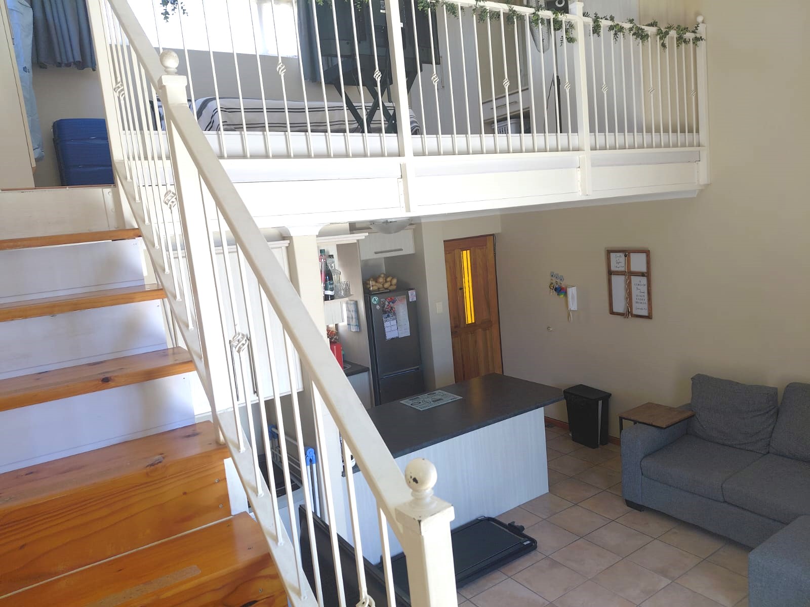 The unit features one spacious bedroom on the upper level, accessed via elegant wooden stairs. The bedroom boasts beautiful wooden floors, ample built-in cupboards, and a warm, inviting atmosphere.