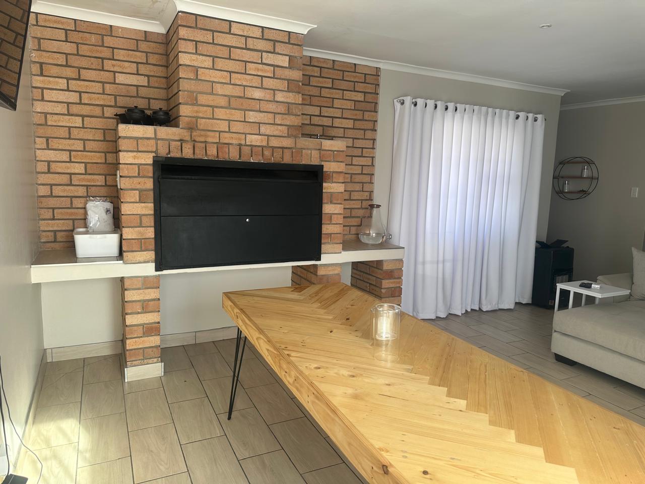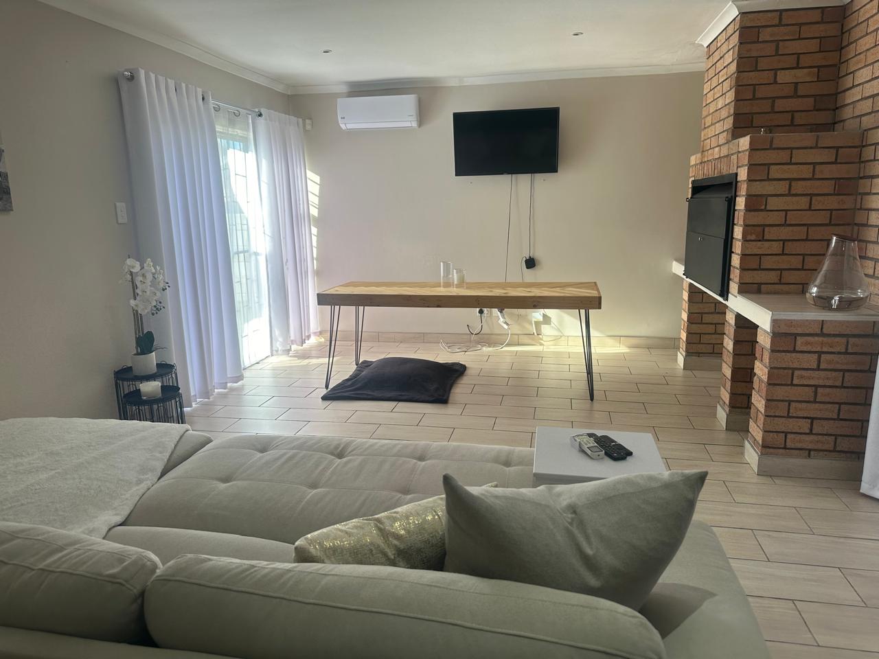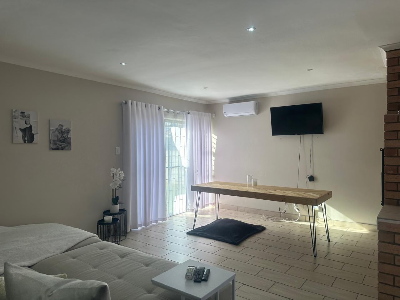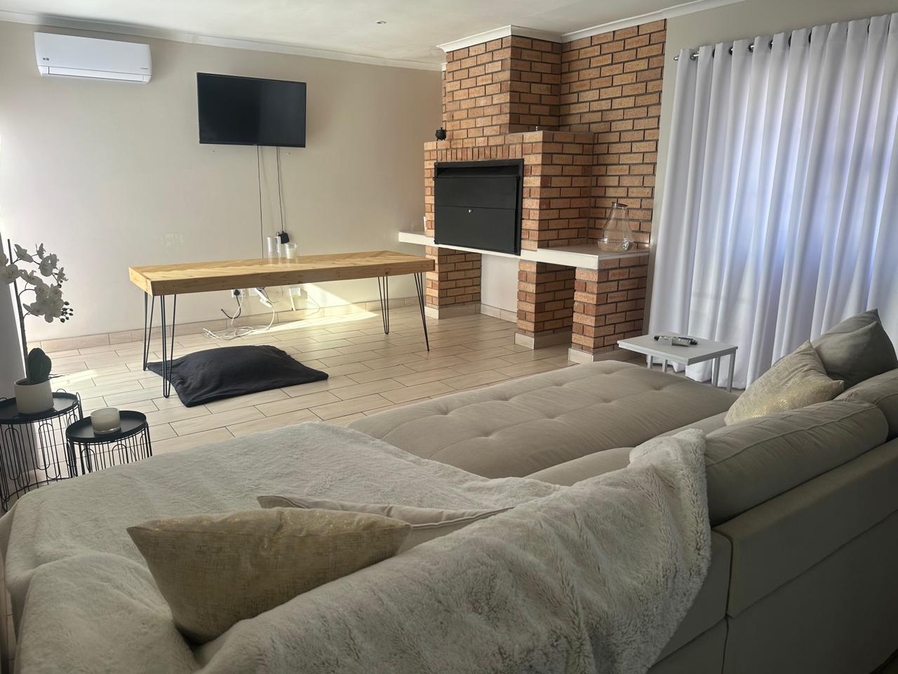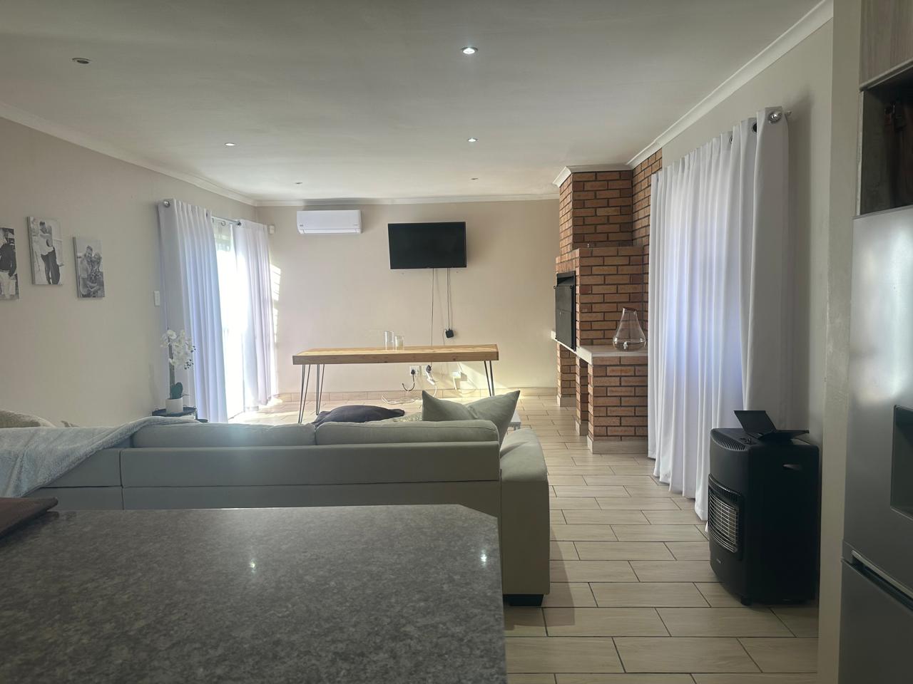 Stylish open plan kitchen with undercover over, hob, extraction fan, lovely spacious counter tops with built-in-cupboards, and fully tiled plus scullery/laundry area. Flowing onto living a braai area with a sliding door to the back garden. Also fitted with a aircon for warmer and cooler days.