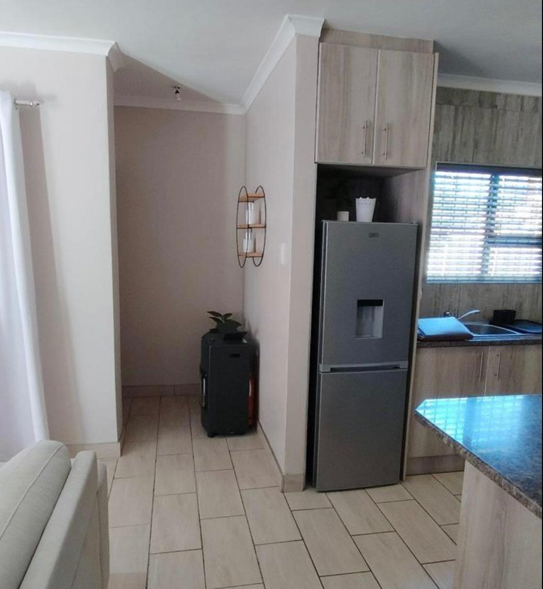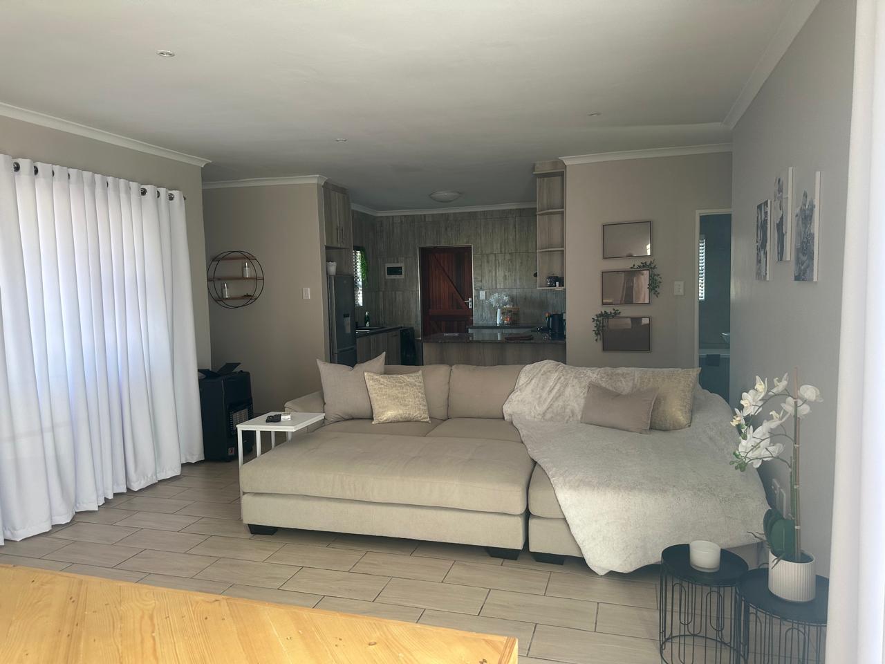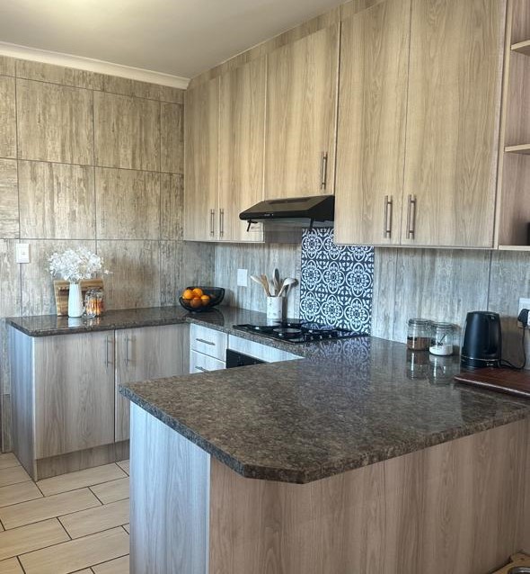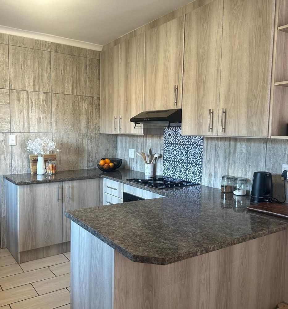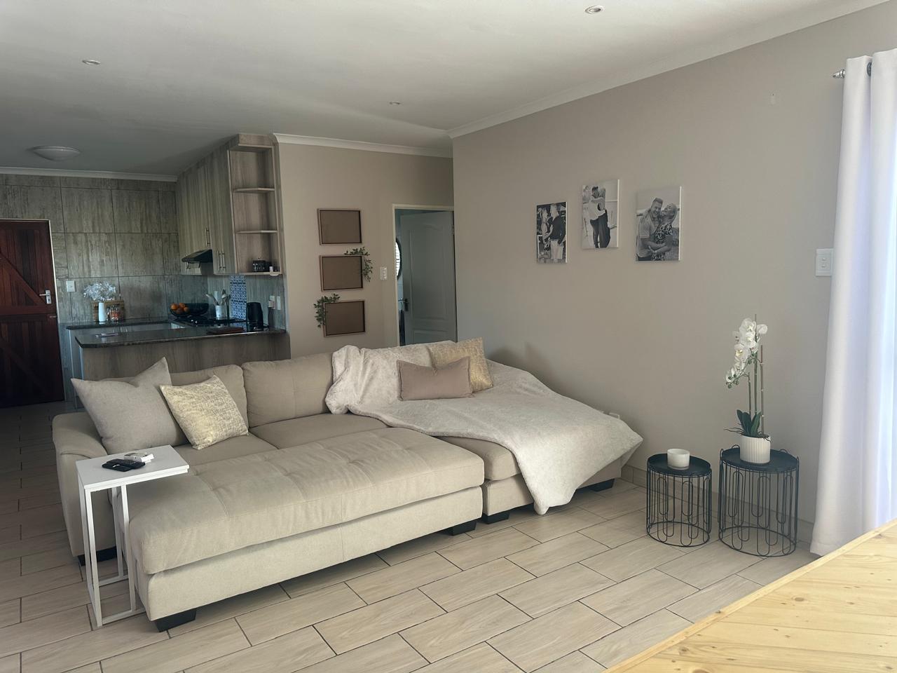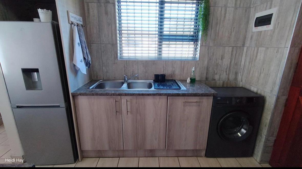 Stylish open plan kitchen with undercover over, hob, extraction fan, lovely spacious counter tops with built-in-cupboards, and fully tiled plus scullery/laundry area. Flowing onto living a braai area with a sliding door to the back garden. Also fitted with a aircon for warmer and cooler days.