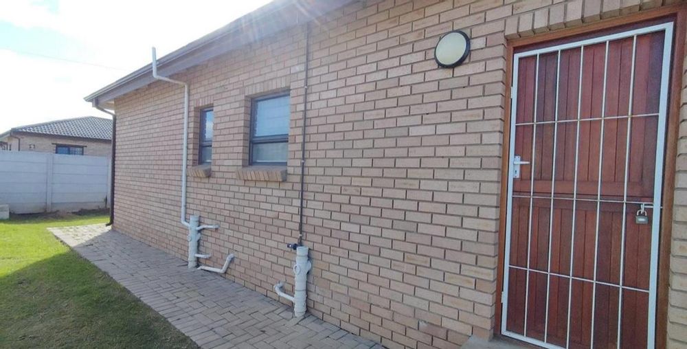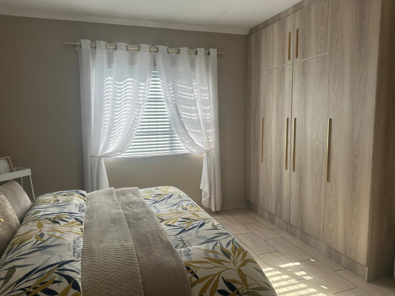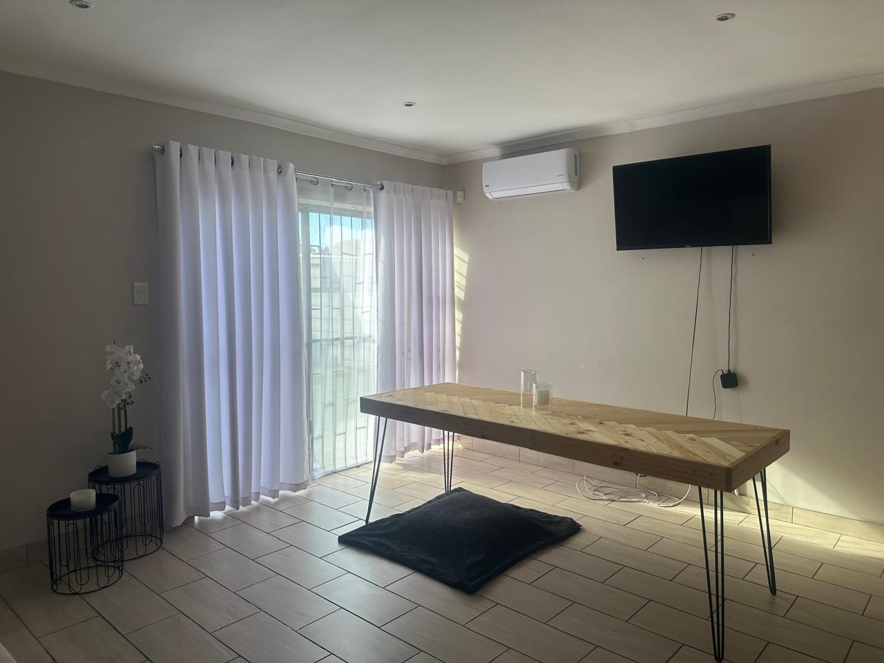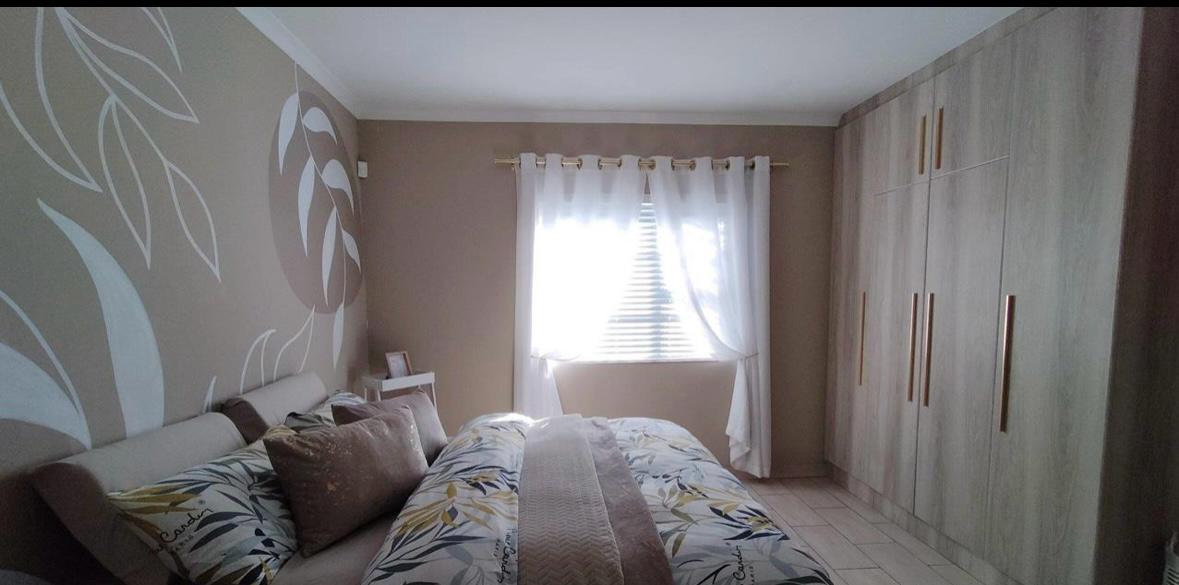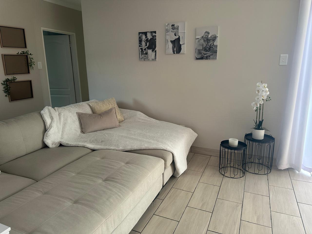 Stylish open plan kitchen with undercover over, hob, extraction fan, lovely spacious counter tops with built-in-cupboards, and fully tiled plus scullery/laundry area. Flowing onto living a braai area with a sliding door to the back garden. Also fitted with a aircon for warmer and cooler days.