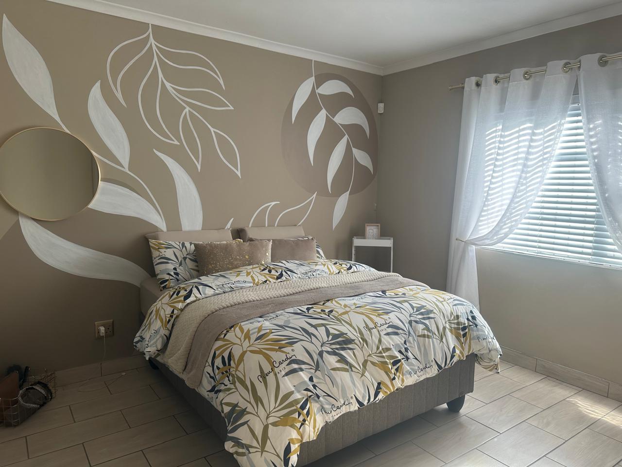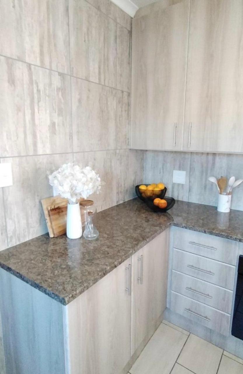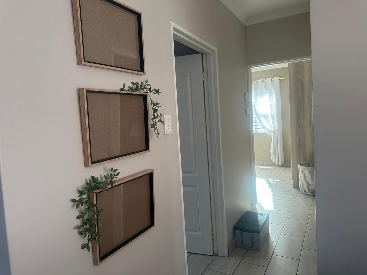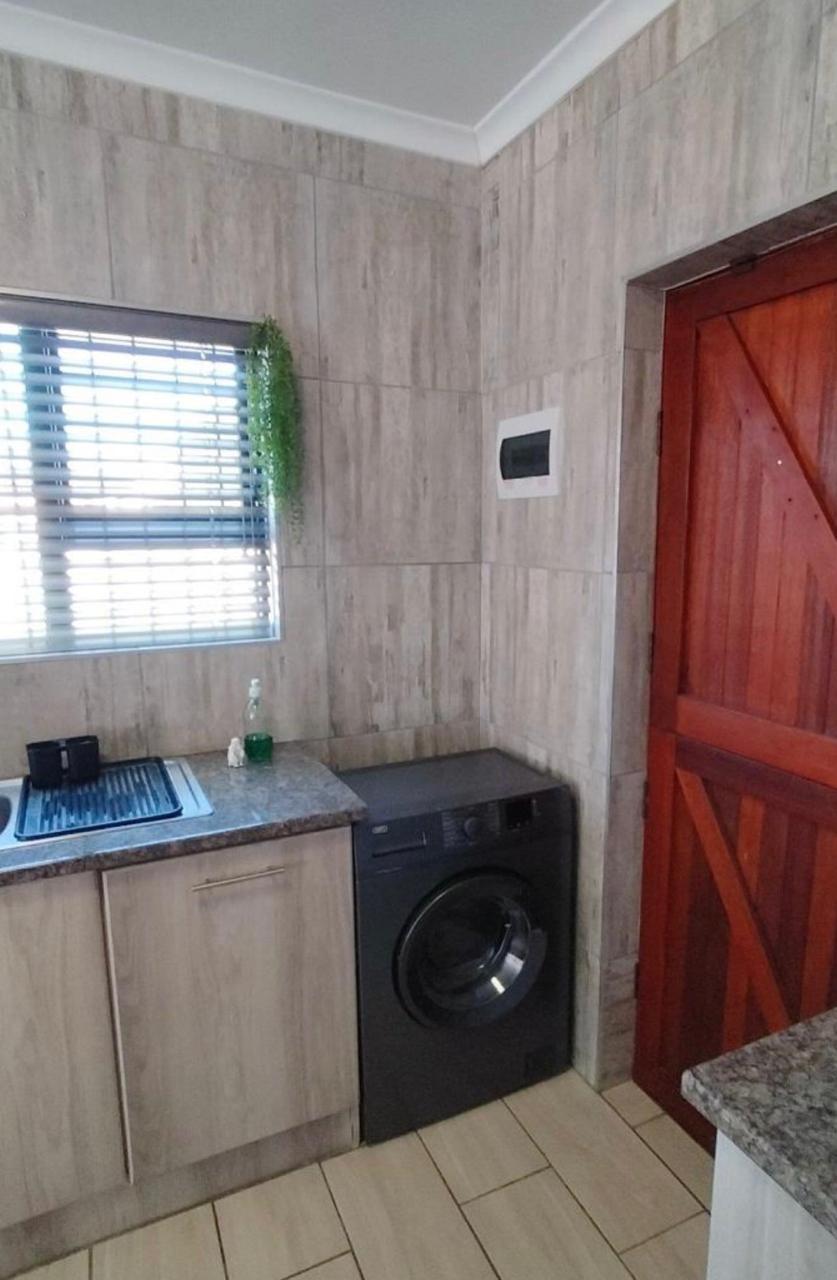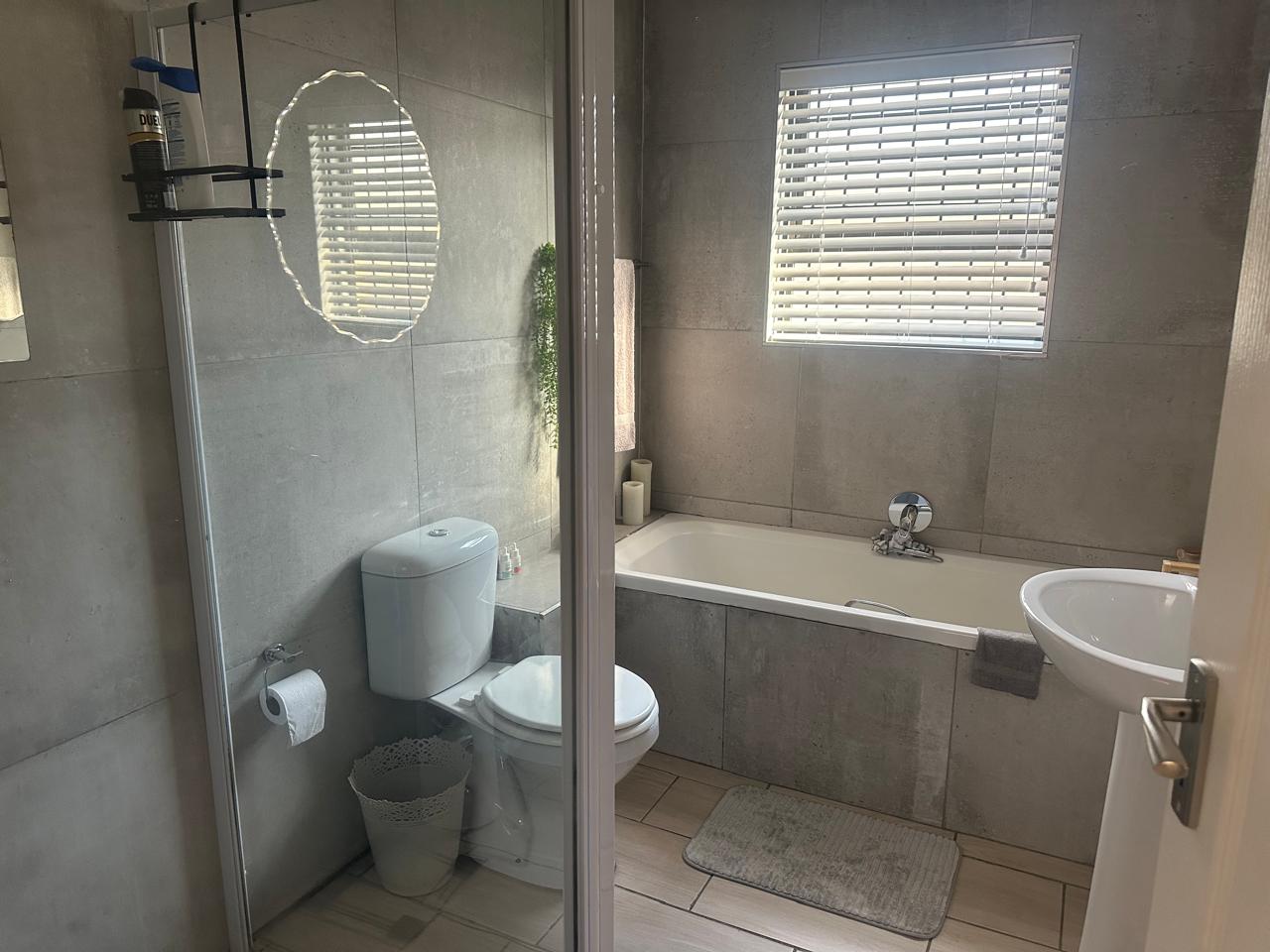 Stylish open plan kitchen with undercover over, hob, extraction fan, lovely spacious counter tops with built-in-cupboards, and fully tiled plus scullery/laundry area. Flowing onto living a braai area with a sliding door to the back garden. Also fitted with a aircon for warmer and cooler days.