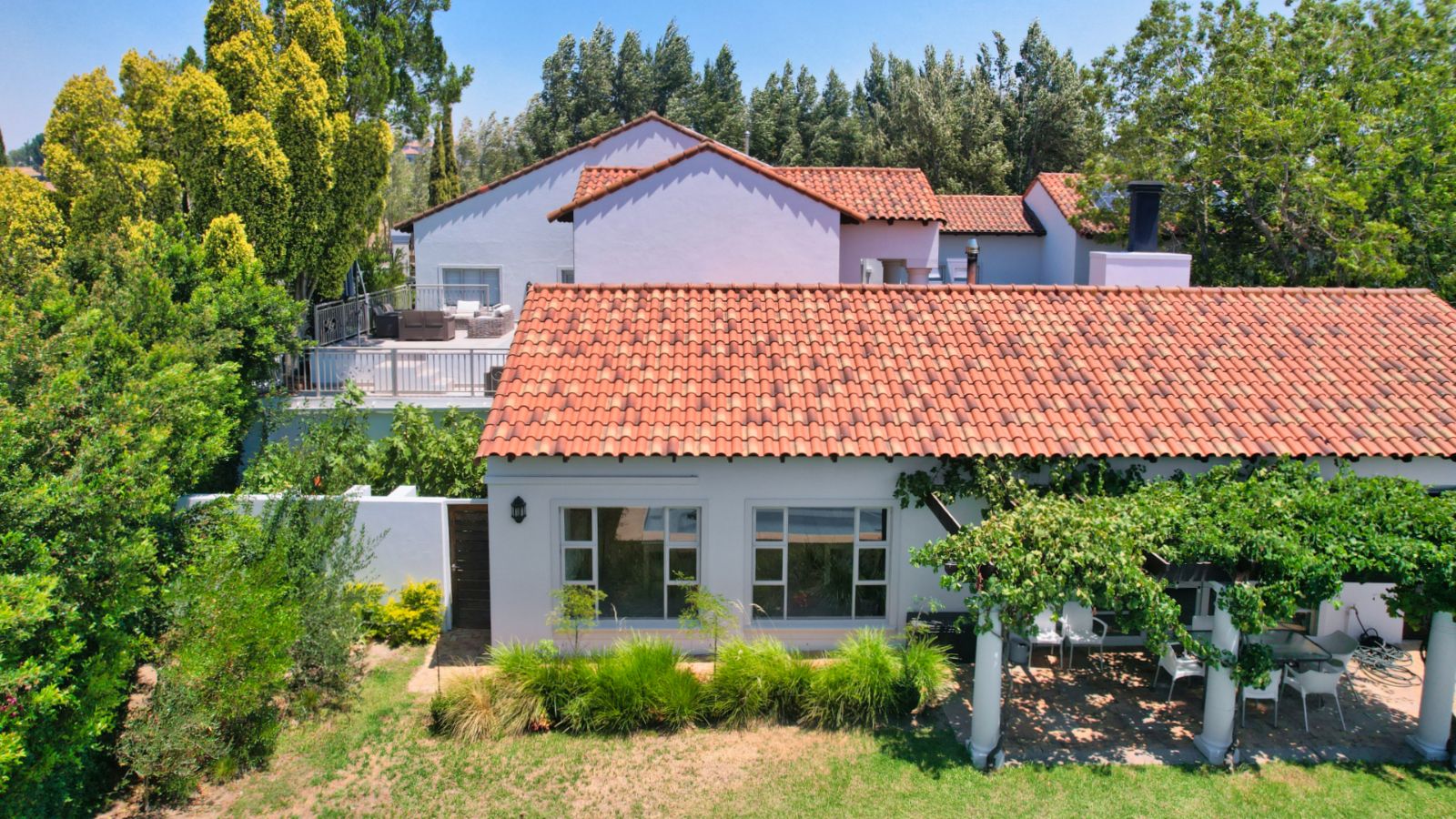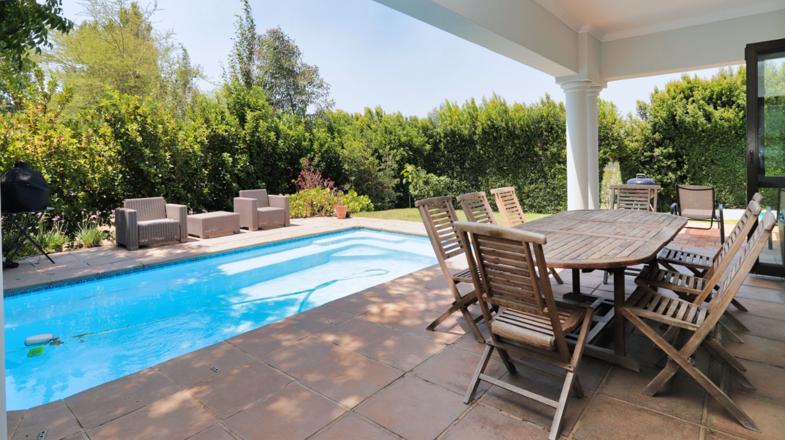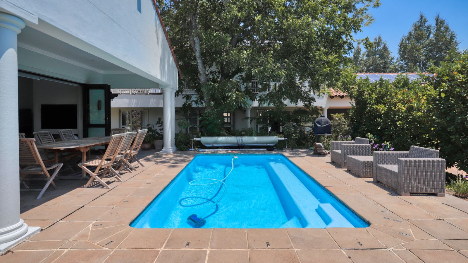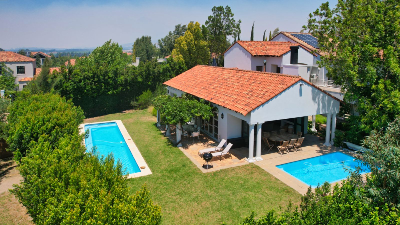 Outdoor living is a standout feature of this home. Two swimming pools, generous entertainment areas, and an upstairs balcony overlooking the garden offer a variety of spaces to enjoy the surroundings and make the most of the Winelands lifestyle.