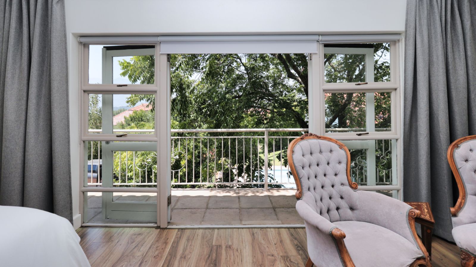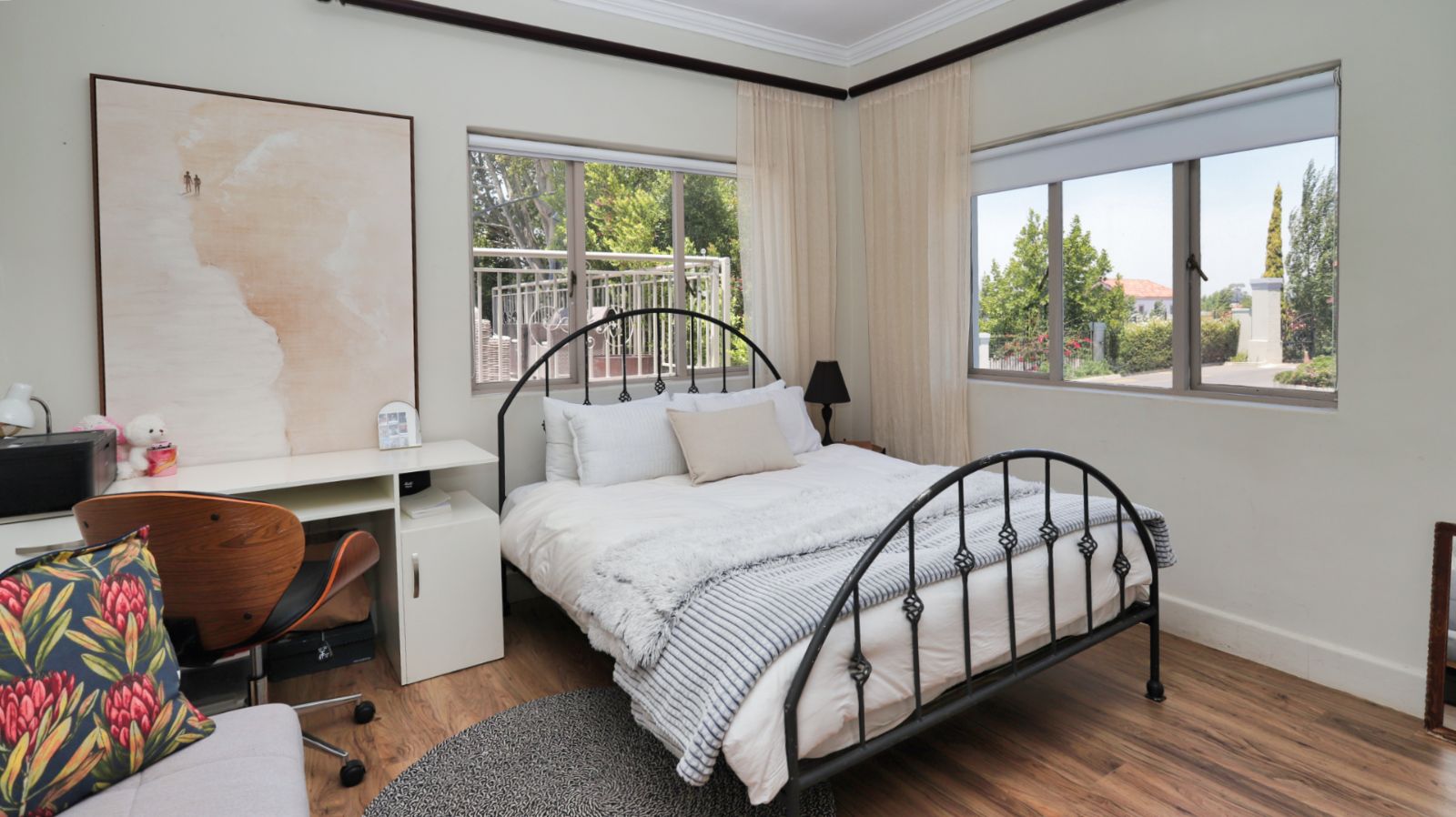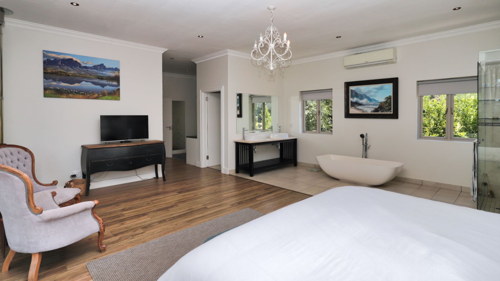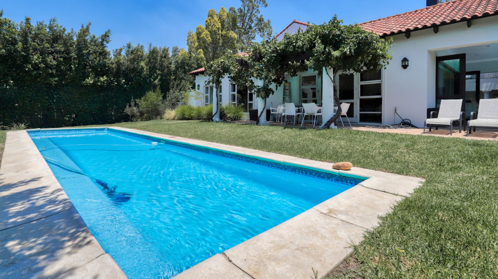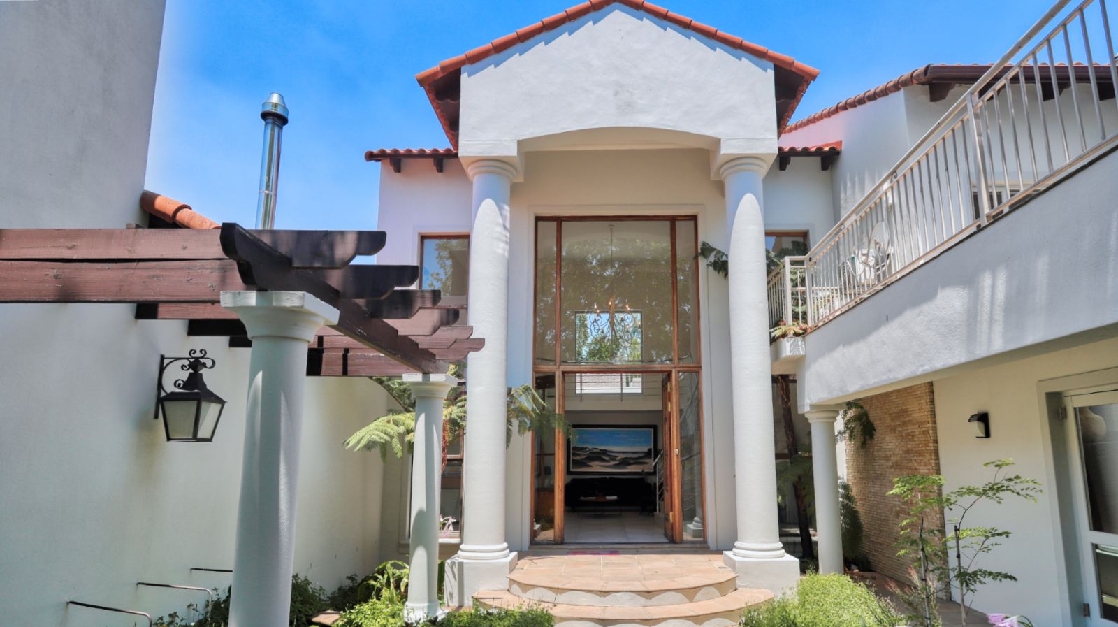 Outdoor living is a standout feature of this home. Two swimming pools, generous entertainment areas, and an upstairs balcony overlooking the garden offer a variety of spaces to enjoy the surroundings and make the most of the Winelands lifestyle.