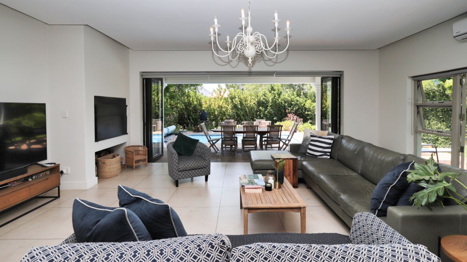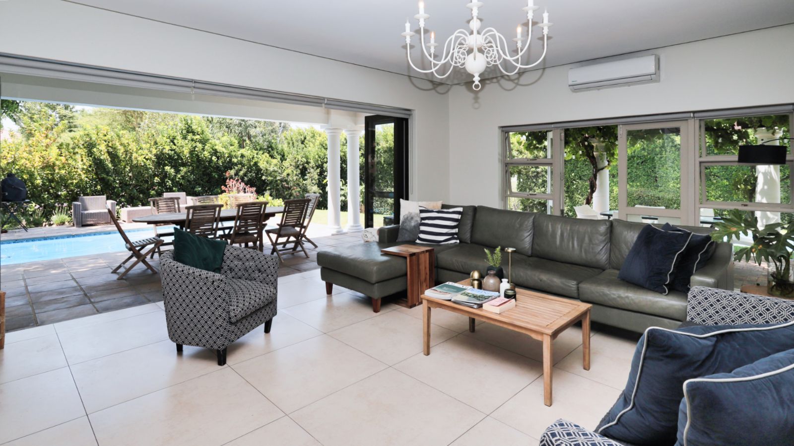 Multiple living and entertainment areas, including an indoor braai room and comfortable lounges, allow for easy living across all seasons. Large openings connect the home seamlessly to the outdoor spaces, where the garden and swimming pools create an inviting setting for summer days and relaxed evenings.
