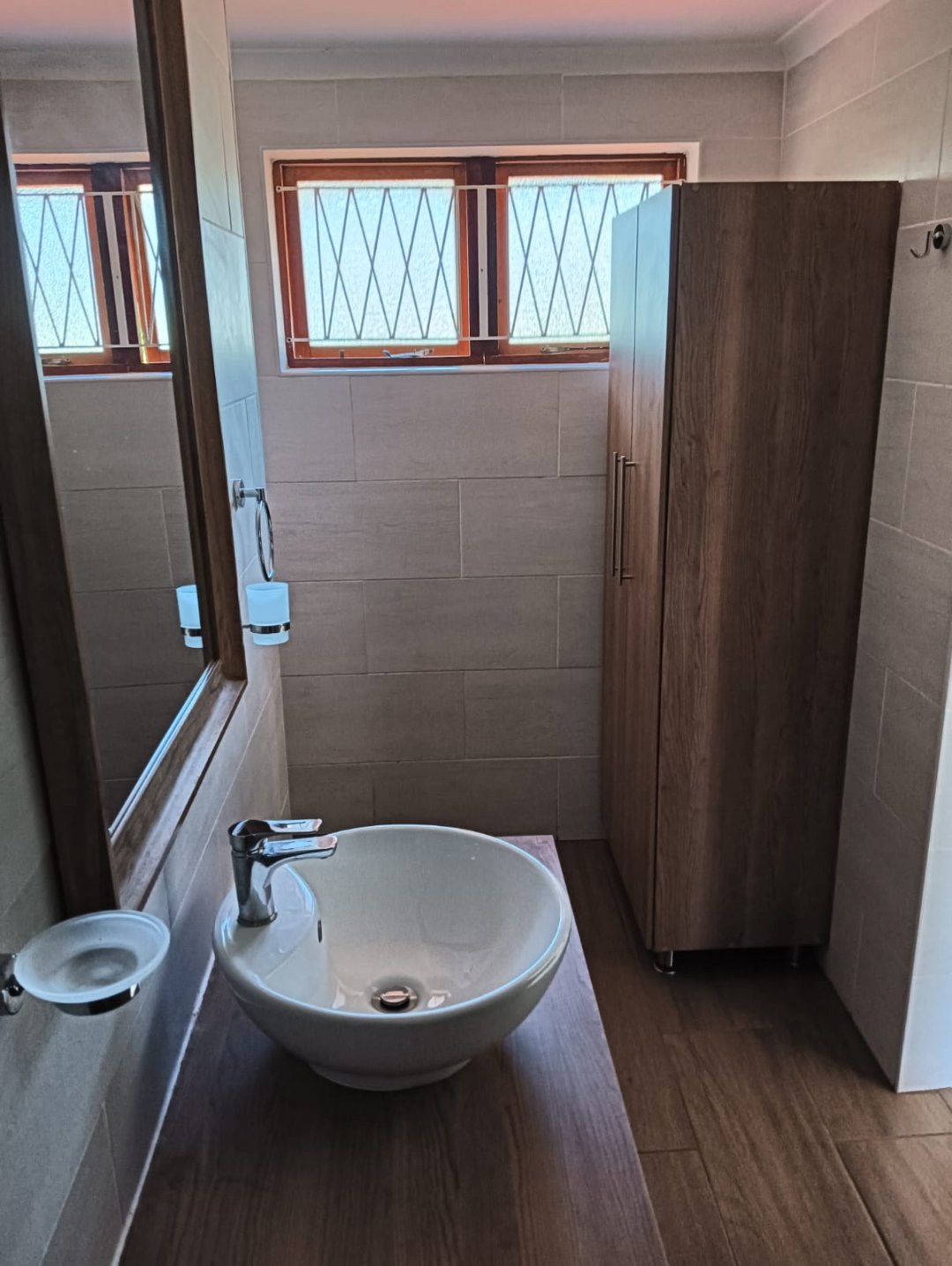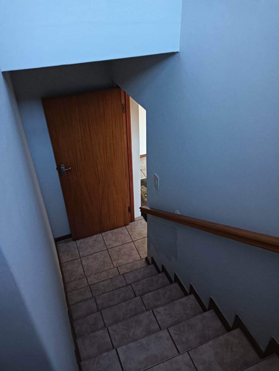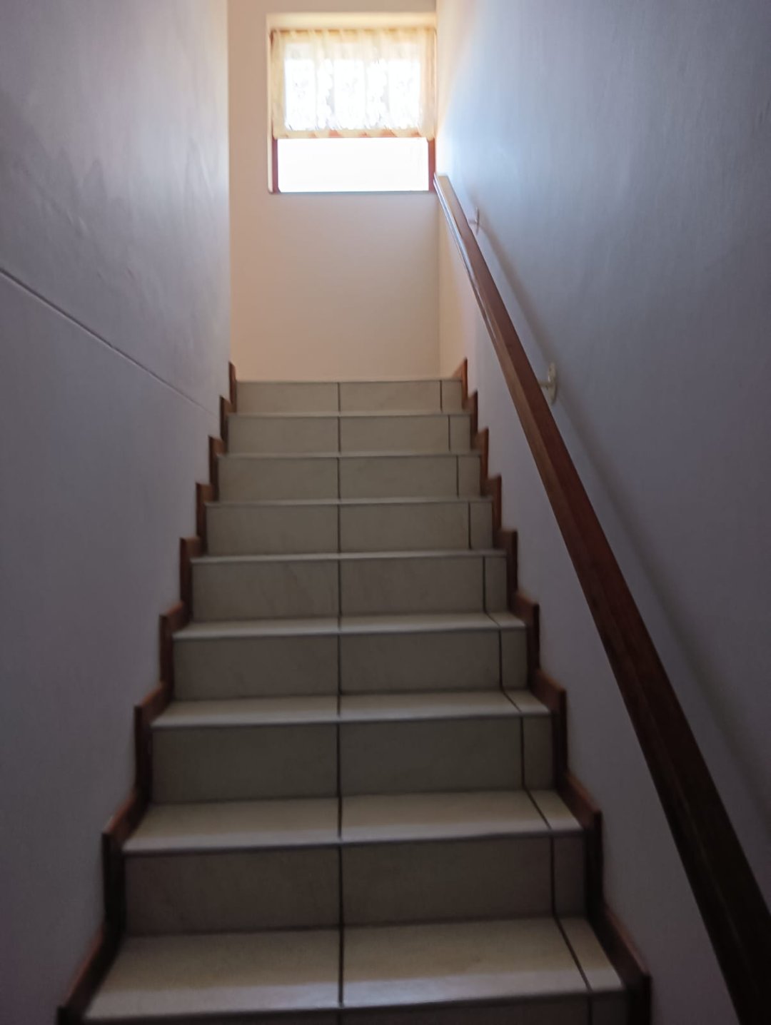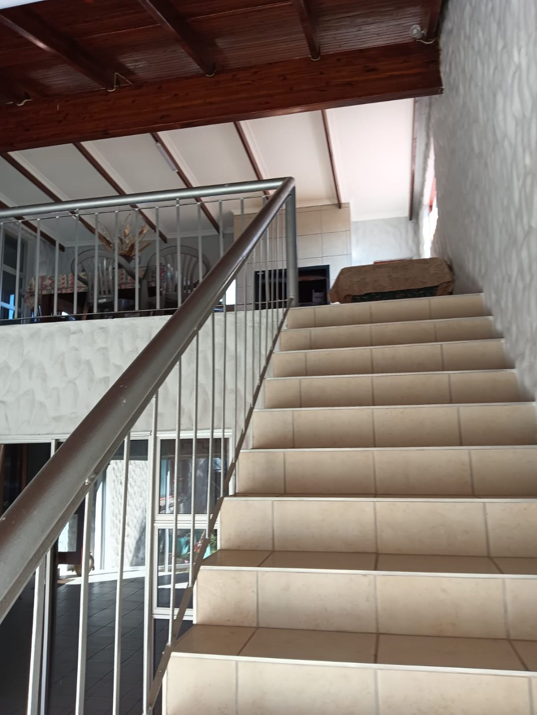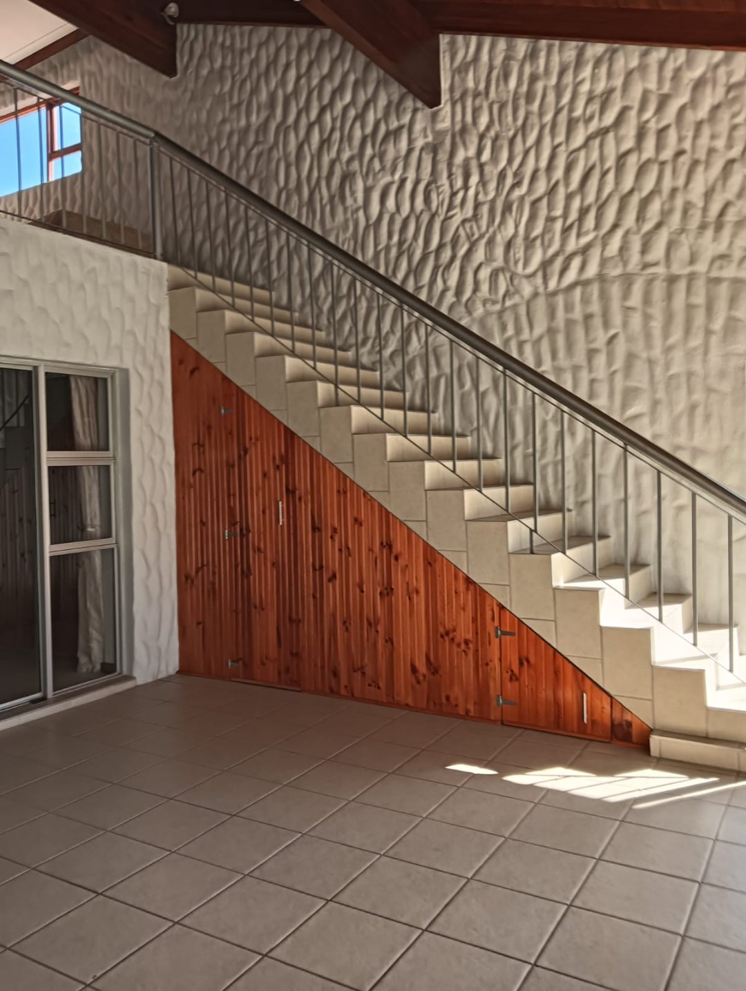 A staircase leads to a spacious living room and entertainment area, which includes a built-in braai and a separate toilet with a basin.