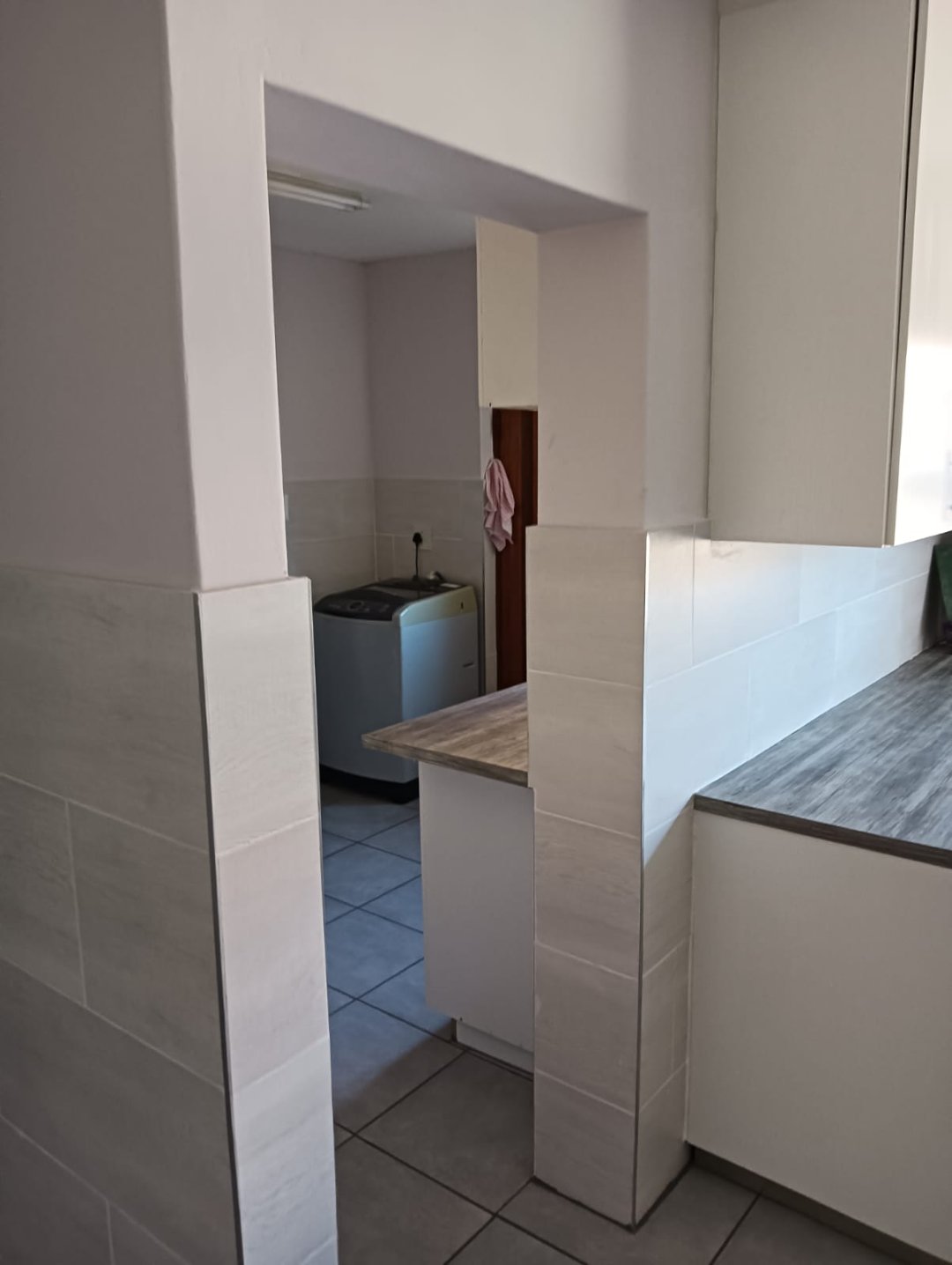 The fitted kitchen comes with a built-in stove and oven, along with a separate laundry/scullery.