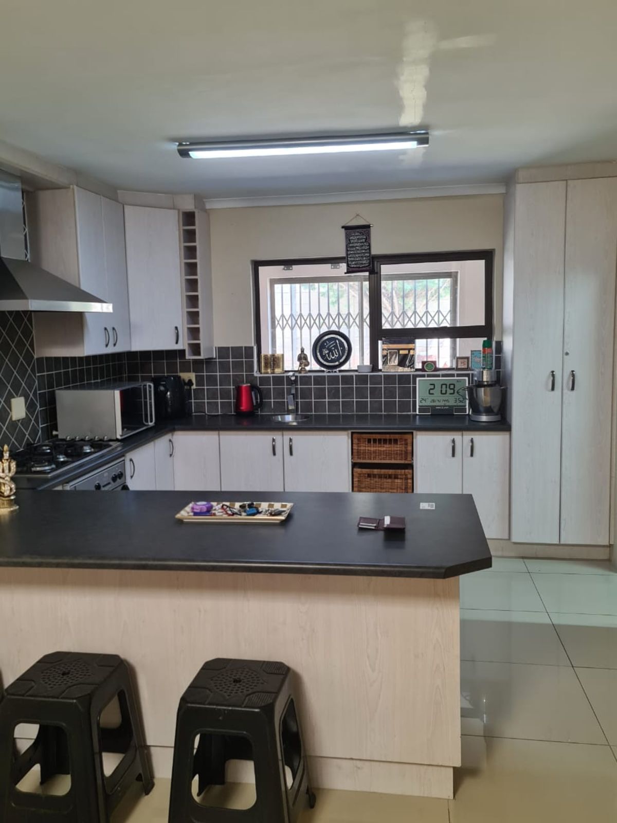 A breakfast counter provides the perfect spot for casual meals while a separate scullery keeps the main kitchen clutter-free.