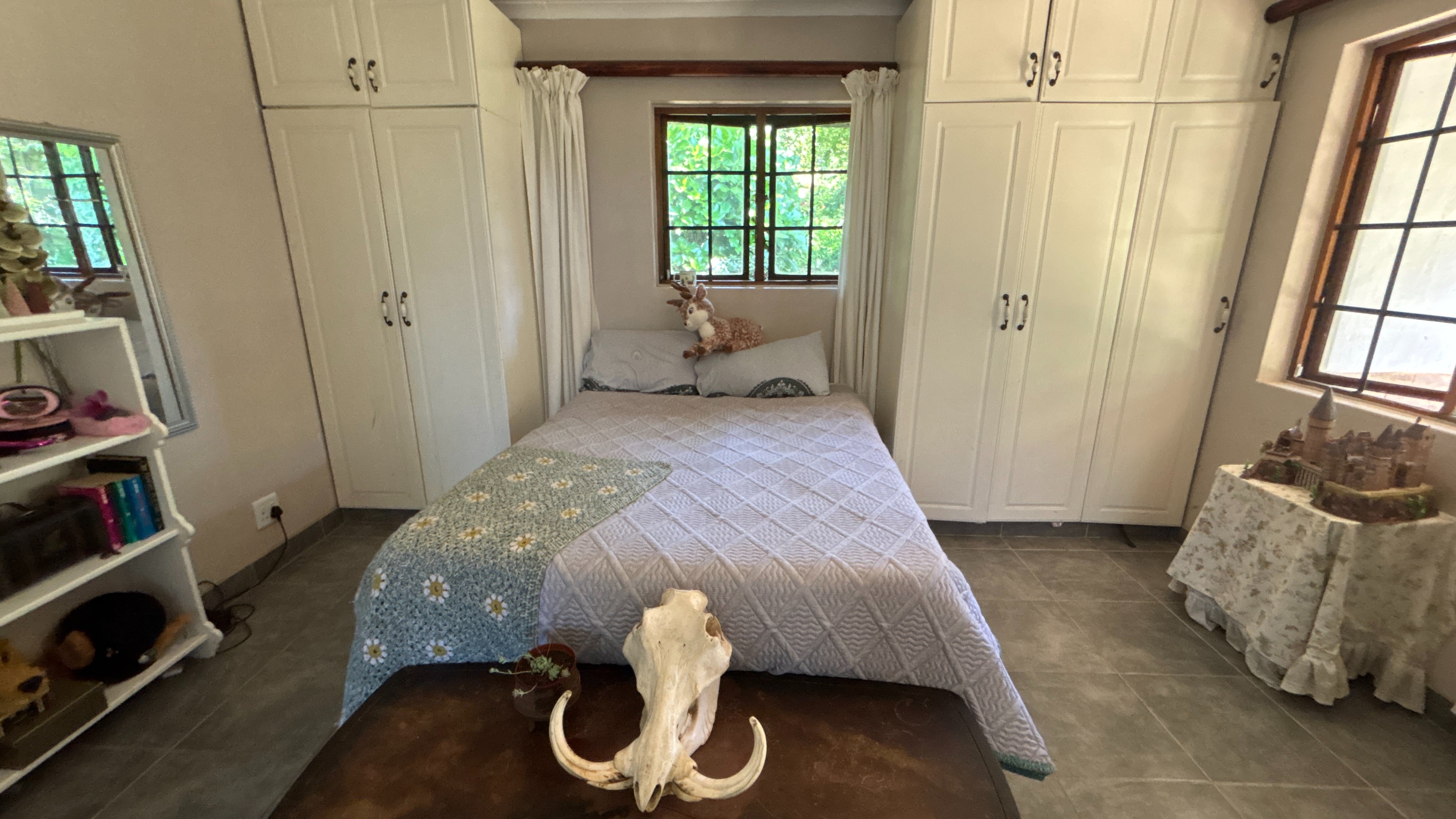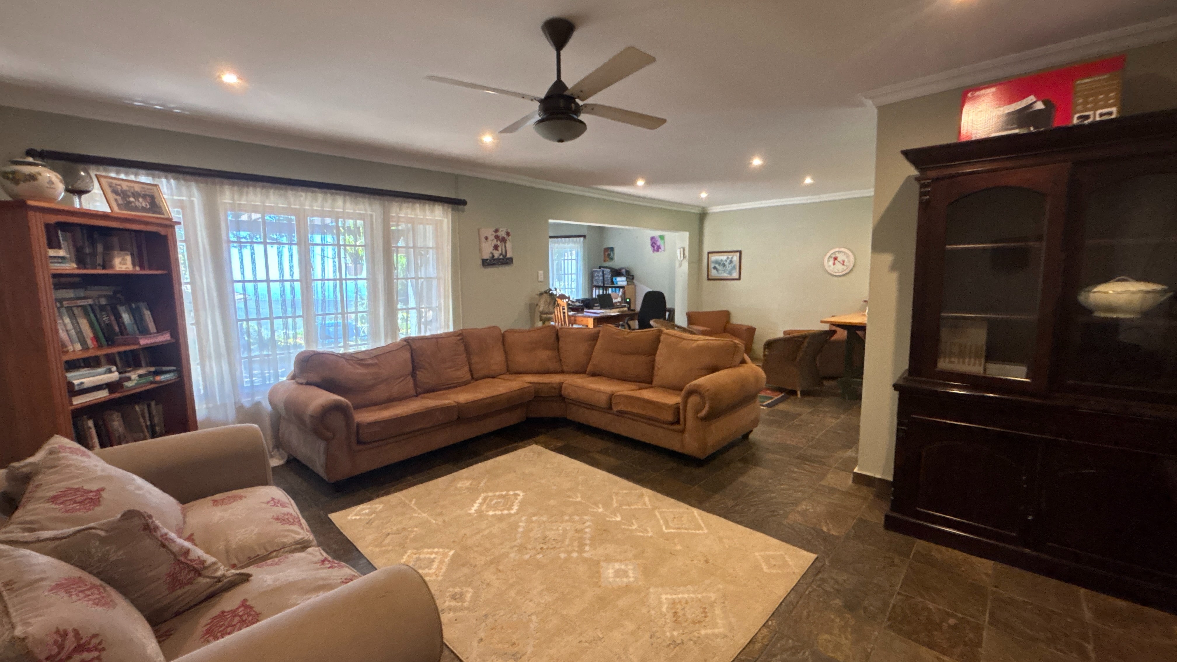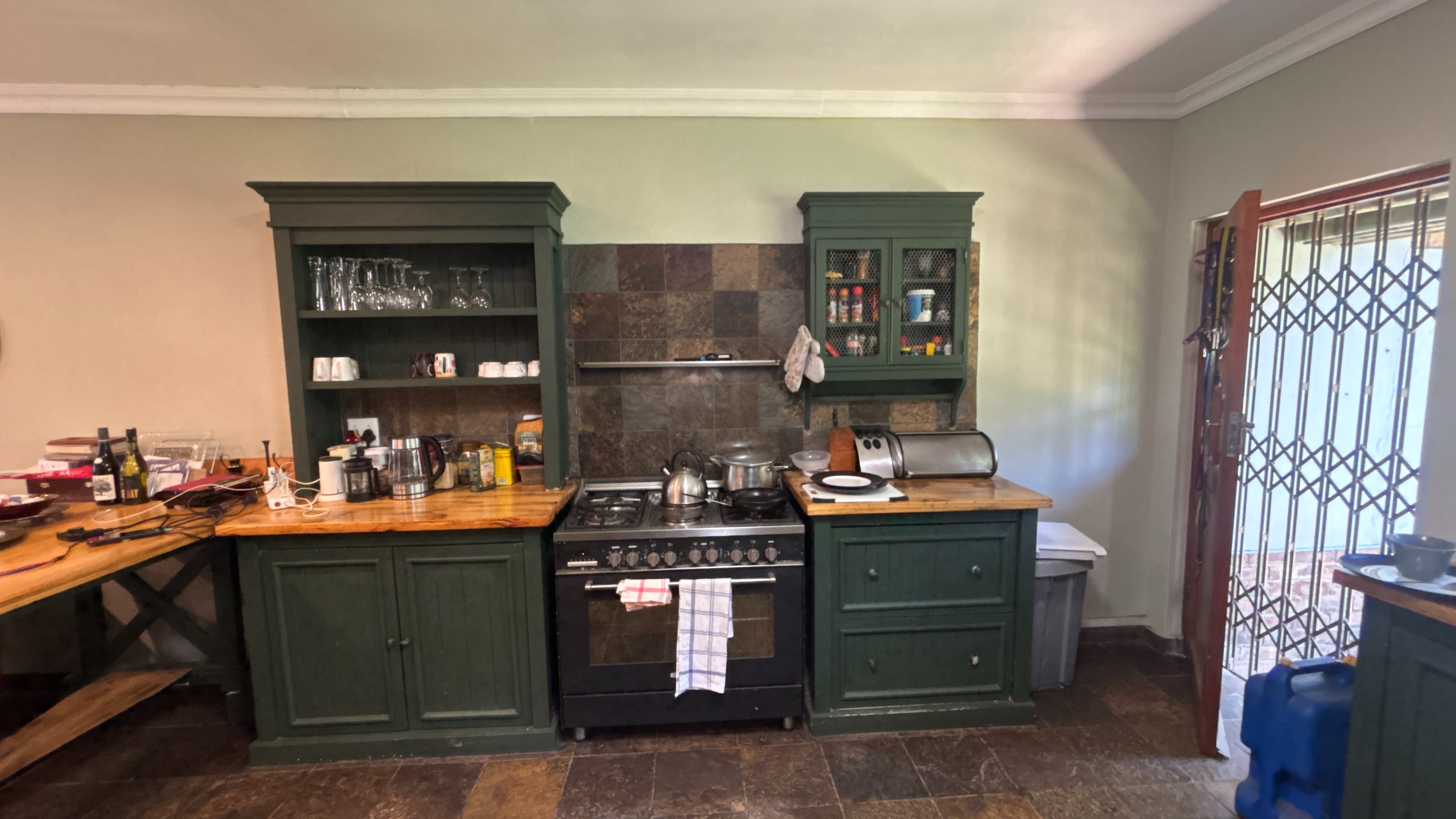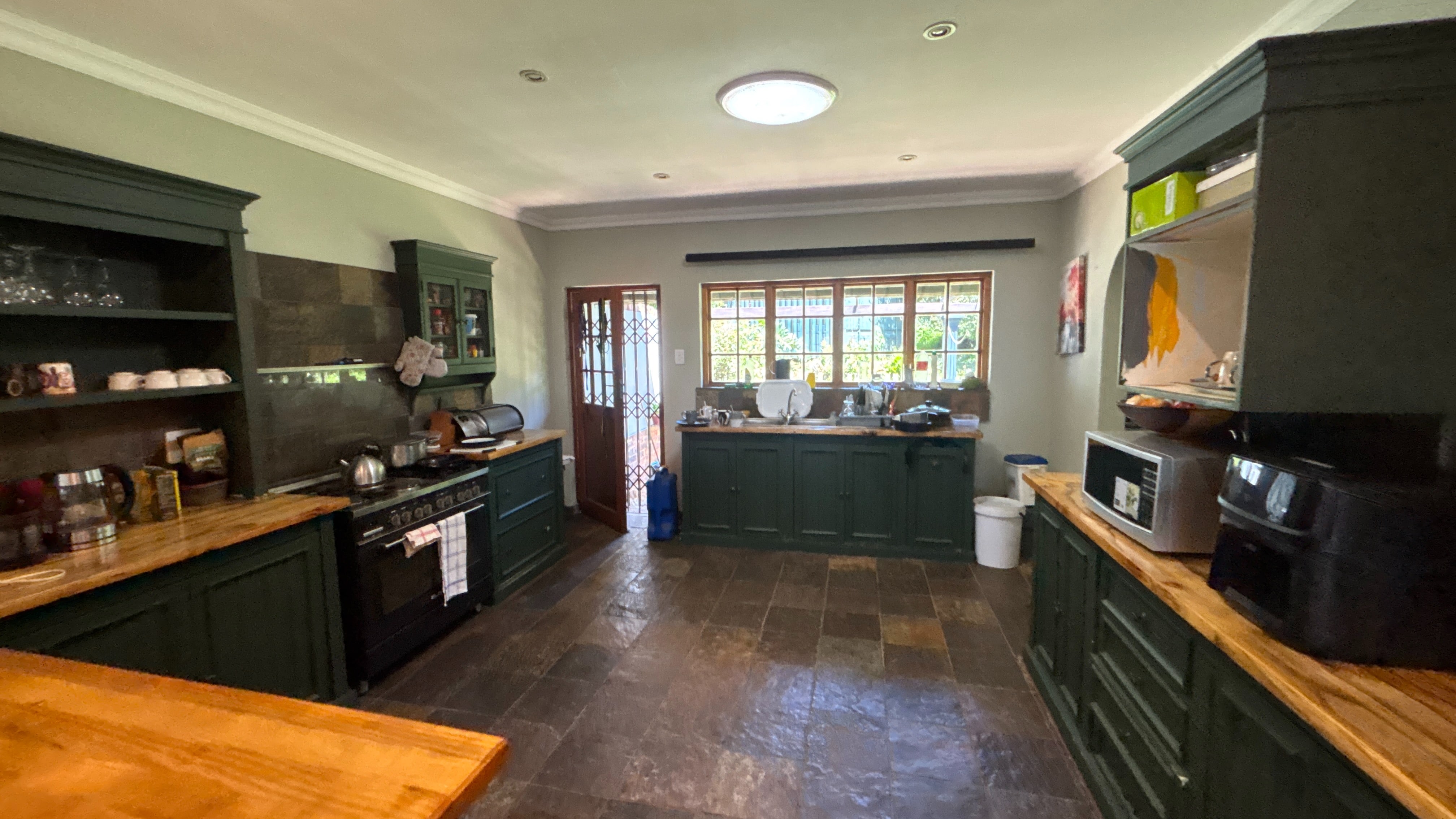 The main house is currently divided into two sections. The first is a comfortable two-bed, two-bath layout. The kitchen has wooden countertops, a standalone oven and a scullery that offers extra storage and workspace. It links well to the rest of the living area, which includes a lounge, a study nook and a breakfast bar. The main bedroom has an ensuite bathroom, and the second bathroom serves as a practical family option. Both bedrooms are a good size, and the overall flow makes this section suitable for day-to-day living.