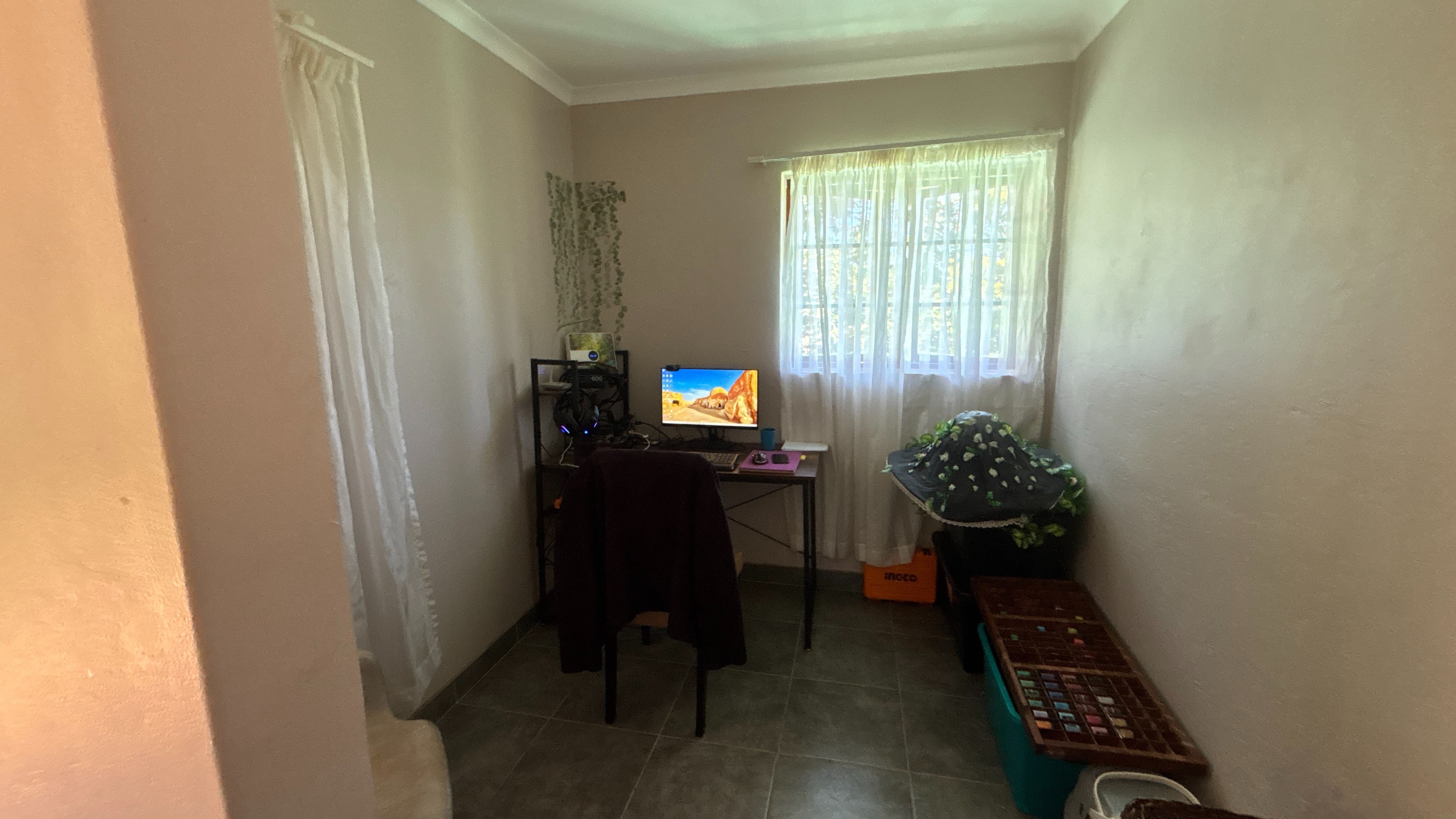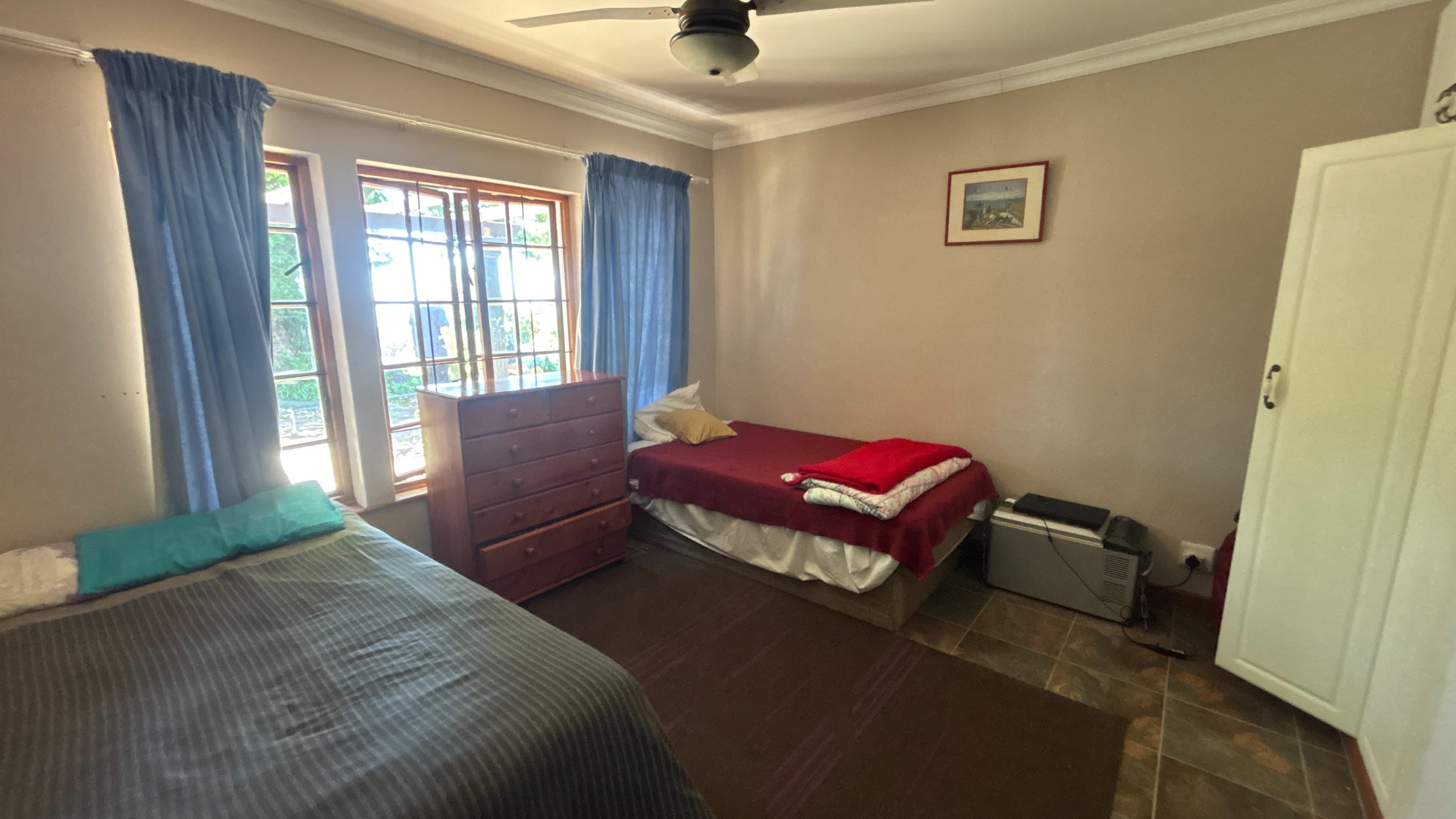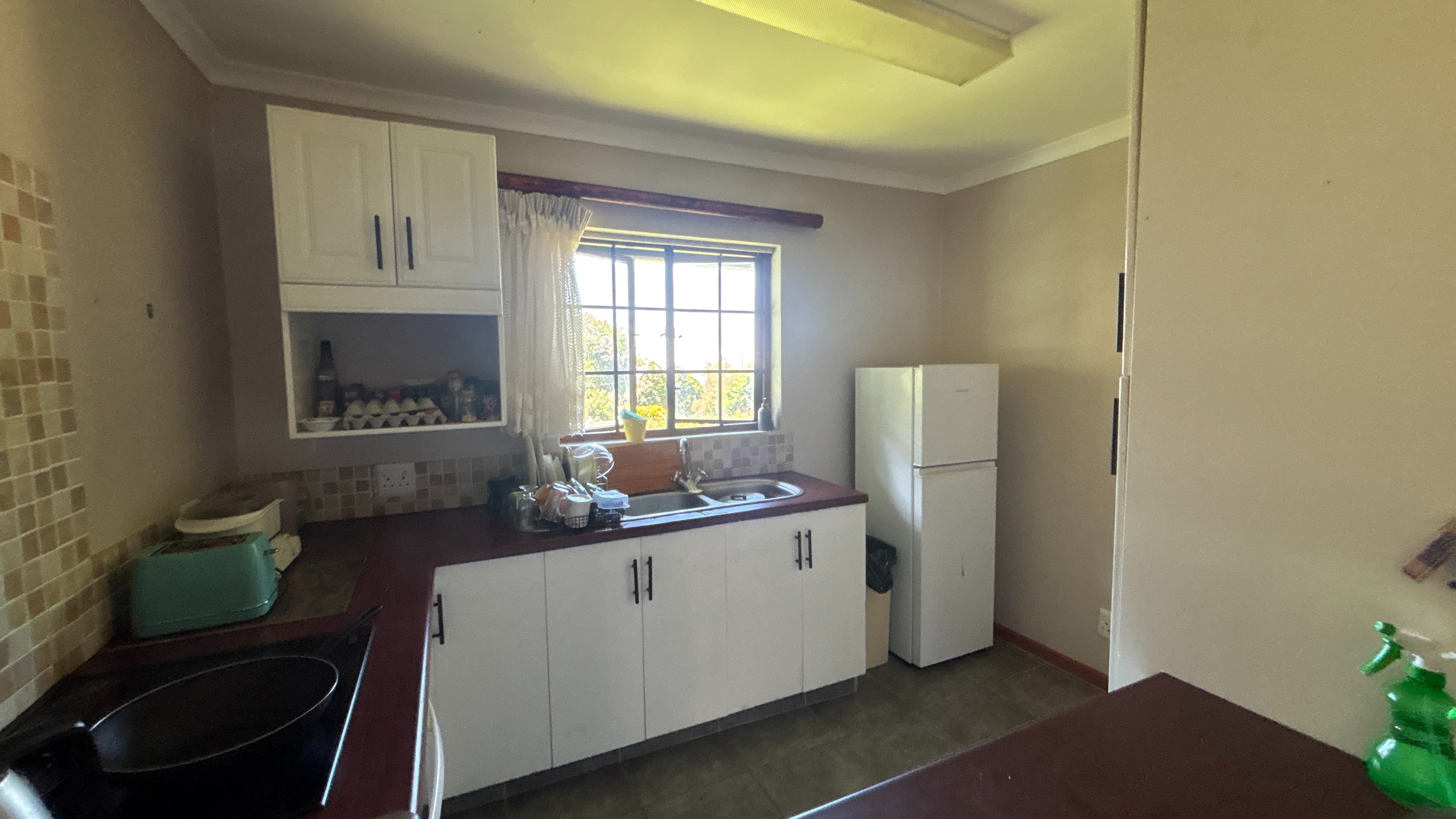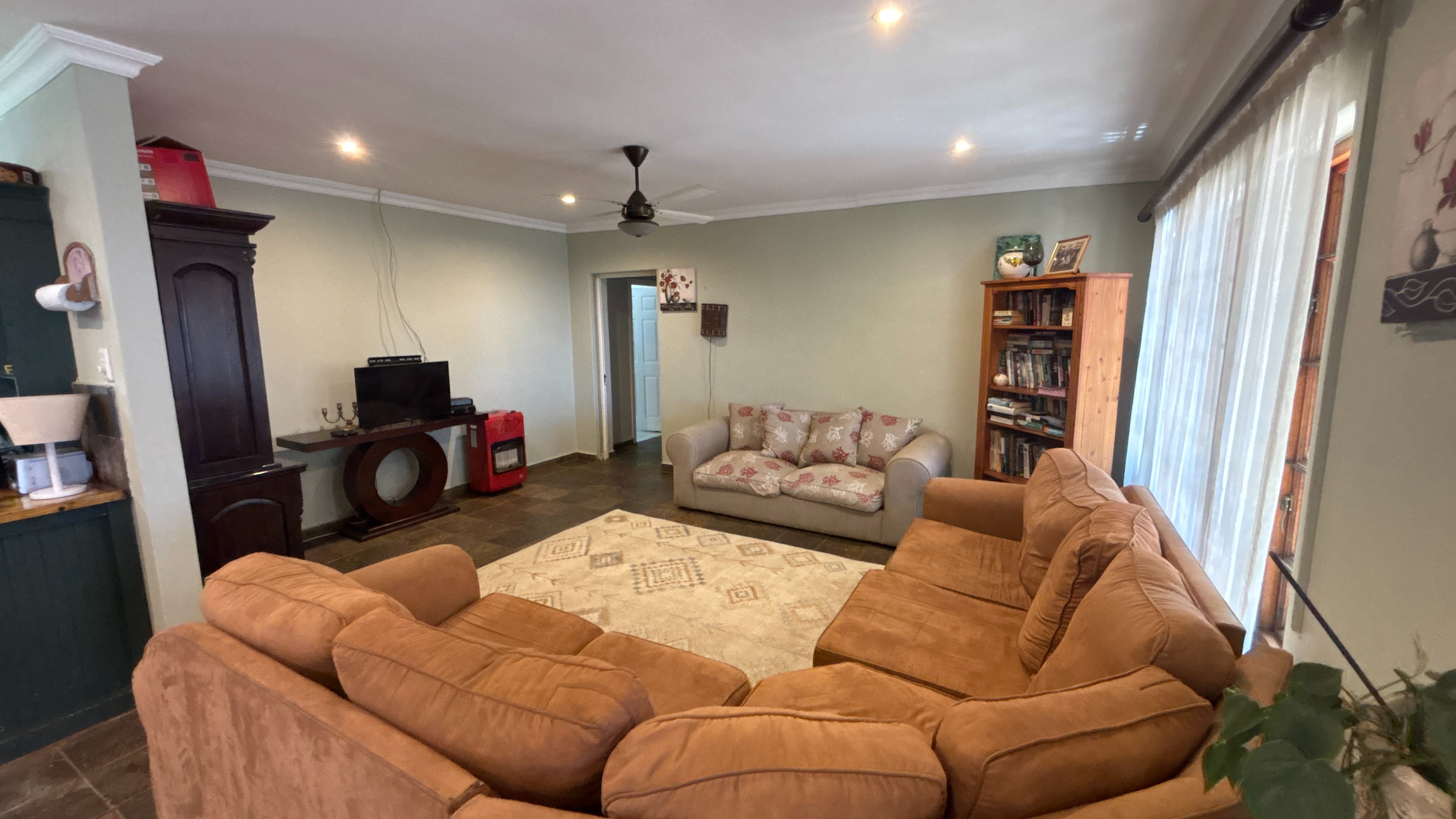 The main house is currently divided into two sections. The first is a comfortable two-bed, two-bath layout. The kitchen has wooden countertops, a standalone oven and a scullery that offers extra storage and workspace. It links well to the rest of the living area, which includes a lounge, a study nook and a breakfast bar. The main bedroom has an ensuite bathroom, and the second bathroom serves as a practical family option. Both bedrooms are a good size, and the overall flow makes this section suitable for day-to-day living.