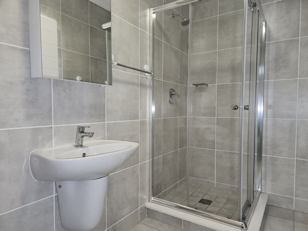 The bedroom, is furnished with a double bed, two side tables, two bedside lamps, linen, and a decorative painting. The bathroom is fitted with a modern shower, completing the apartment’s stylish design.