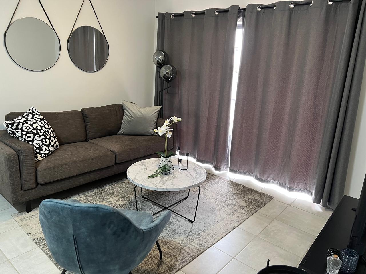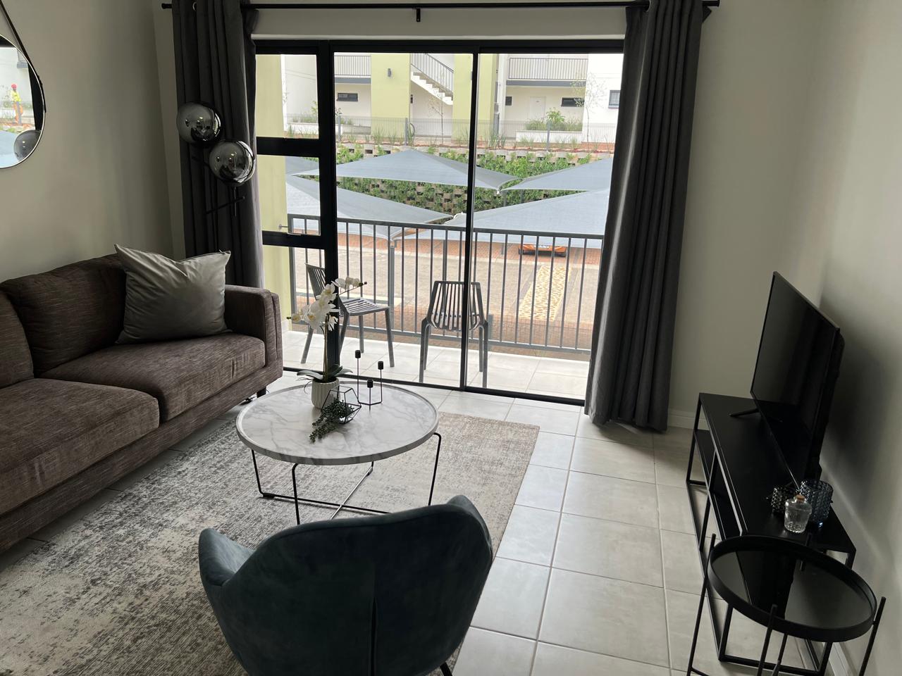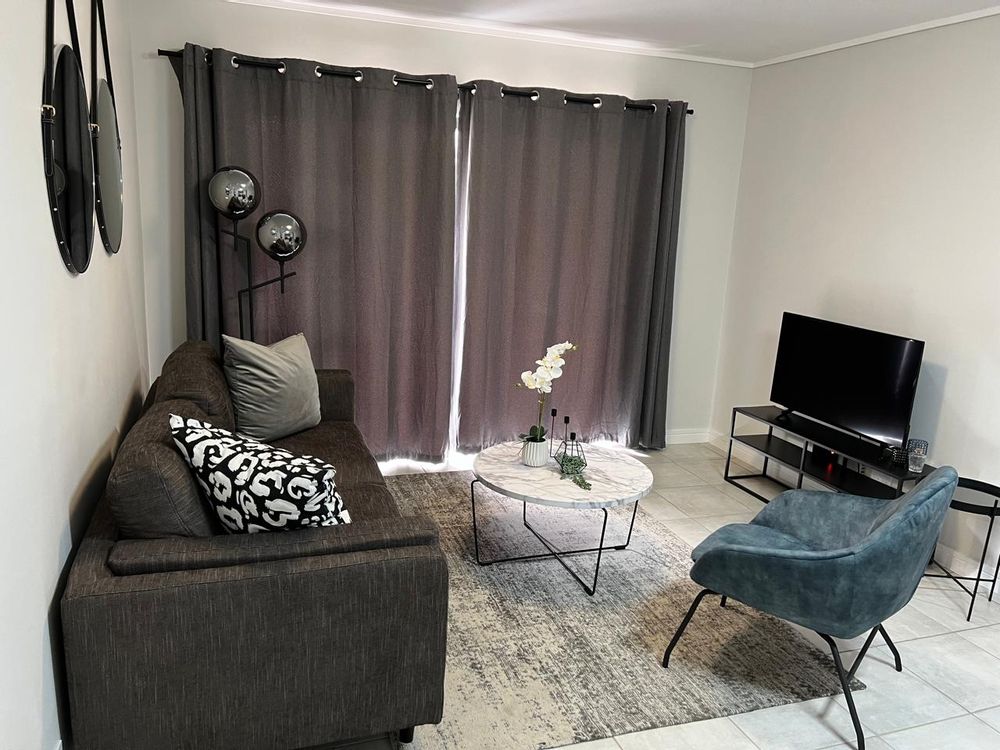 This modern furnished apartment features an open-plan kitchen and lounge area that seamlessly extends to a balcony, providing a perfect space for relaxation. The bedroom is equipped with built-in cupboards, while the main bathroom offers a sleek bathtub and modern shower.