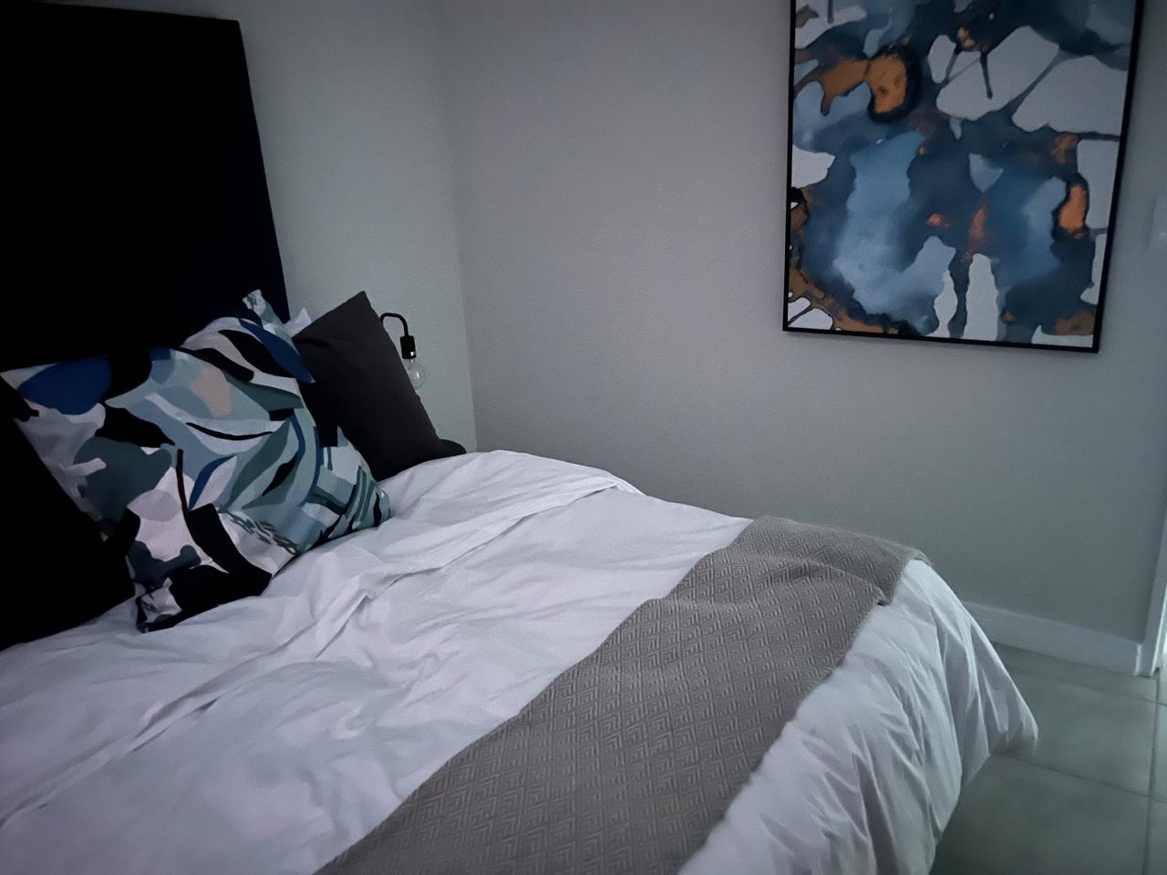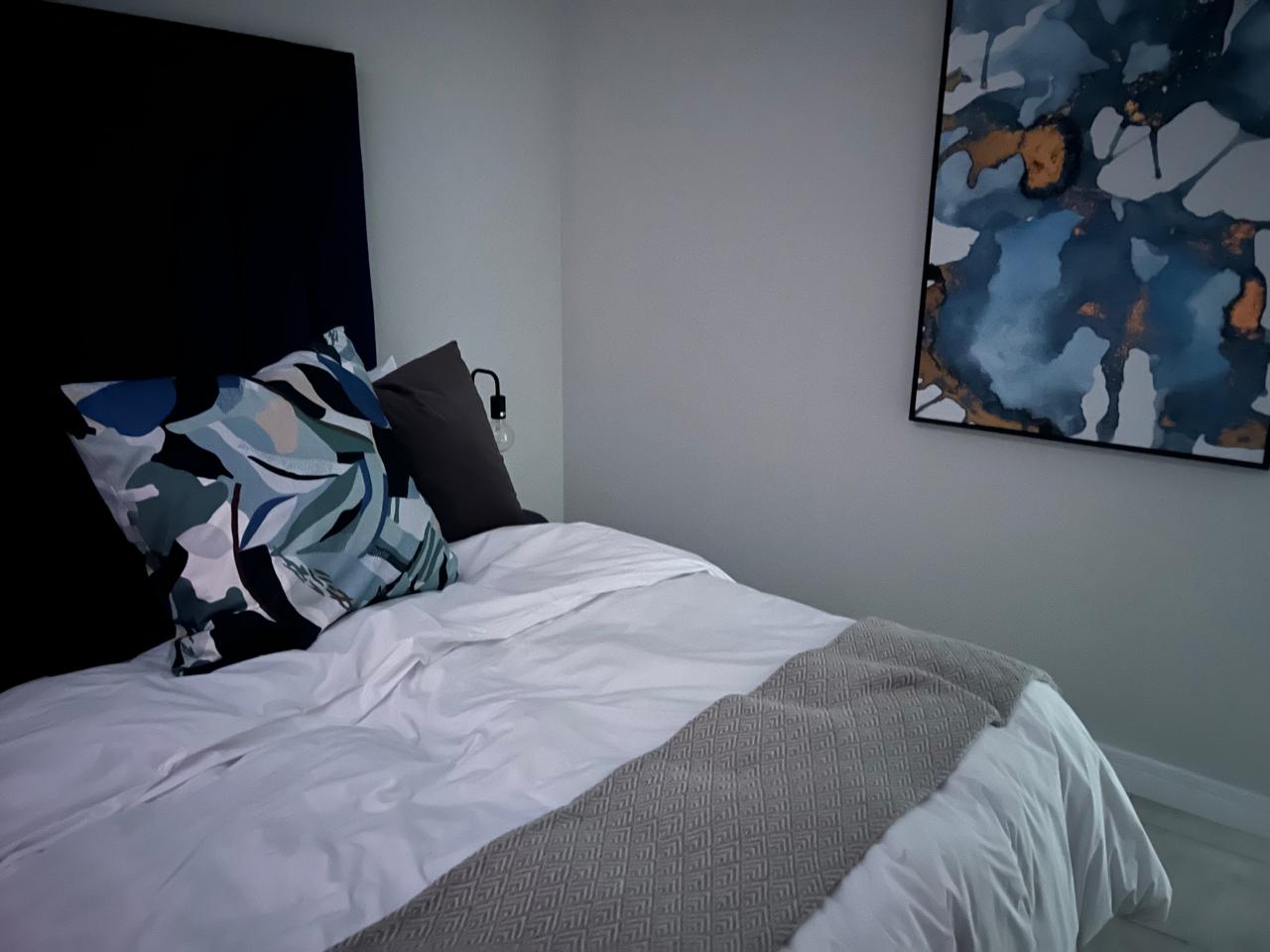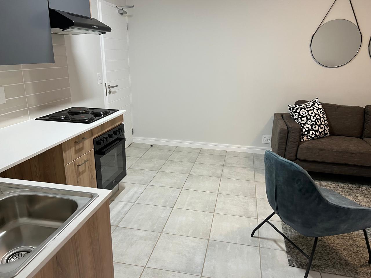 This modern furnished apartment features an open-plan kitchen and lounge area that seamlessly extends to a balcony, providing a perfect space for relaxation. The bedroom is equipped with built-in cupboards, while the main bathroom offers a sleek bathtub and modern shower.