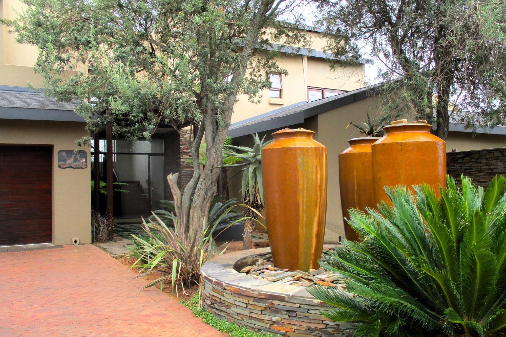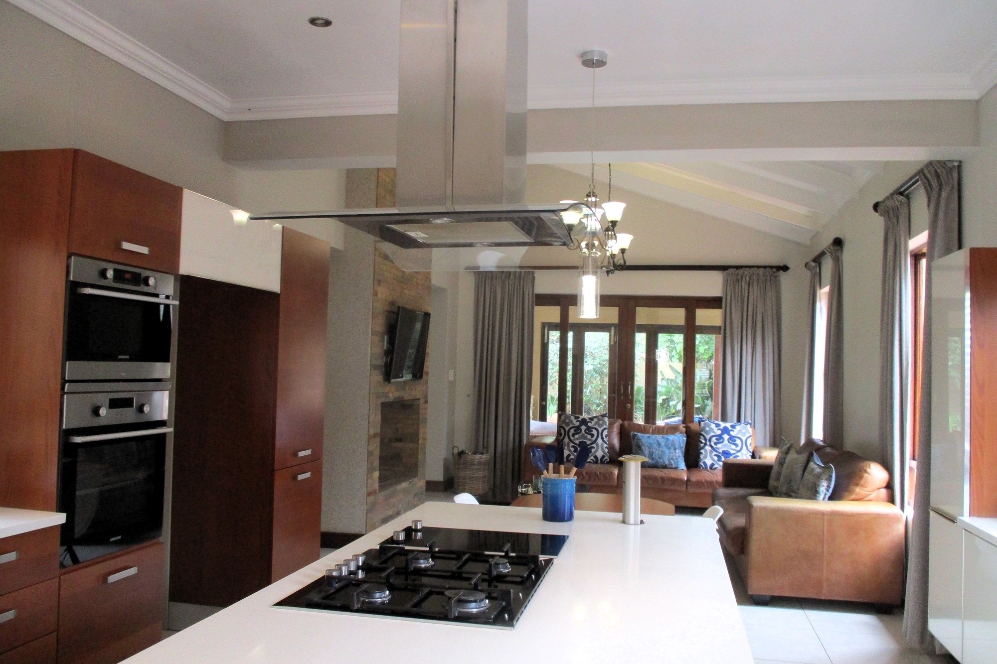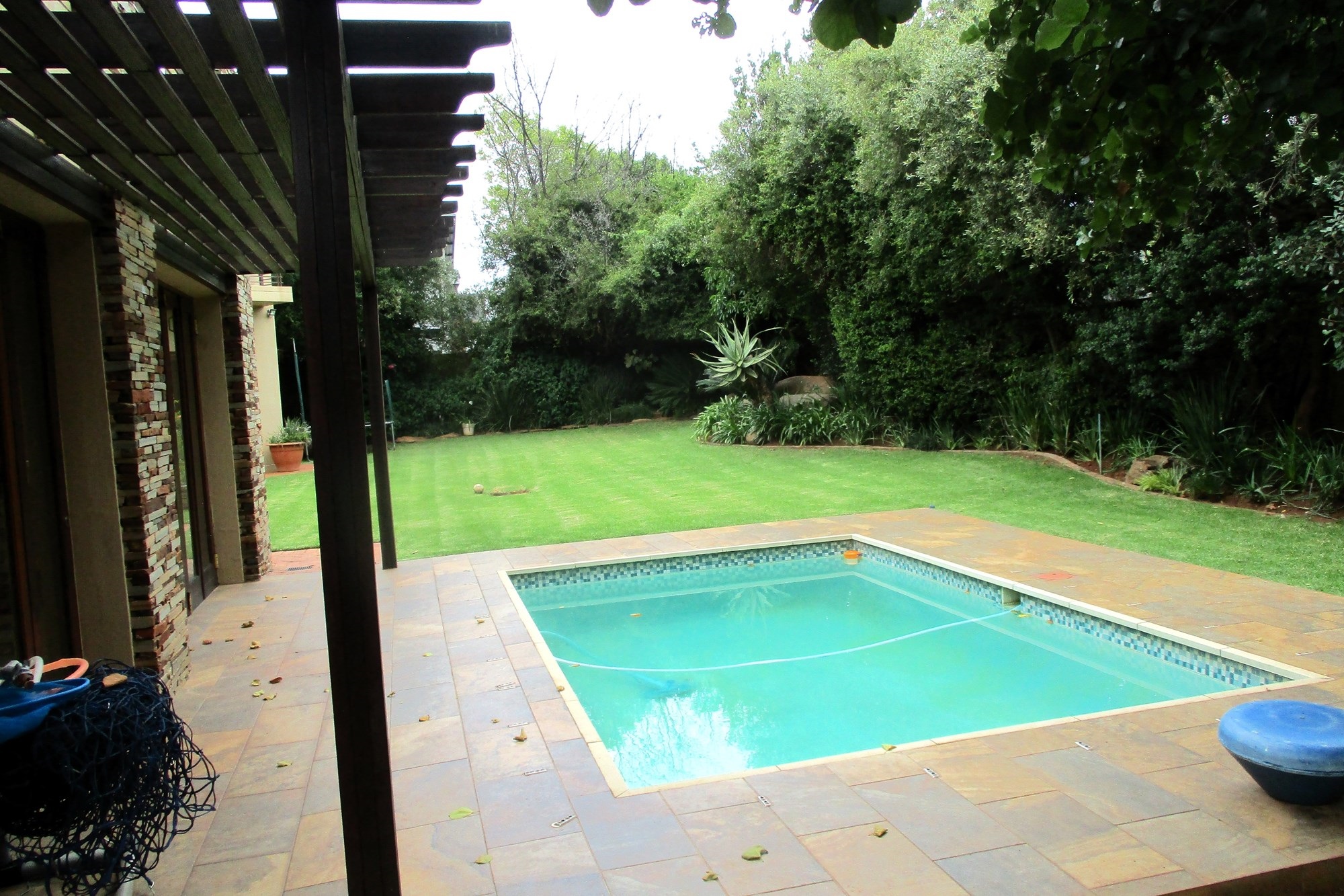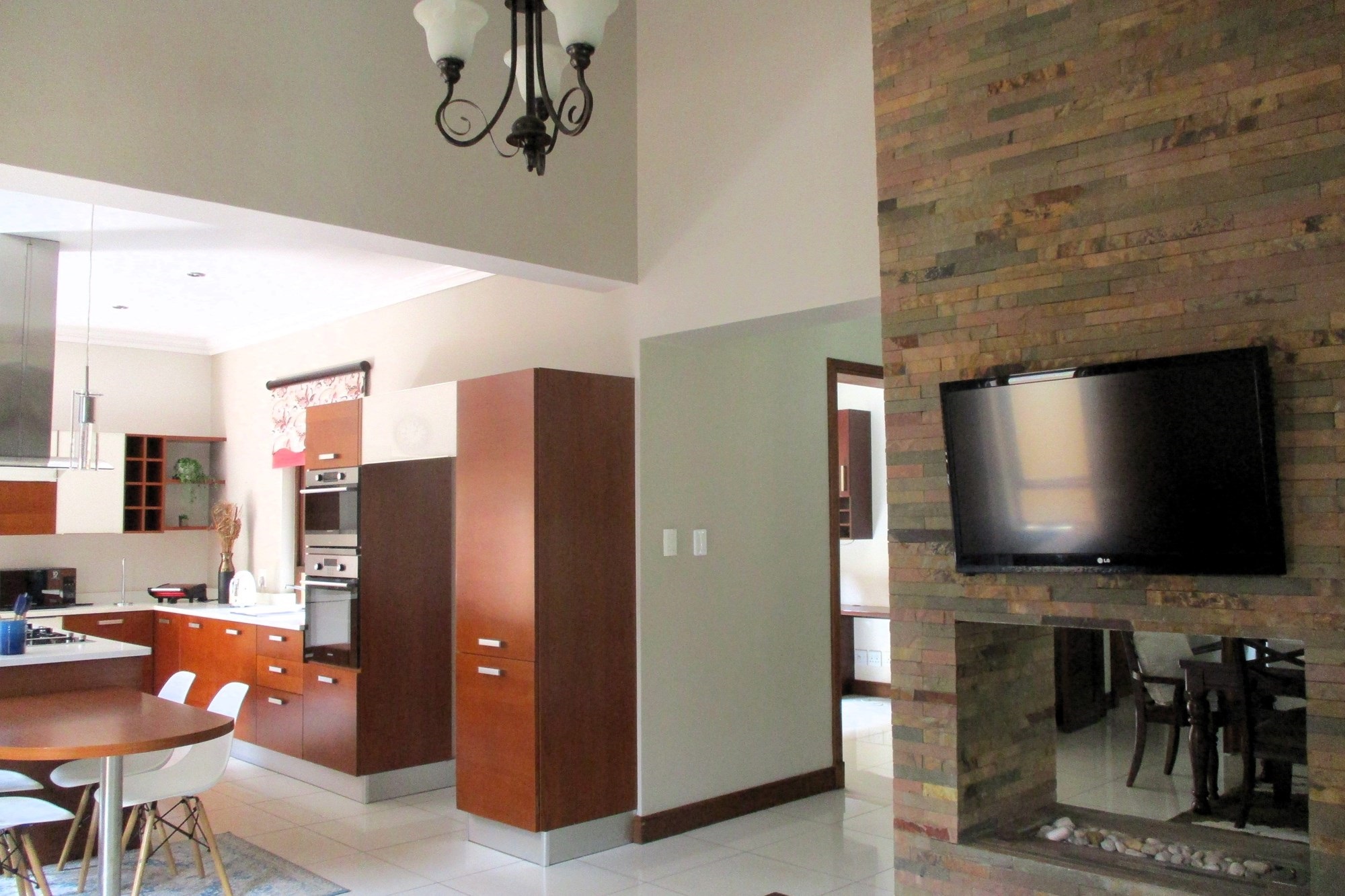 On the ground floor, the main entrance leads to a reception hall with under-stairs storage and stairs. The south wing includes a guest toilet, a double automated wooden door garage with direct entry into the house, and a guest bedroom with a shower, bath and basin. Opening into the garden facing the pool. The east wing features a family room with a wood-heated fireplace opening onto the garden, a lounge with a double-sided gas fireplace, an open-plan kitchen with a scullery, a double sink, dishwasher and washing machine points, island stove with an extractor. The kitchen opens onto an indoor entertainment area with a braai place, leading to the pool and garden.
