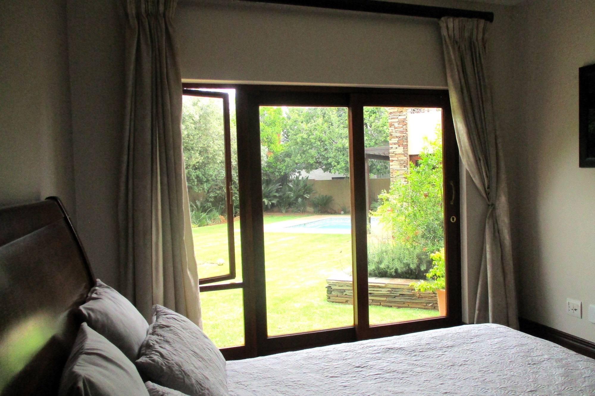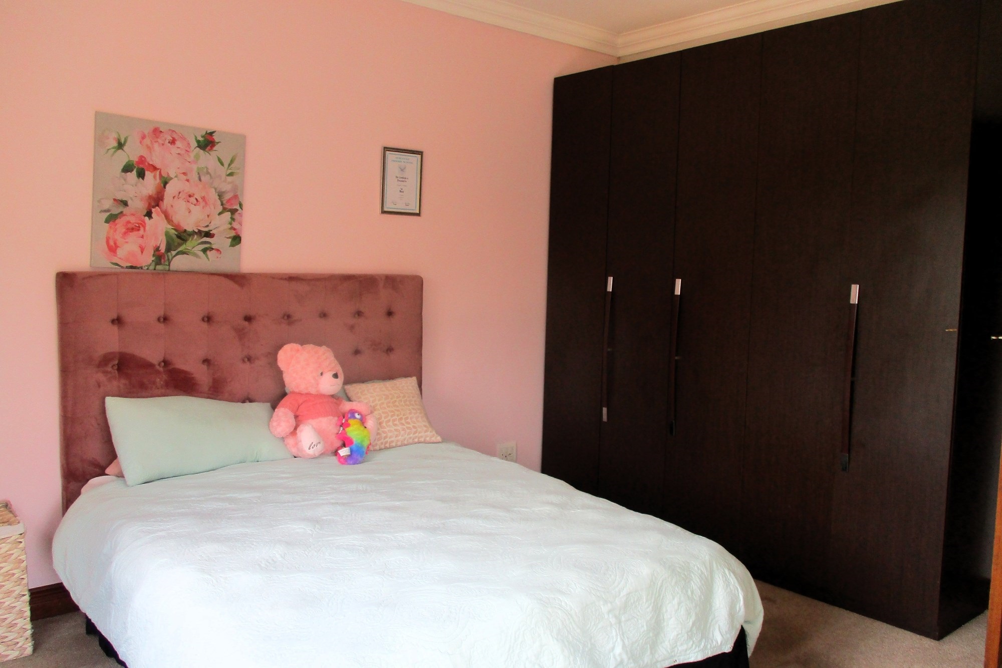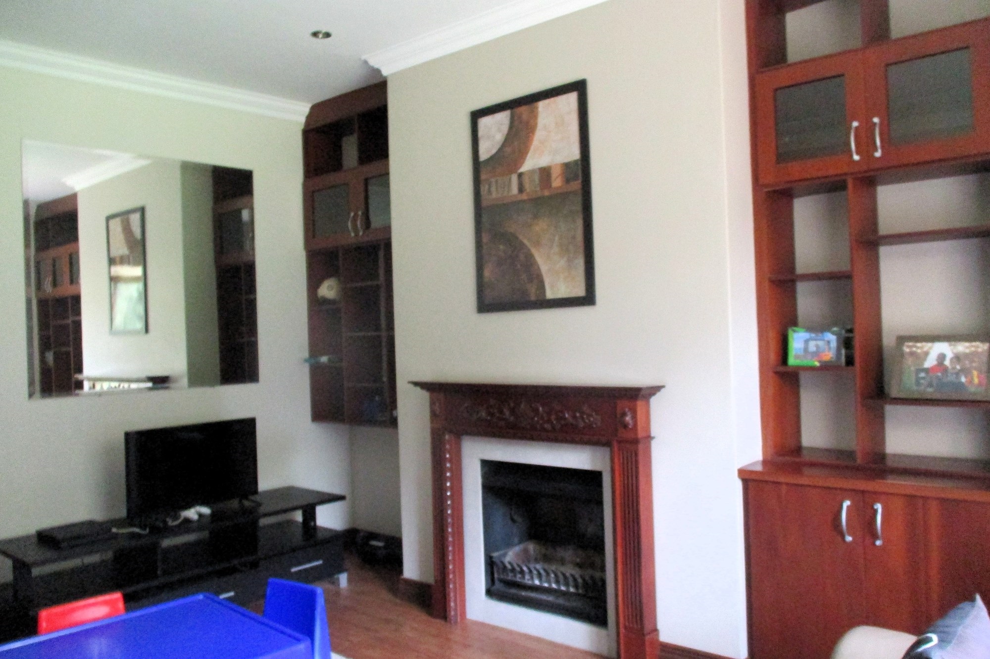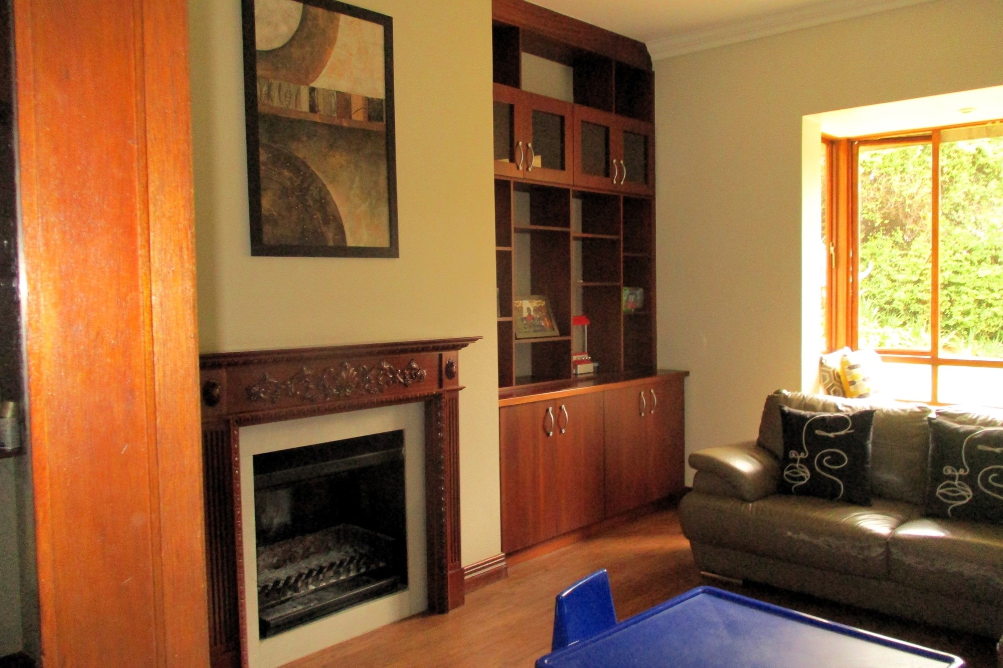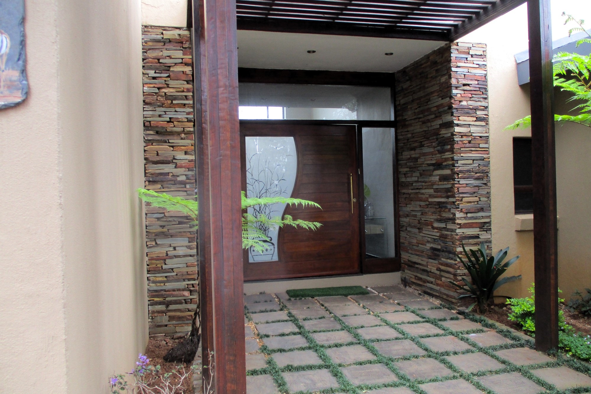 On the ground floor, the main entrance leads to a reception hall with under-stairs storage and stairs. The south wing includes a guest toilet, a double automated wooden door garage with direct entry into the house, and a guest bedroom with a shower, bath and basin. Opening into the garden facing the pool. The east wing features a family room with a wood-heated fireplace opening onto the garden, a lounge with a double-sided gas fireplace, an open-plan kitchen with a scullery, a double sink, dishwasher and washing machine points, island stove with an extractor. The kitchen opens onto an indoor entertainment area with a braai place, leading to the pool and garden.