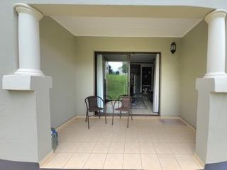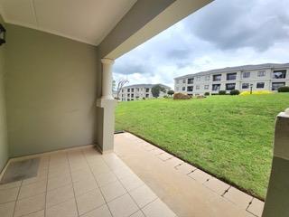 The apartment features a sleek open-plan kitchen with a stylish breakfast counter, flowing effortlessly into a sunlit lounge complete with a dedicated study nook, ideal for a refined work-from-home setup. The lounge opens onto a patio overlooking a lush communal garden, creating a tranquil indoor-outdoor living experience.