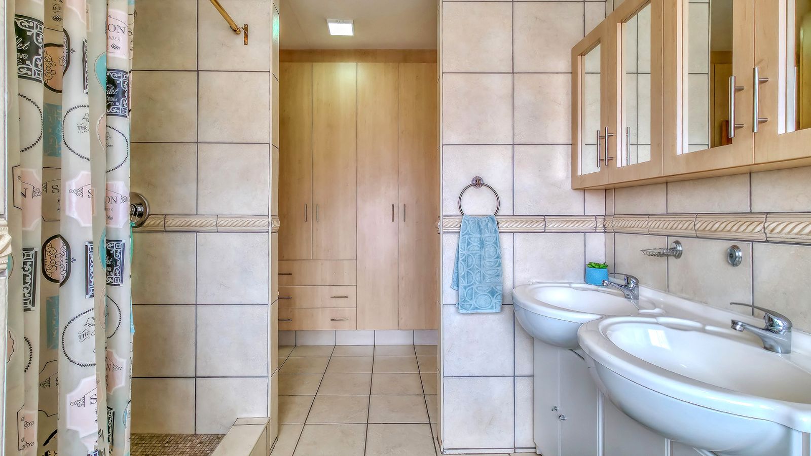 * Luxurious main bathroom with a corner bath, double vanity, shower and toilet.