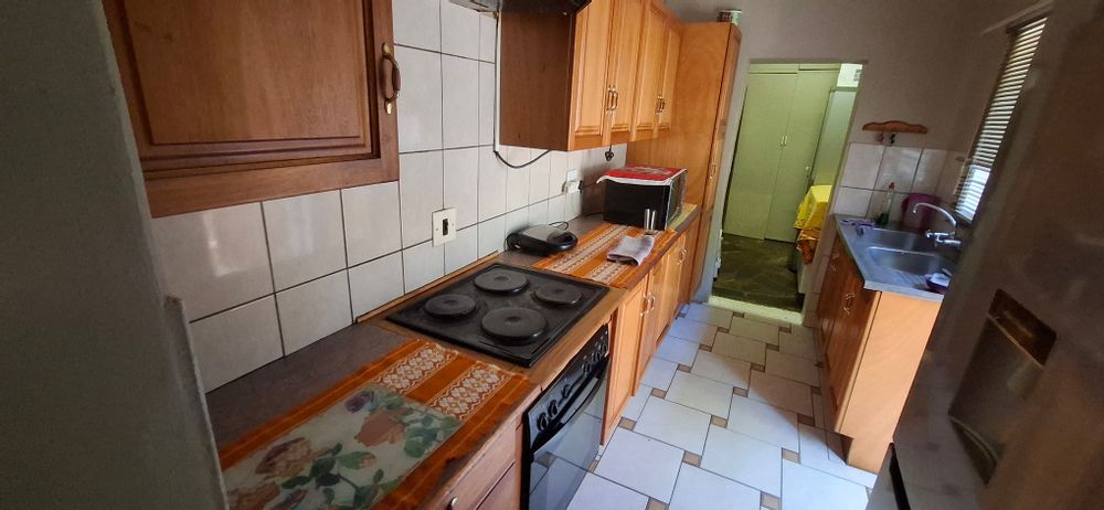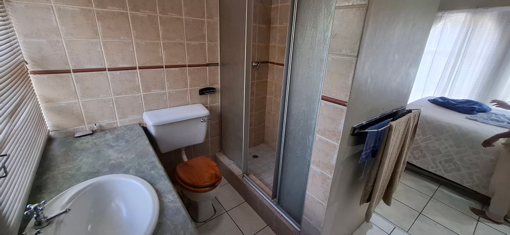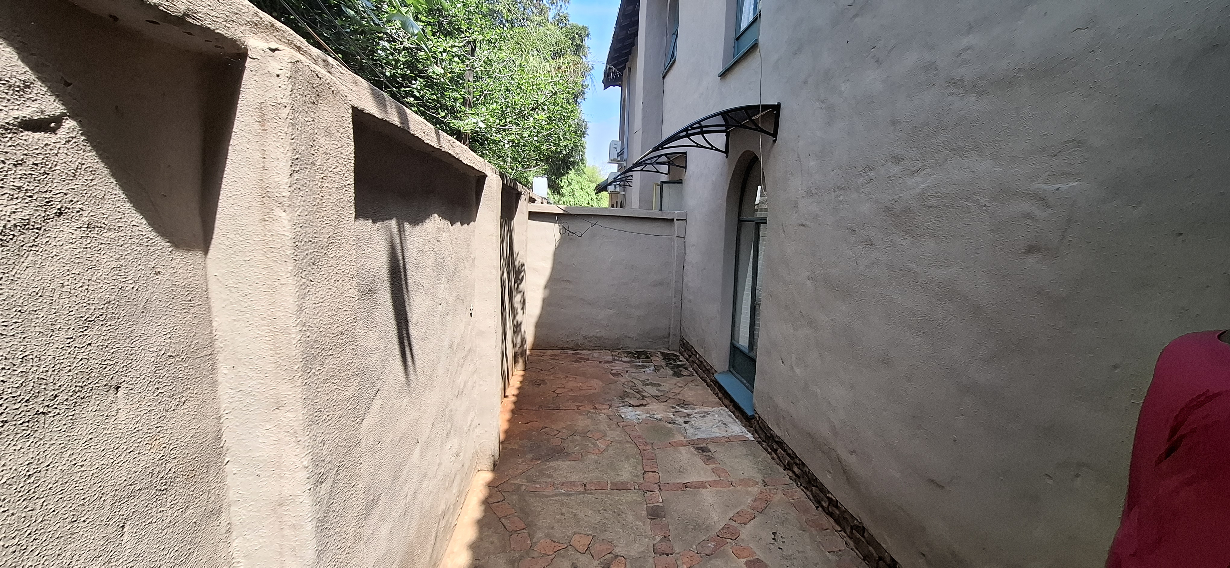 Excellent location! Very spacious and private duplex townhouse designed in a Spanish style. Separate entrance from the street, not inside a complex. Private walled garden with a built-in braai (barbecue), covered patio with security gates, spacious open-plan living area, kitchen, and separate laundry room. Separate TV room, study or fourth bedroom, and guest toilet on the ground floor. Three bedrooms with two bathrooms on the upper floor. Outside storeroom. Truly a very comfortable and pleasant home — all that’s missing is some gardening.