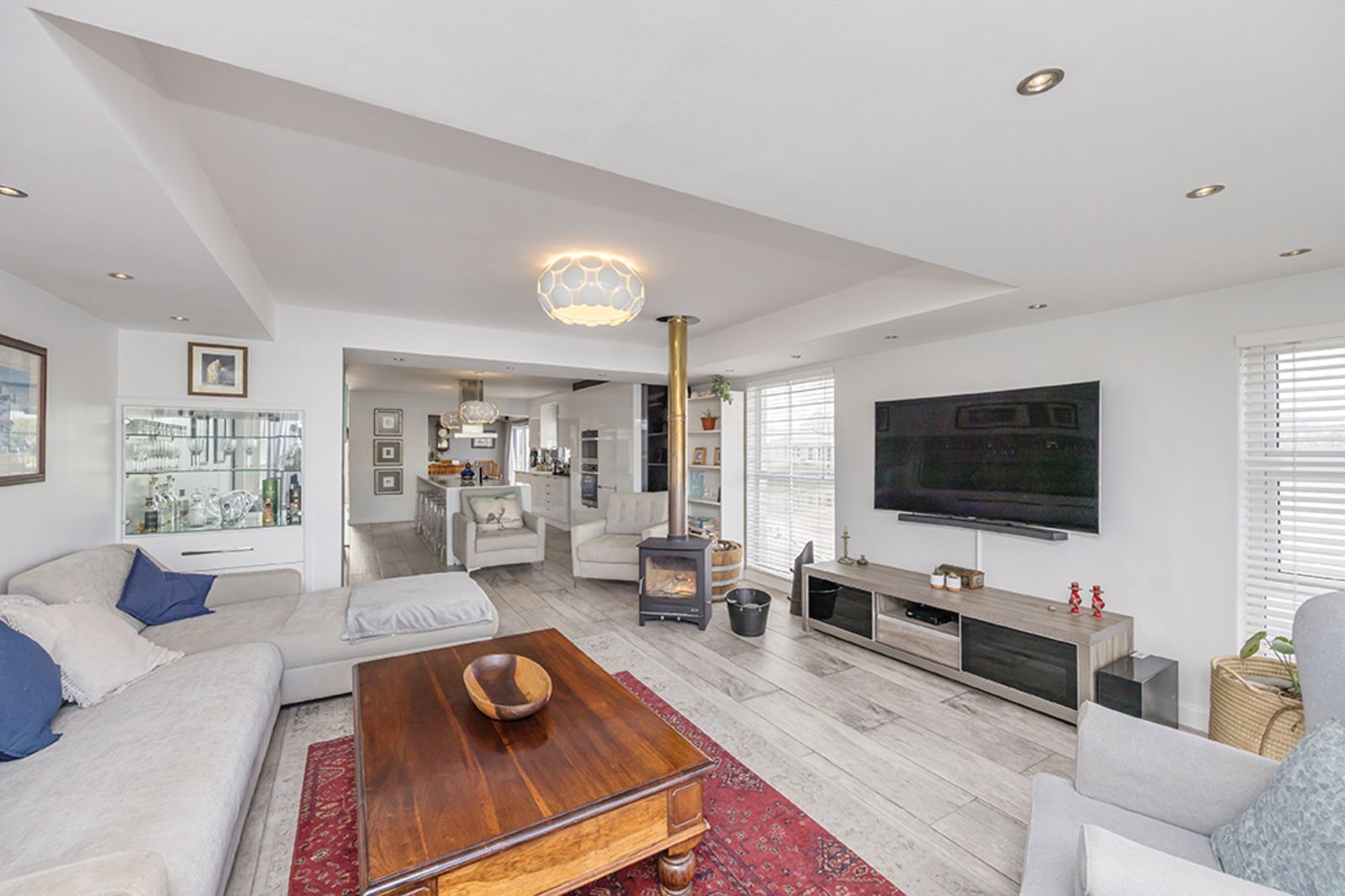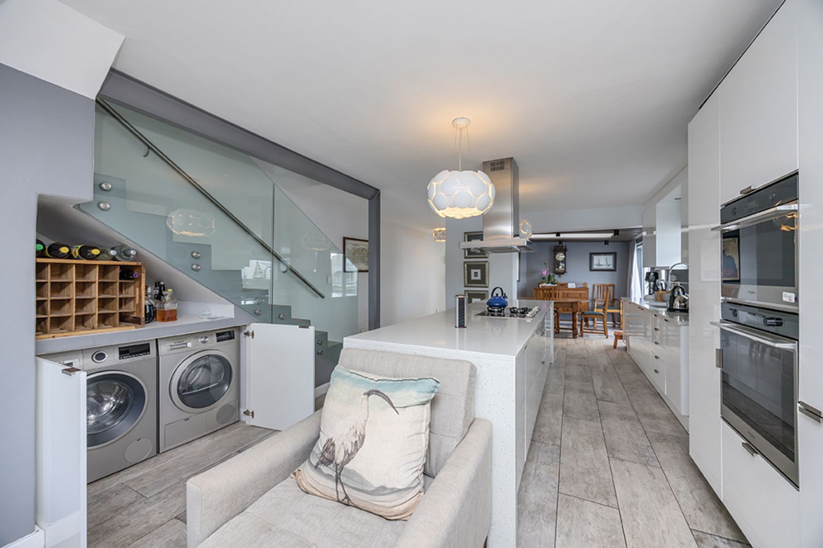 - The modern kitchen offers high-gloss white cabinetry, granite worktops, and integrated Whirlpool appliances including fridge/freezer, eye-level oven, microwave, and dishwasher. Gas and electric hob combo with extractor fan. Space for washing machine and tumble dryer.