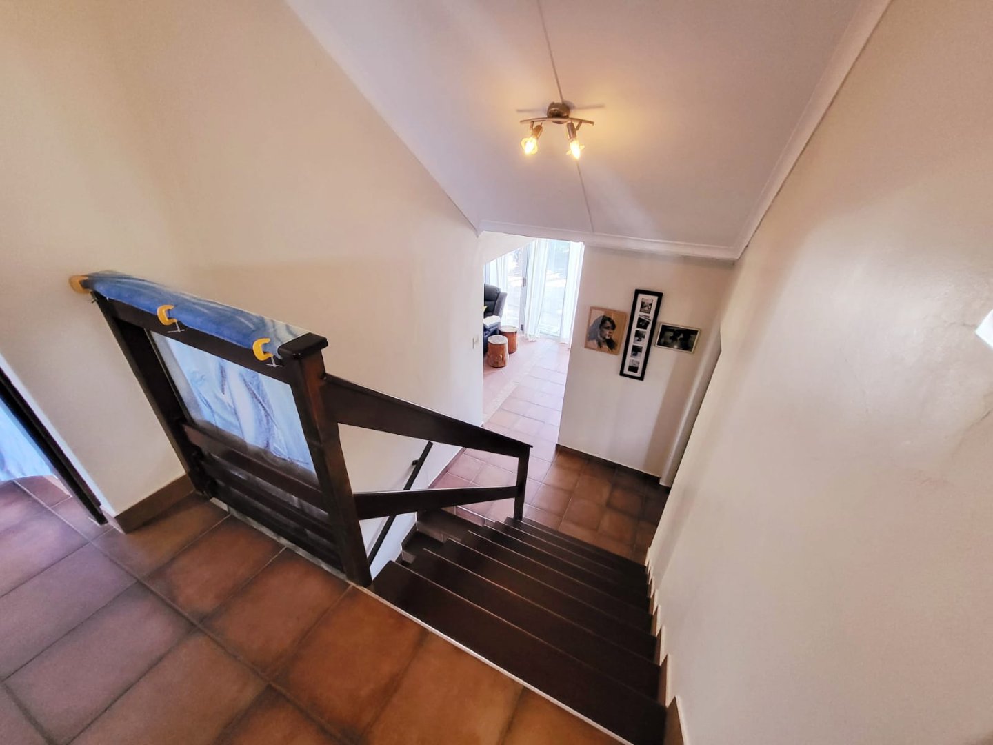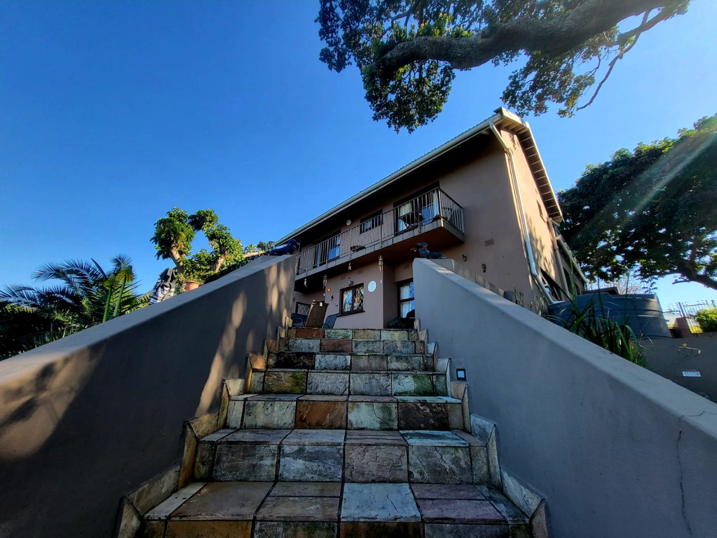 Stairs lead down to the large laundry which has a door opening to the courtyard with wash line, outside shower and water tank. There is also a bathroom on this level. Up a flight of stairs (split level) the main bedroom with en-suite bathroom plus the family room which has stacker doors opening to the back yard. Another short flight of stairs lead to the 2nd and 3rd bedroom which both have doors opening to the balcony with ocean views, another bathroom services this floor.