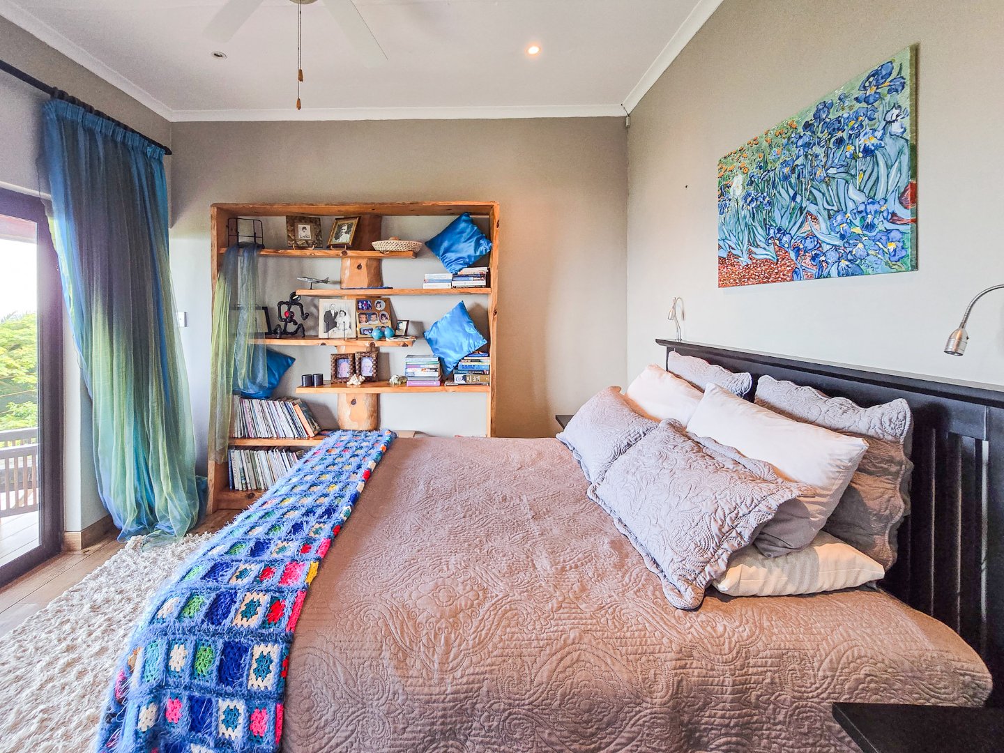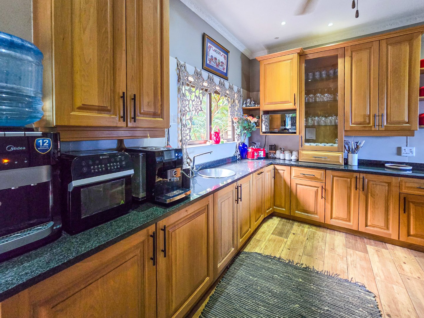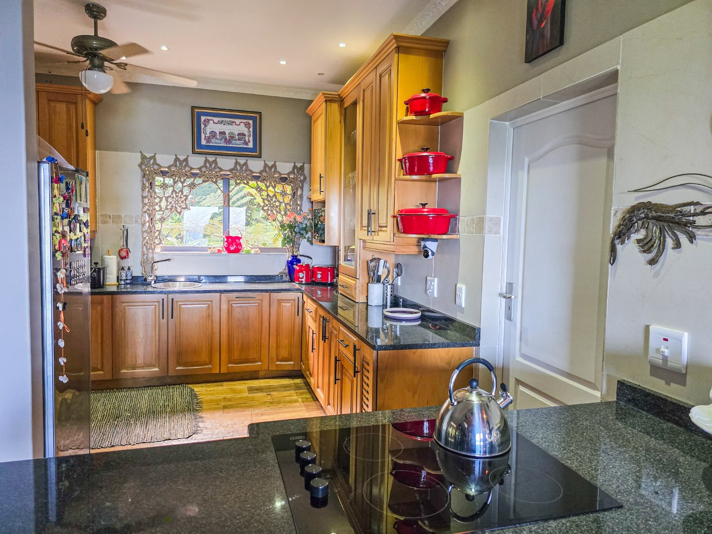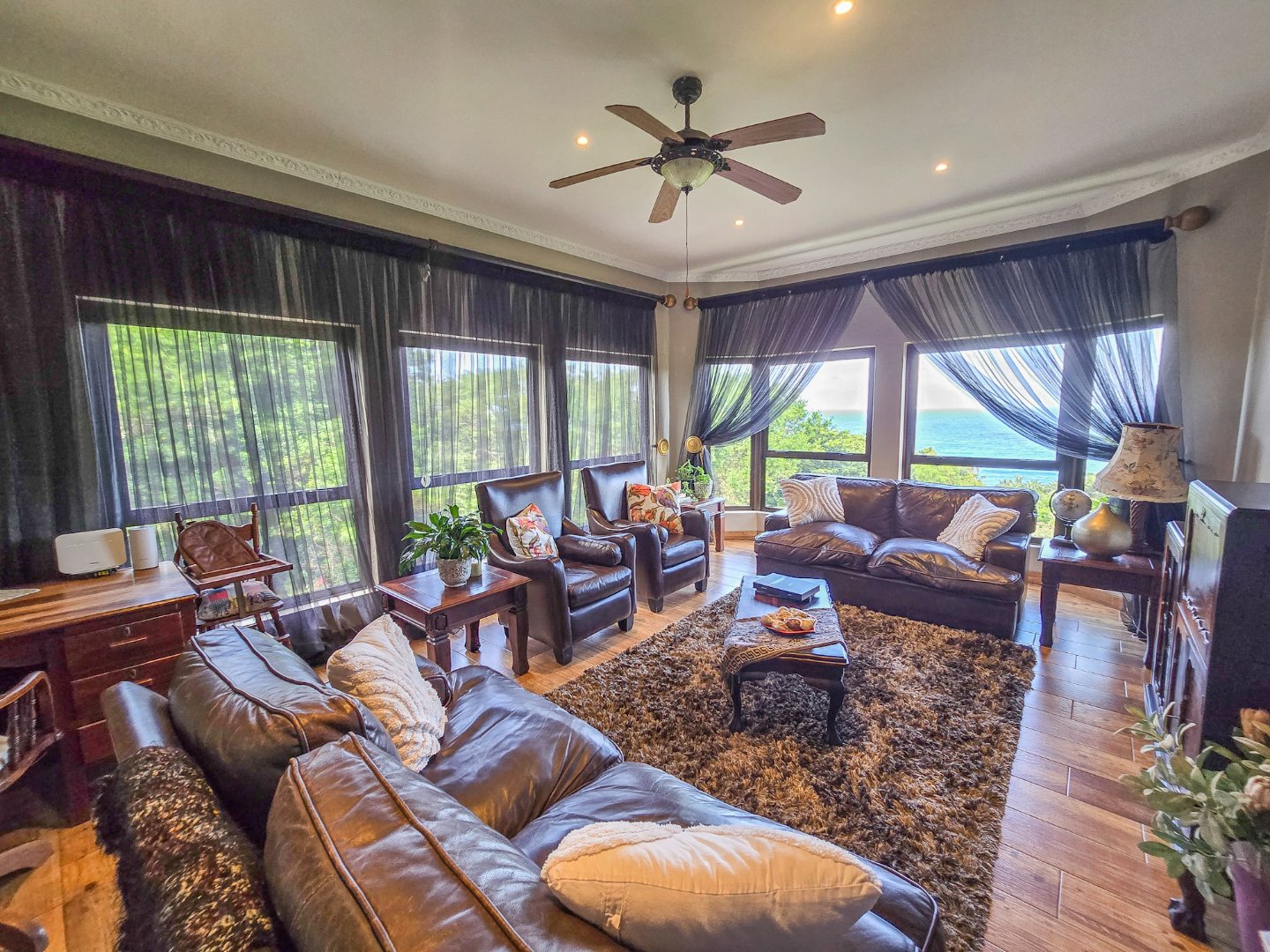 The open-plan living area is located on the middle level. There are two lounges on this level. The dining area and lounge leads to the covered patio and pool area via stack doors. The kitchen features granite countertops, a hob, undercounter electric oven, a fan, and a large laundry room with a scullery for added convenience. There is an office on this level as well. A third lounge, currently utilized as an office, is situated upstairs with its own balcony and sea views.