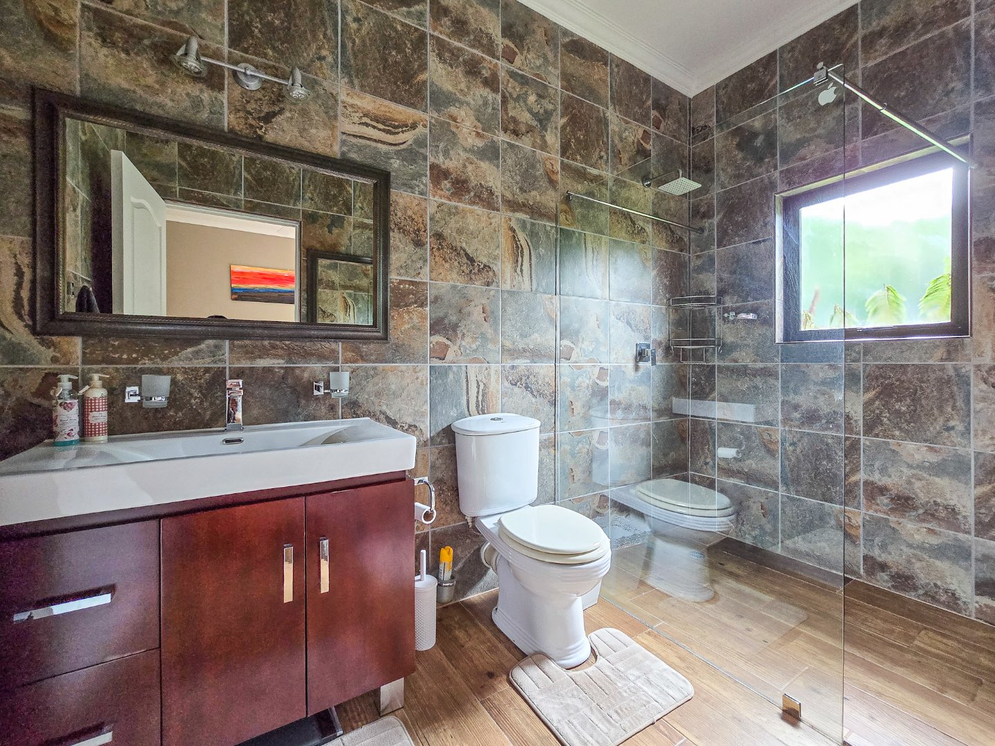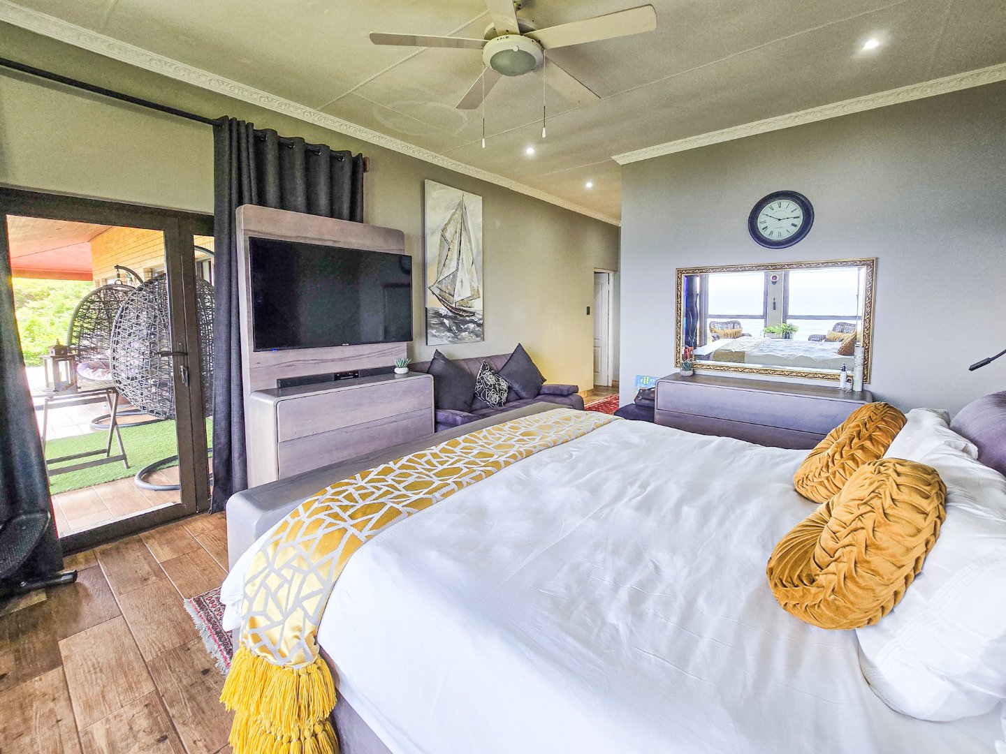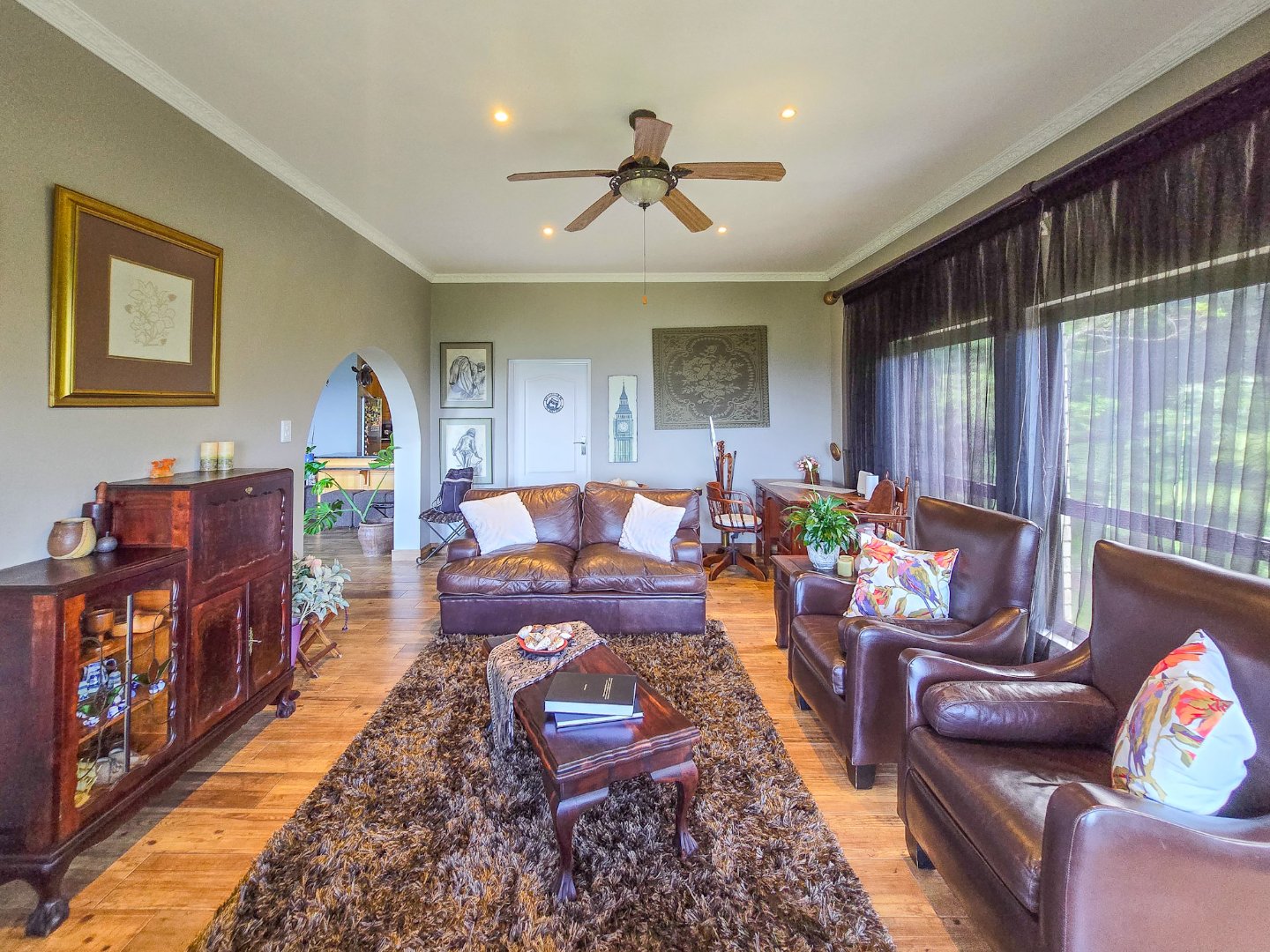 The open-plan living area is located on the middle level. There are two lounges on this level. The dining area and lounge leads to the covered patio and pool area via stack doors. The kitchen features granite countertops, a hob, undercounter electric oven, a fan, and a large laundry room with a scullery for added convenience. There is an office on this level as well. A third lounge, currently utilized as an office, is situated upstairs with its own balcony and sea views.