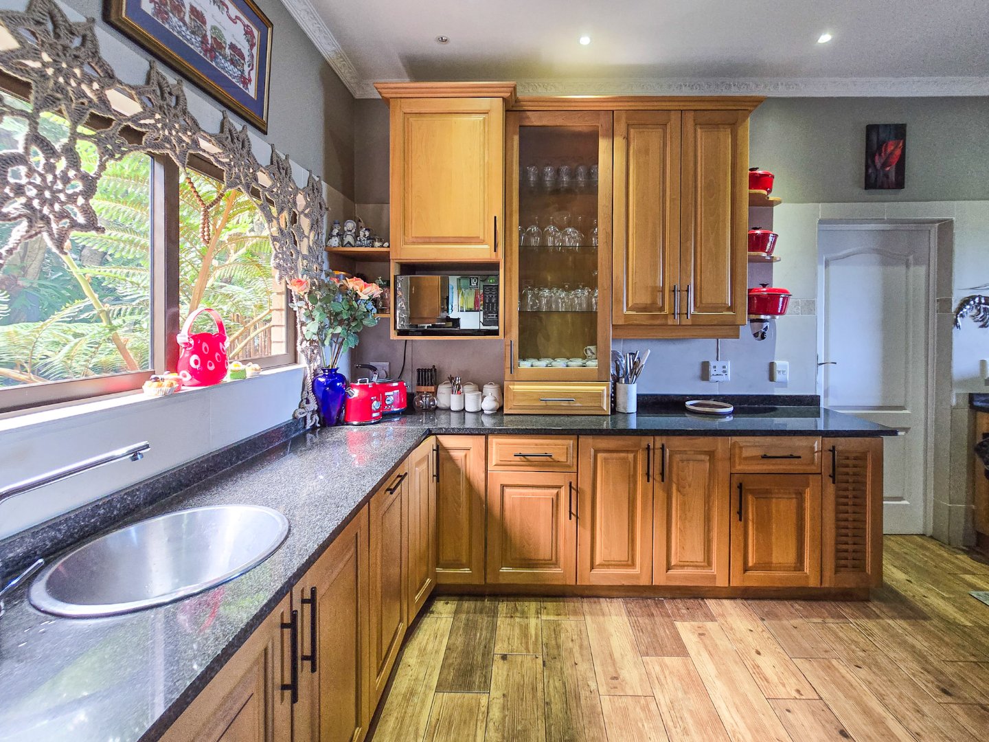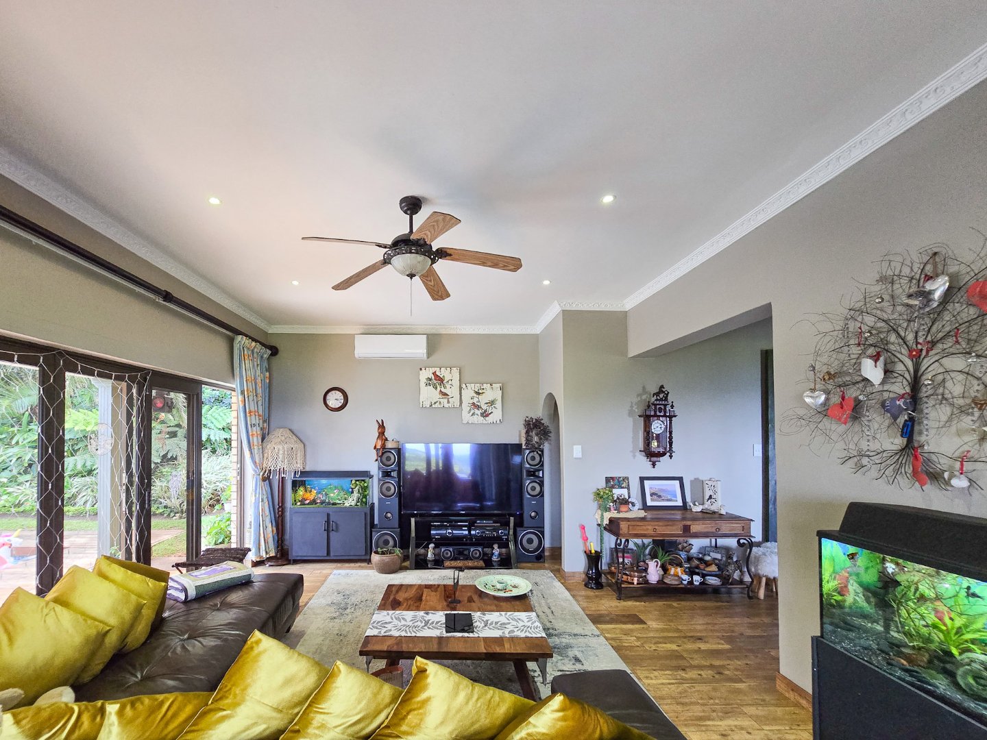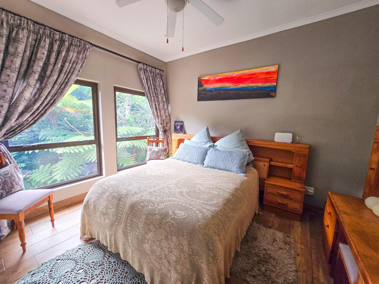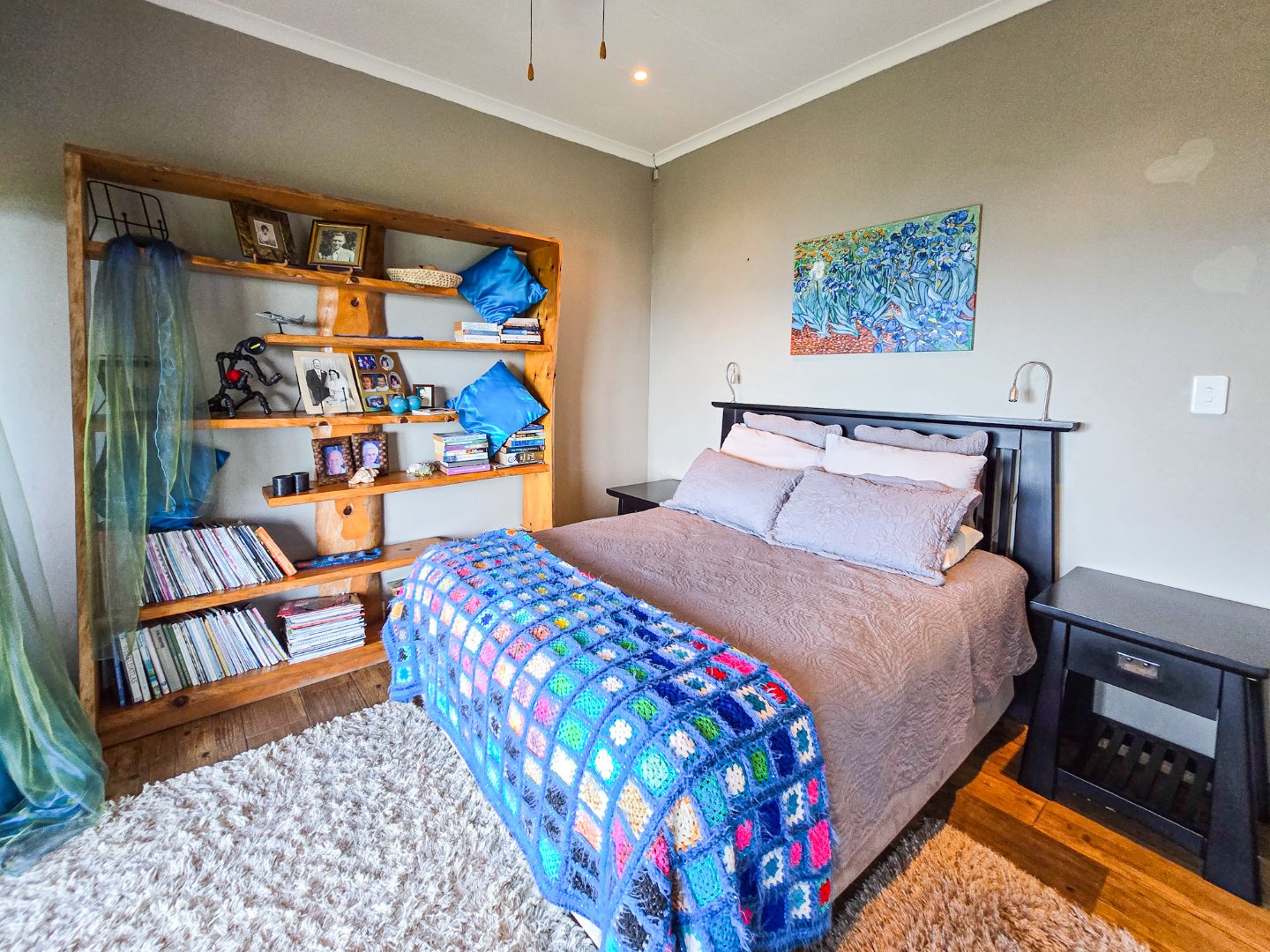 The open-plan living area is located on the middle level. There are two lounges on this level. The dining area and lounge leads to the covered patio and pool area via stack doors. The kitchen features granite countertops, a hob, undercounter electric oven, a fan, and a large laundry room with a scullery for added convenience. There is an office on this level as well. A third lounge, currently utilized as an office, is situated upstairs with its own balcony and sea views.