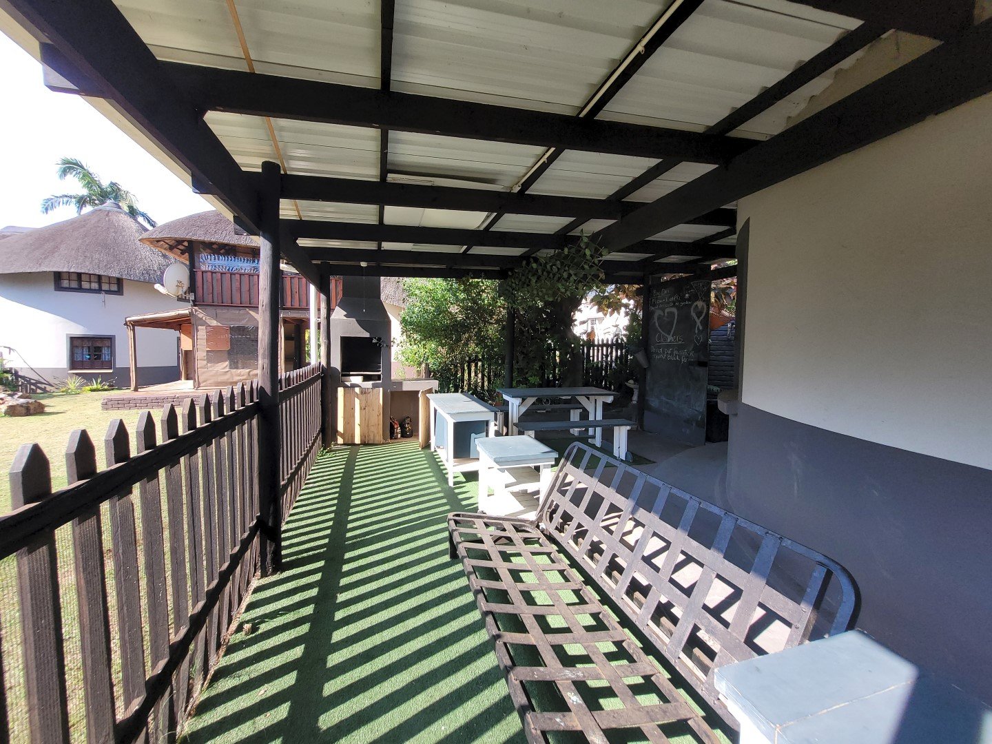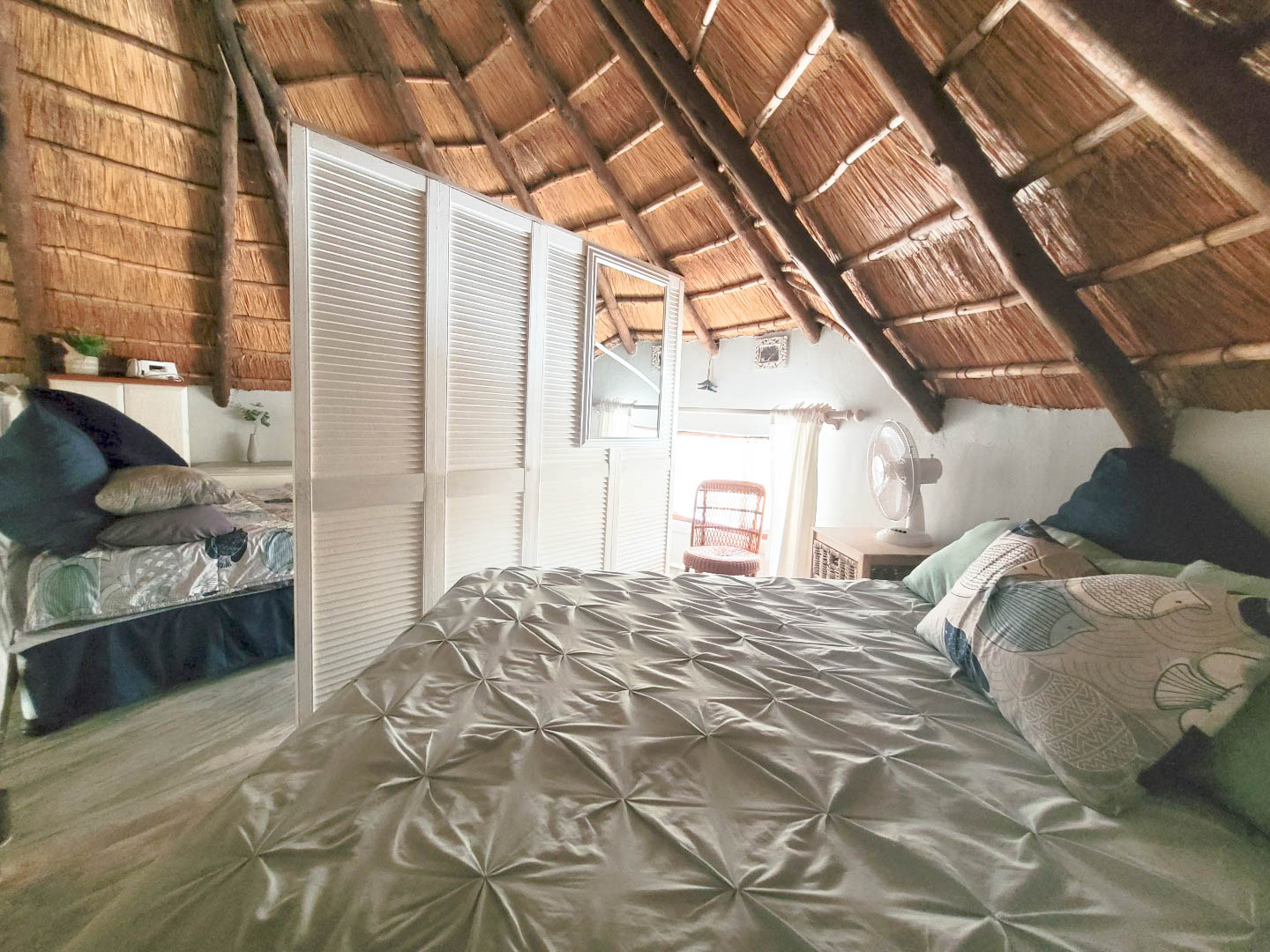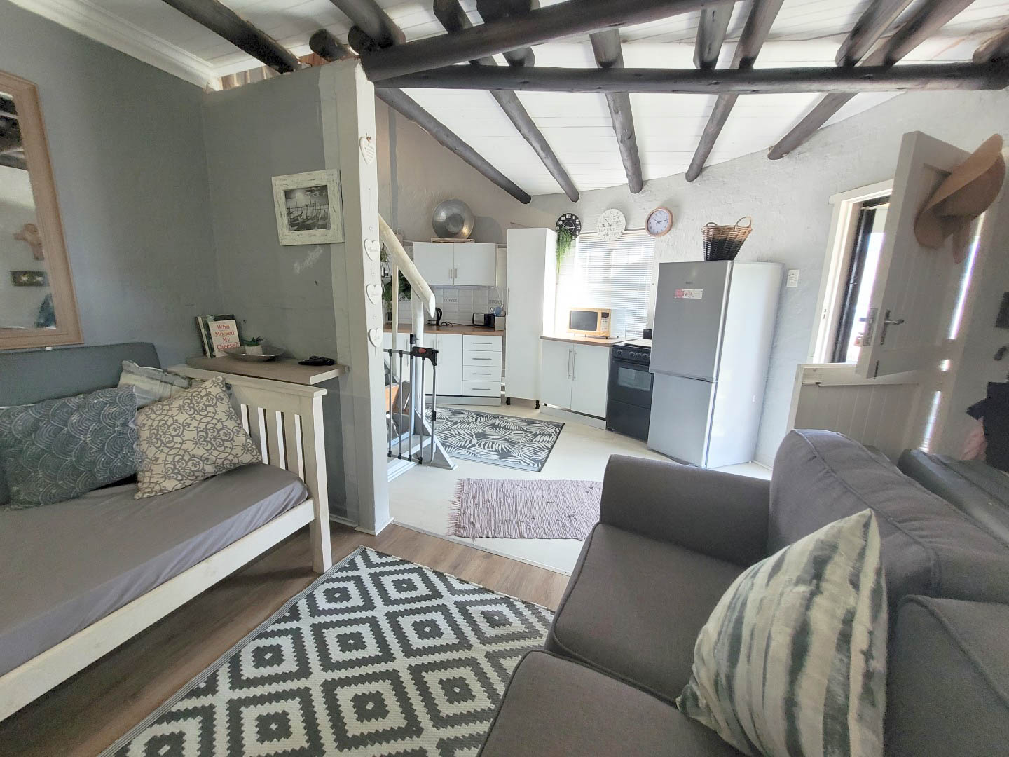 The unit consist of the loft that accommodates 2 x double beds and 1 3/4 bed. There is a room divider to give each other privacy. The neat bathroom has a shower, toilet and basin. There is also an open plan lounge and very well-appointed kitchen. The owners have also made a covered patio which is perfect for friends and family to enjoy lazy days having braais.