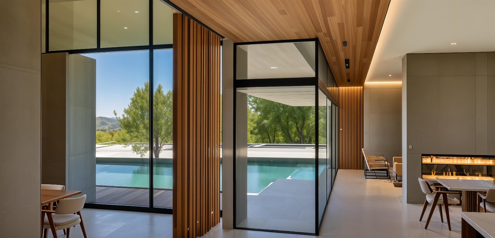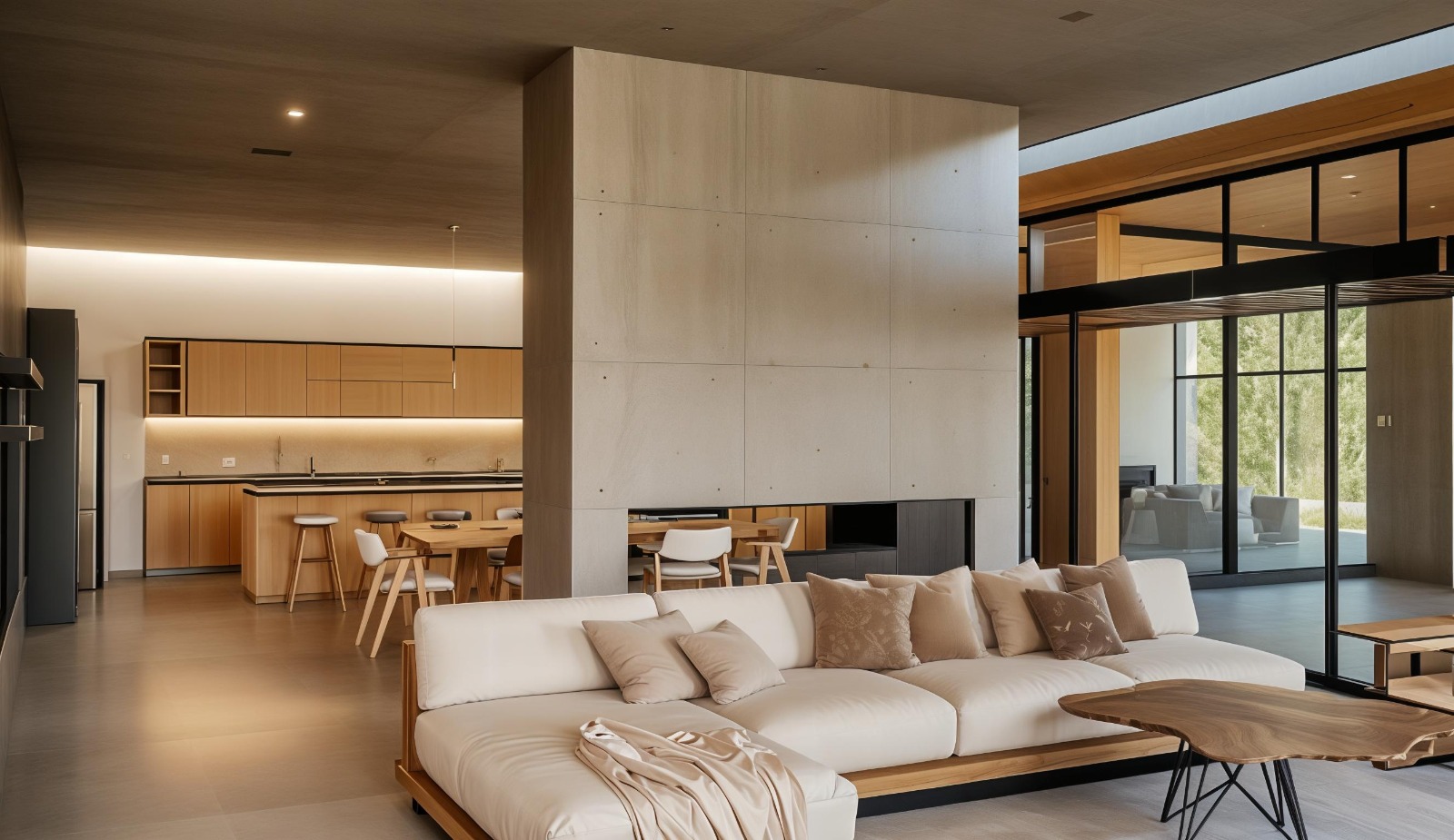 At its heart, a spacious open-plan living area seamlessly connects the TV lounge, dining room, and designer kitchen. Striking exposed beams bring architectural character, while a sleek fireplace creates a warm, inviting focal point. Expansive stacker doors open to a fully enclosed patio, bathing the space in natural light and offering the ultimate setting for year-round entertaining.